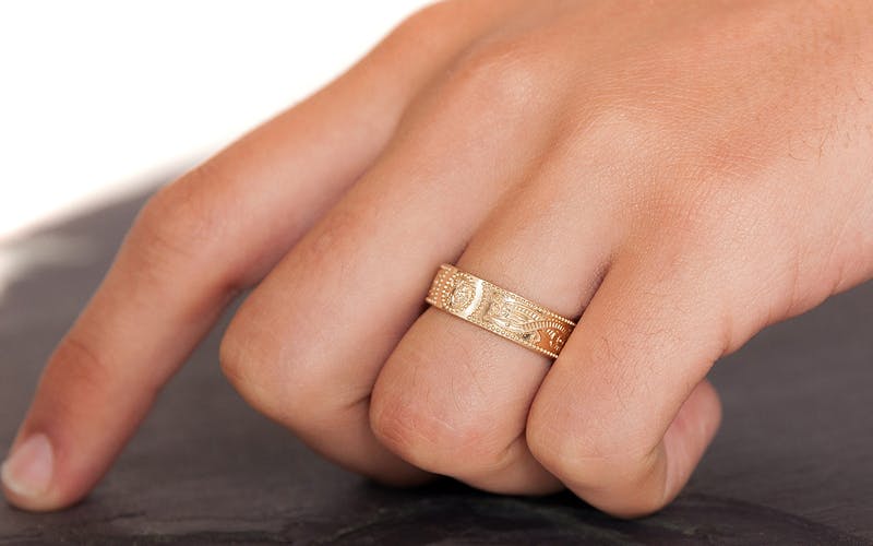 But you needn't be married to sport a ring. Signet rings are another timeless ring style for men and one imbued with status and significance over the centuries. Known as “the gentleman's ring," a signet made of rich gold or weighty sterling silver bearing the coat of arms of the family name, or one set with stone, are accessories that can be worn daily.