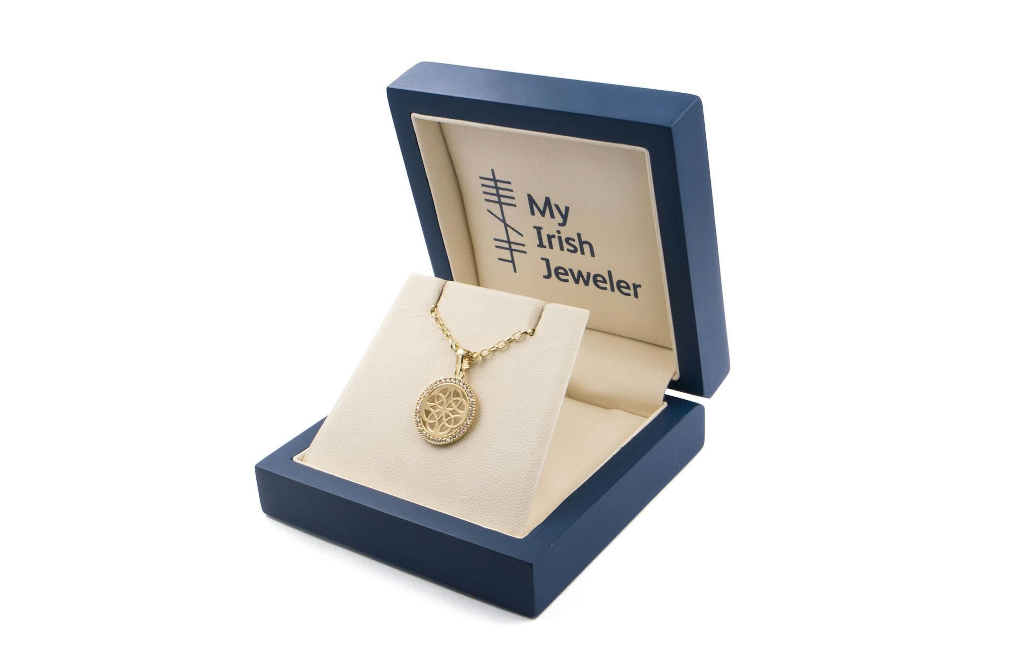 A halo of sparkling CZ stones set in 10k Gold embraces an iconic Celtic Shield Knot in this delightful necklace. The milgrain edge adds a vintage feel while the the four intricate and interconnected Trinity Knots of the Shield design add a deep symbolism to this stunning piece.