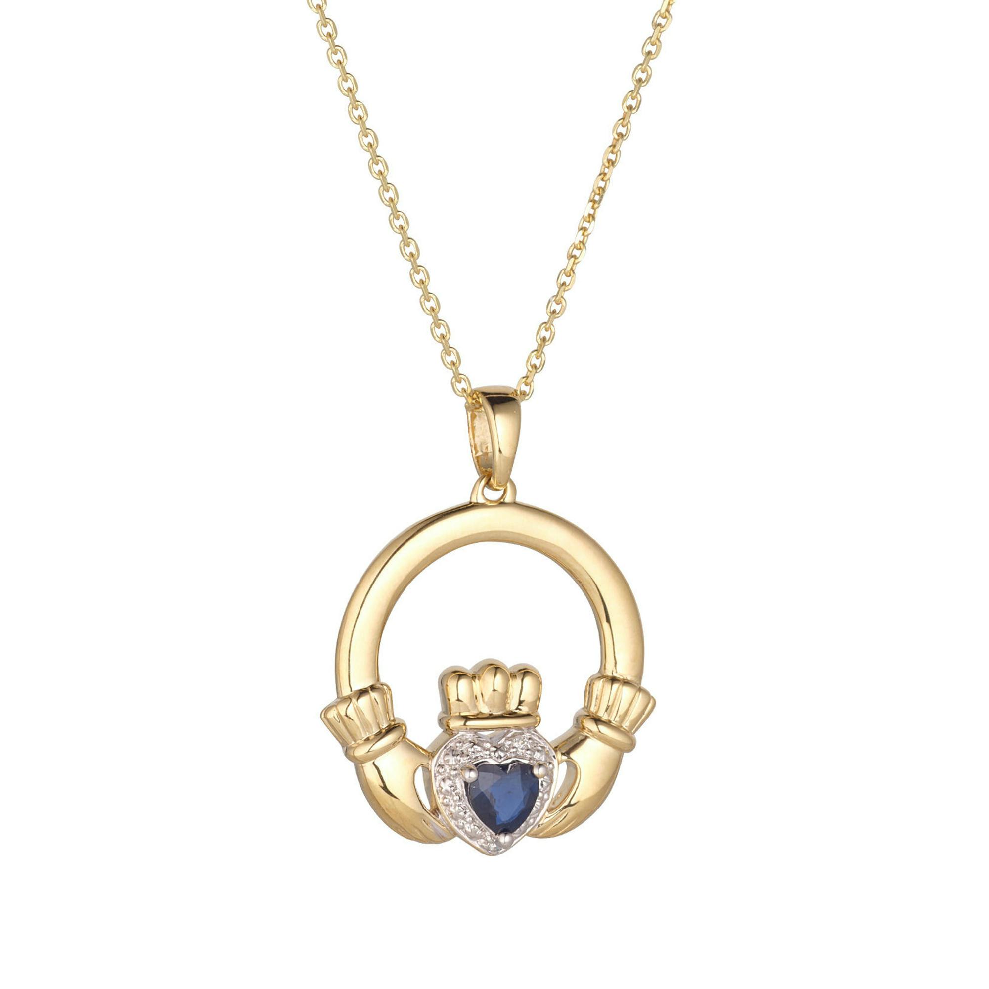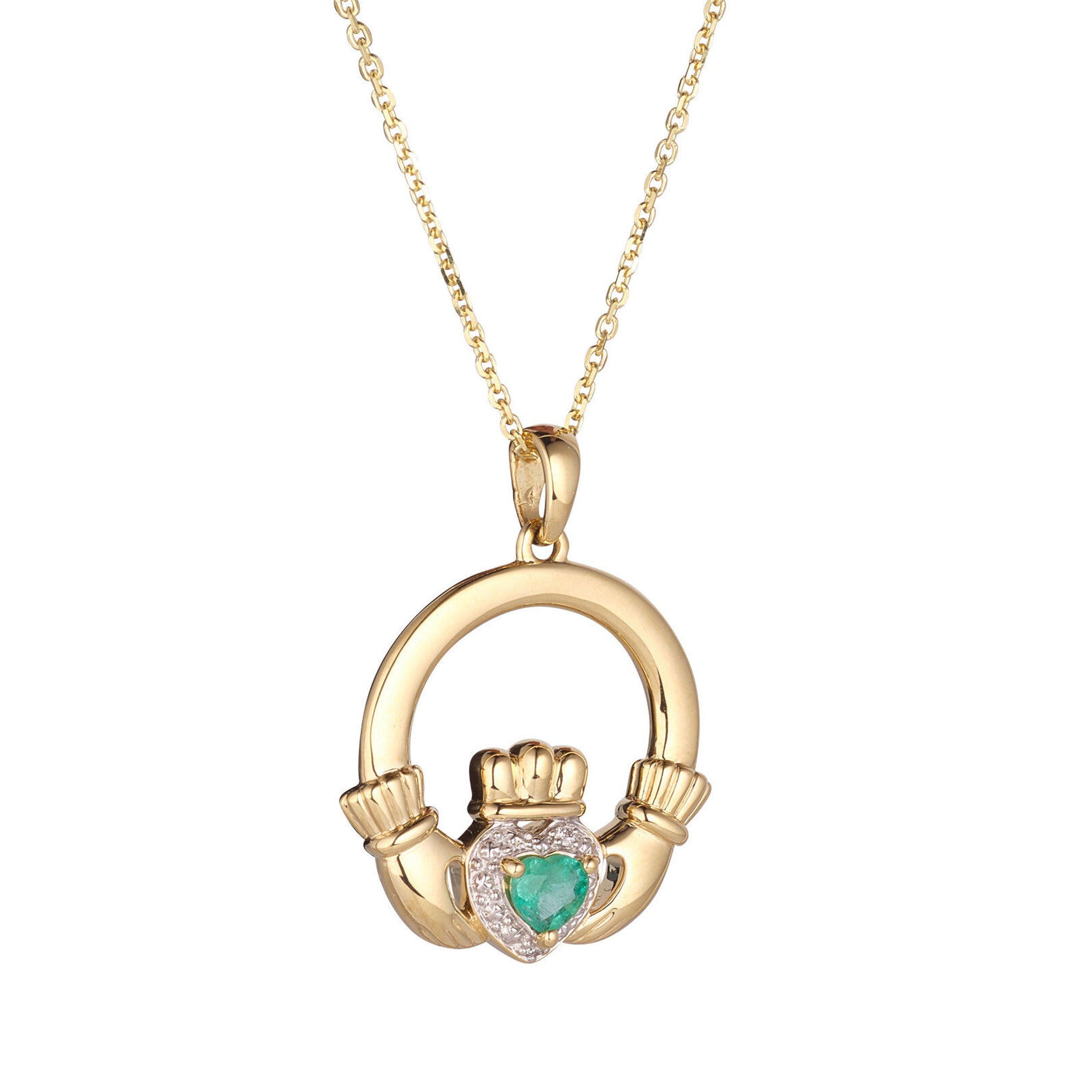 A diamond Claddagh necklace crafted in 14k yellow gold and set with your choice of vivid emerald, ruby or sapphire. This would be a magical gift to bestow on your loved one, as the Claddagh emblem symbolises love, loyalty and friendship.