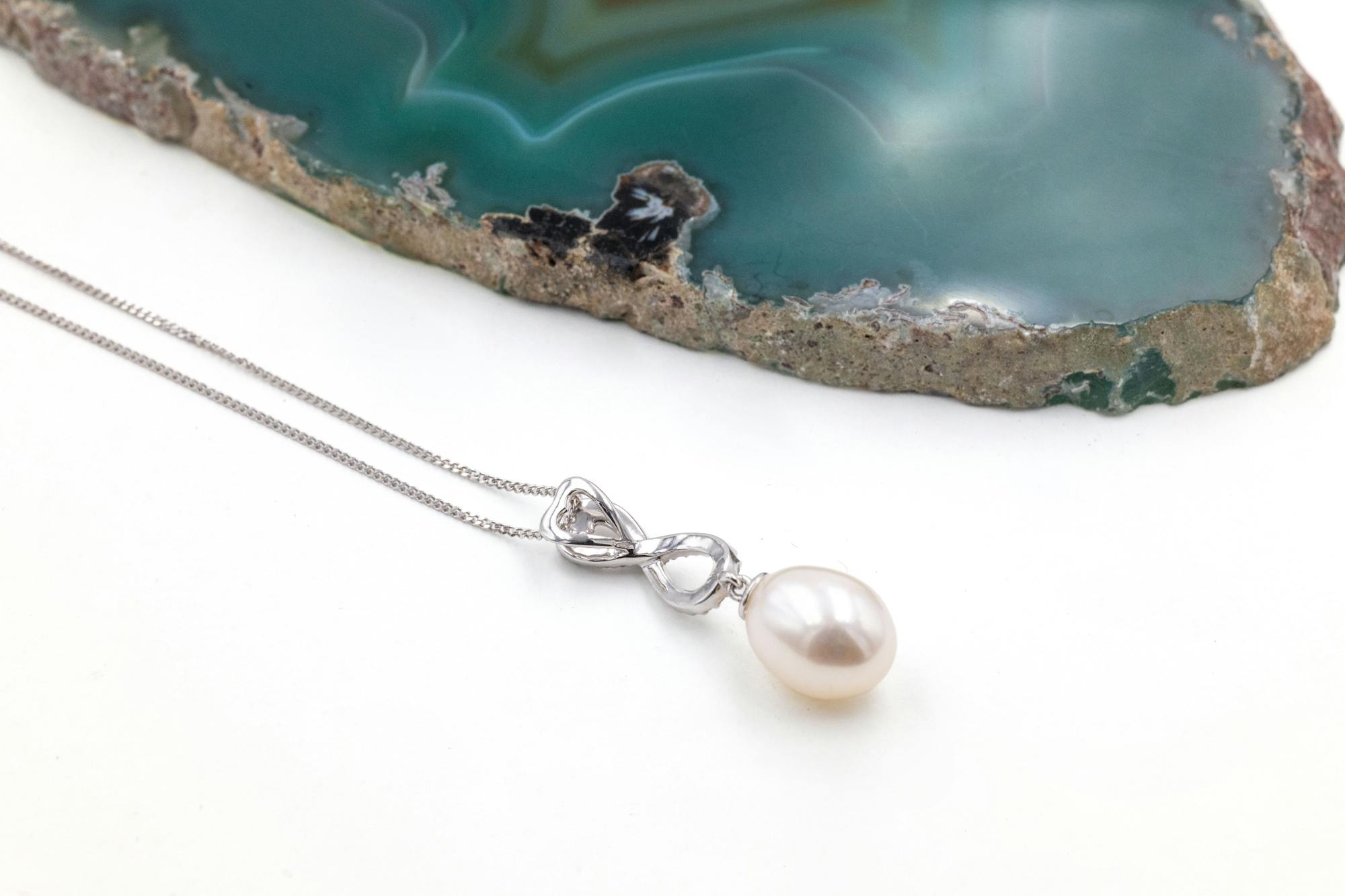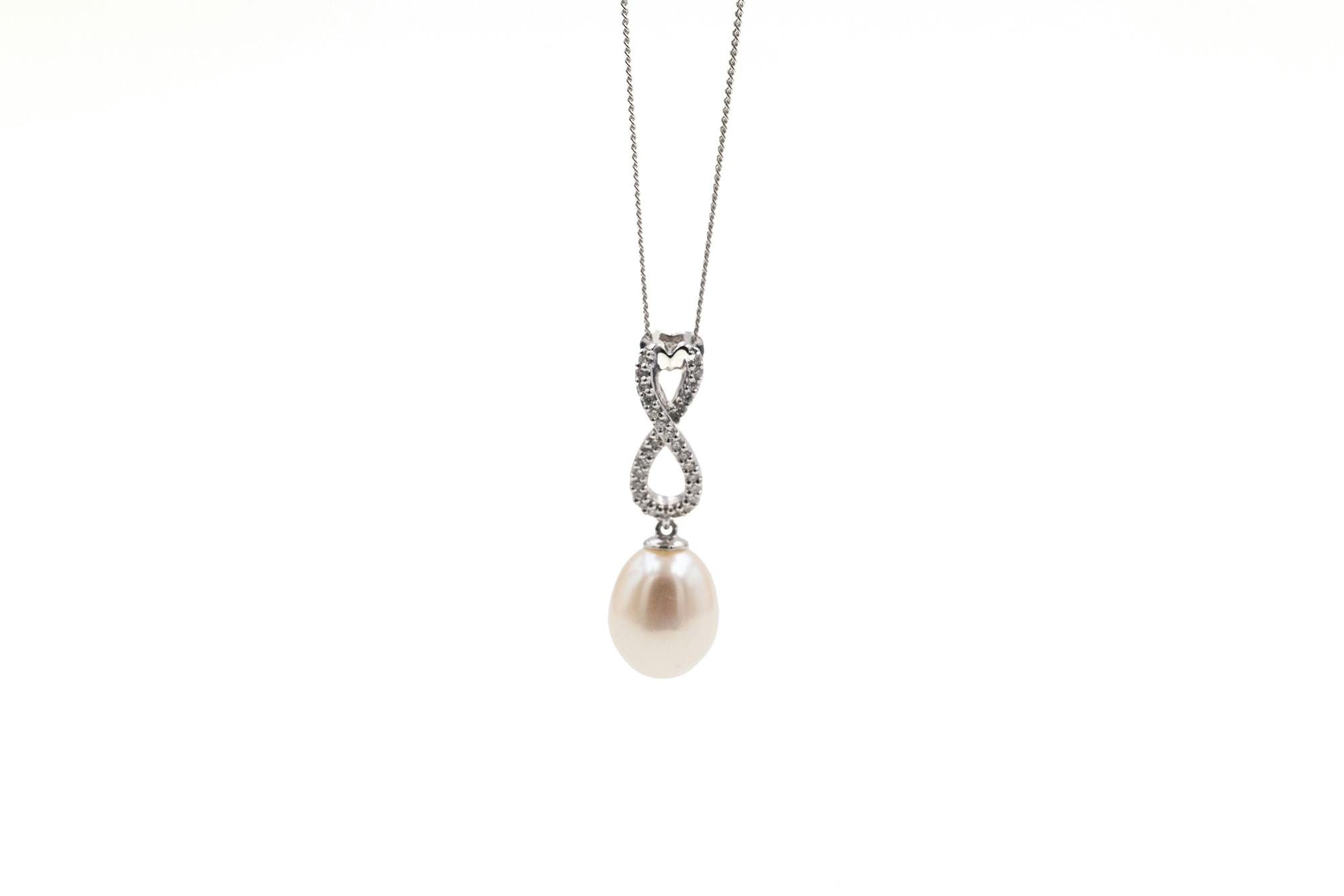 A stunning freshwater pearl is suspended from an elegant Celtic infinity knot set with diamonds, adding symbolism and stylish sparkle to complete this timeless necklace.