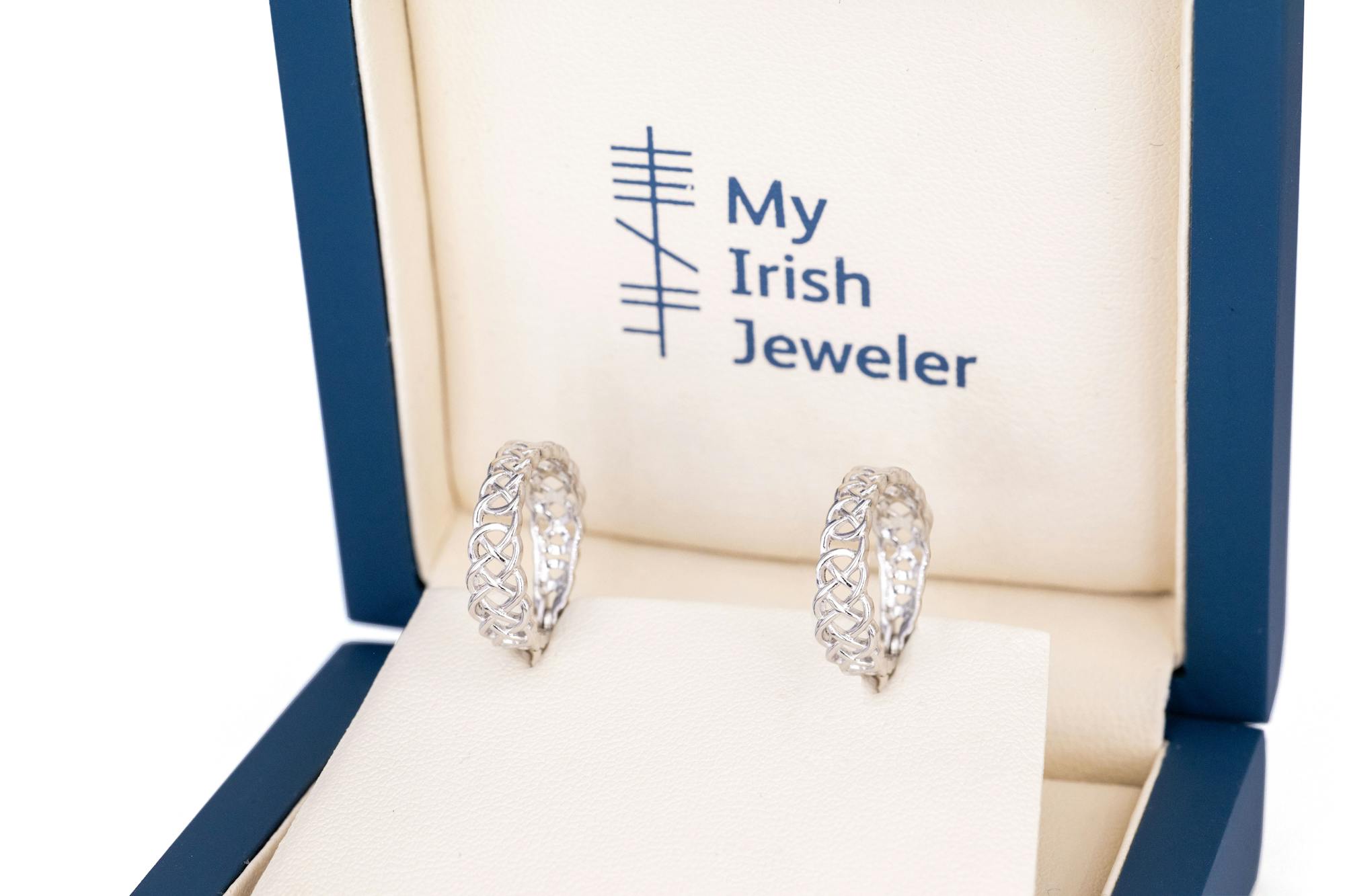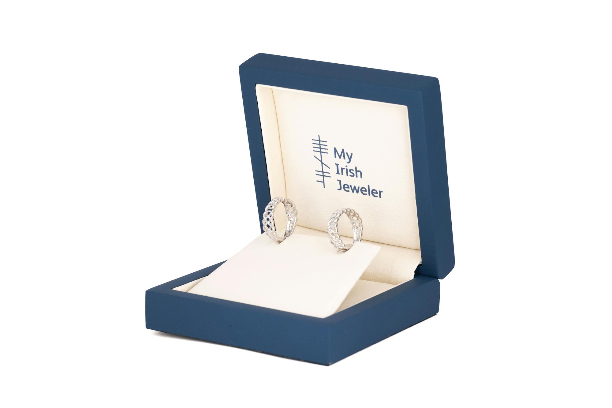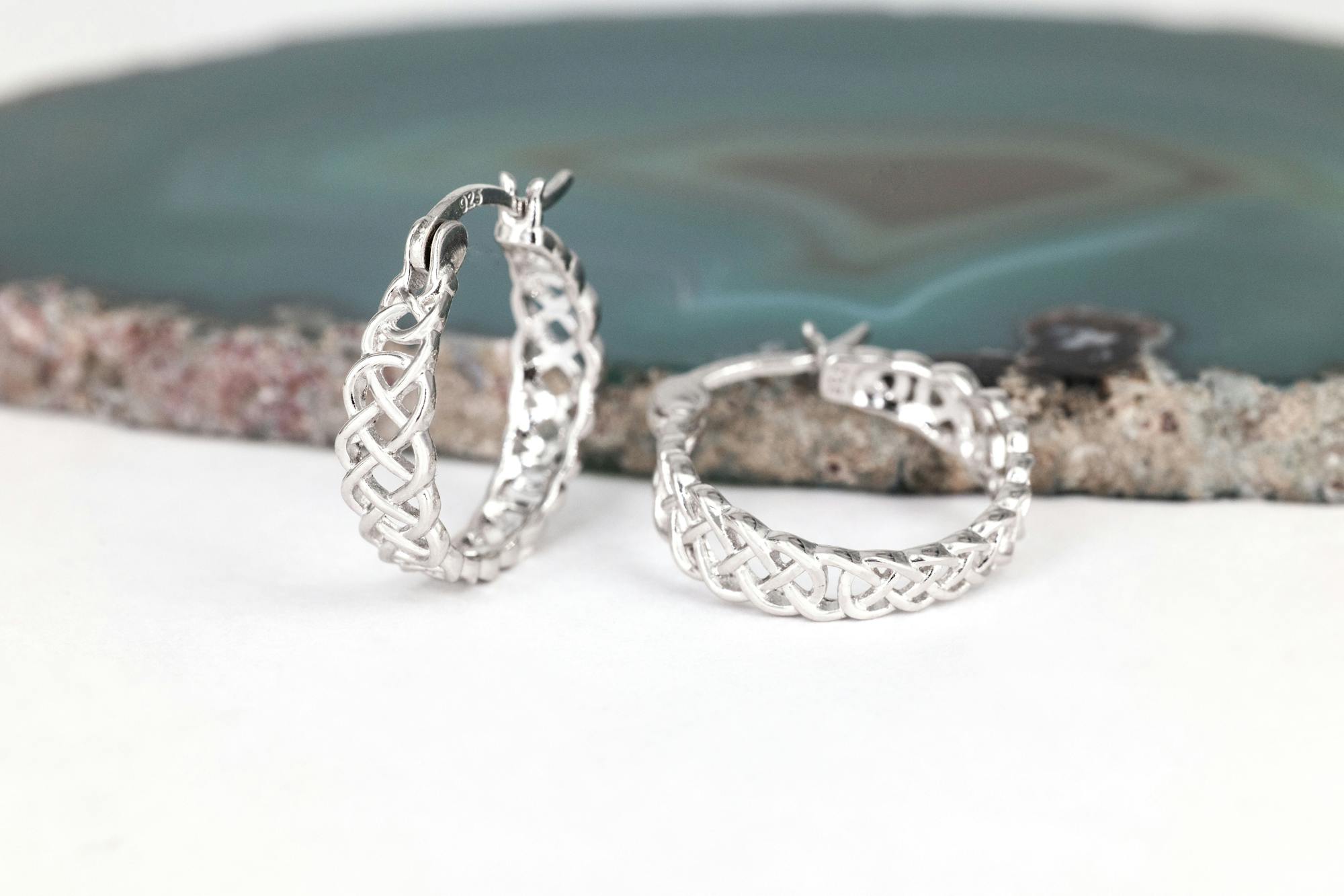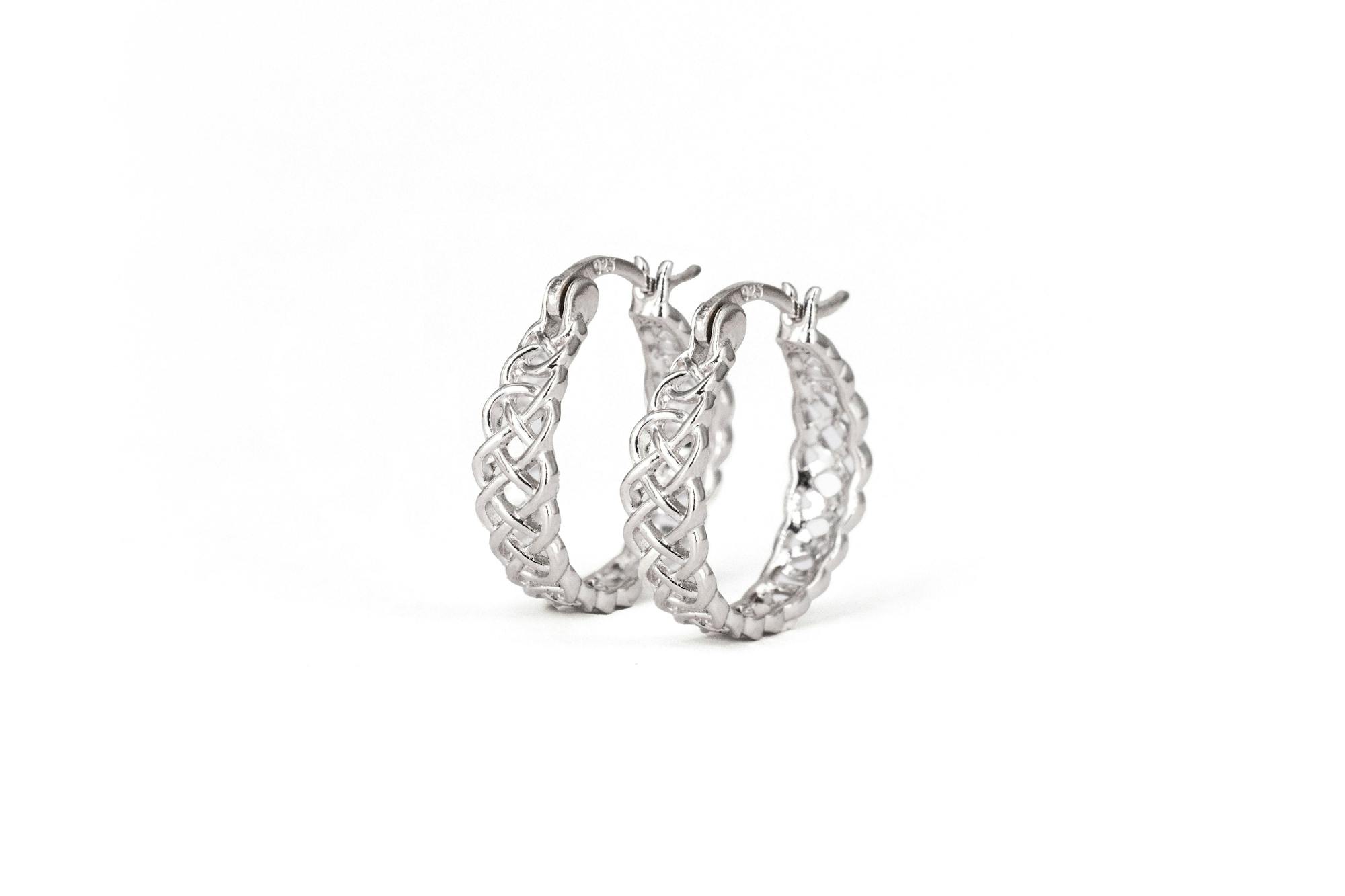 Celtic interlace representing eternity, love and connection weaves around the hoops, with beautiful symbolism, depth, and dimension.