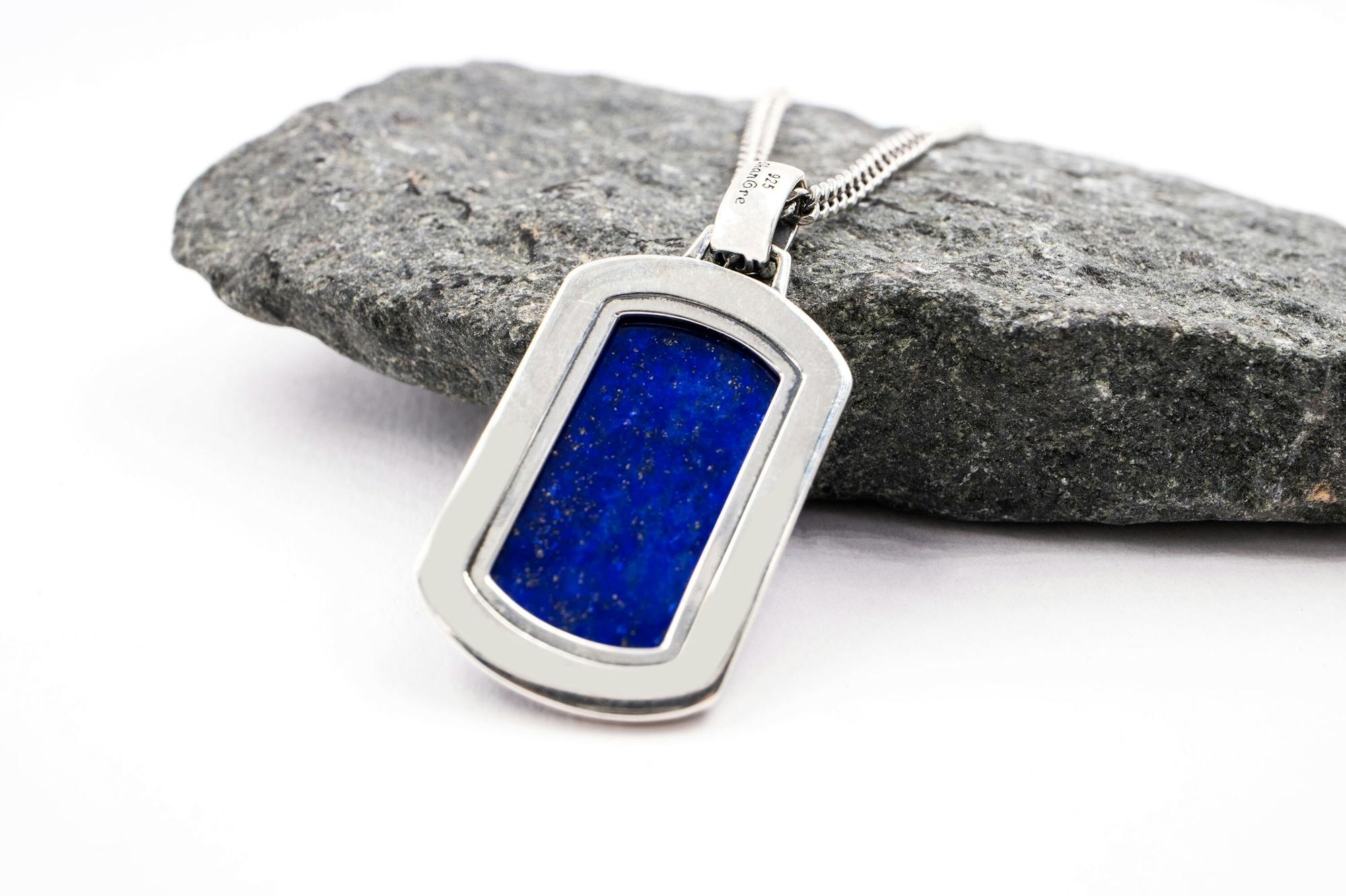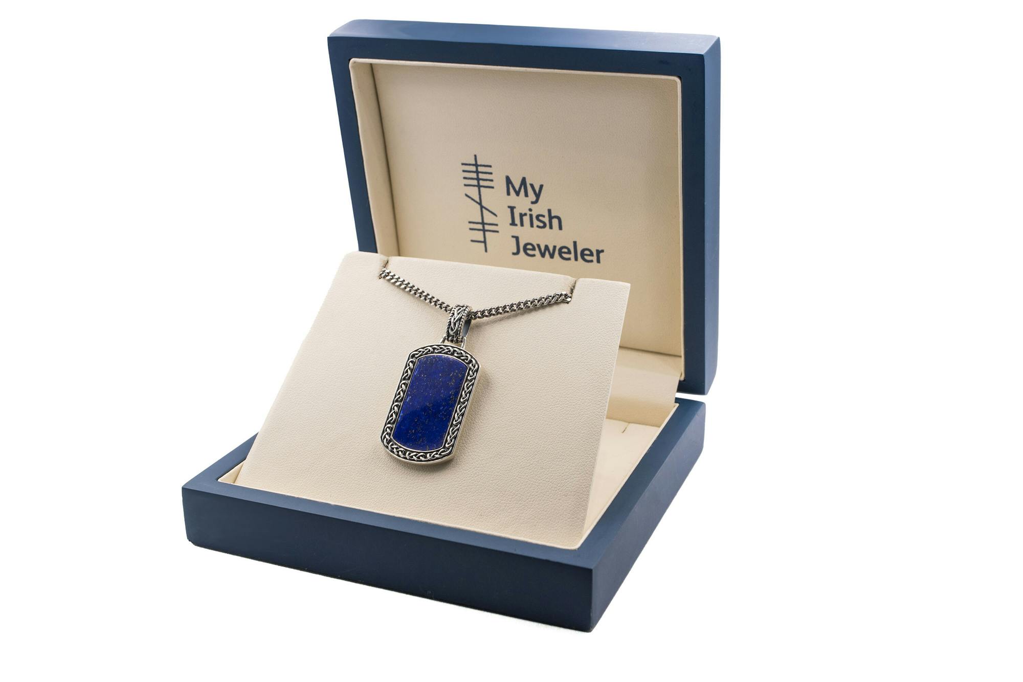 Inspired by the battle armour of ancient celtic warriors, this oxidised sterling silver dog tag and matching ring are statement pieces set with rich blue lapis lazuli. The necklace and the head of the ring are outlined with a handsome celtic knot frame, with strong symbolism linked to eternity and constance. The celtic knot-work has been given an oxidised finish, picking out the unbroken pattern, giving an old world feel, and contrasting handsomely with the vibrant blue of the lapis stone.