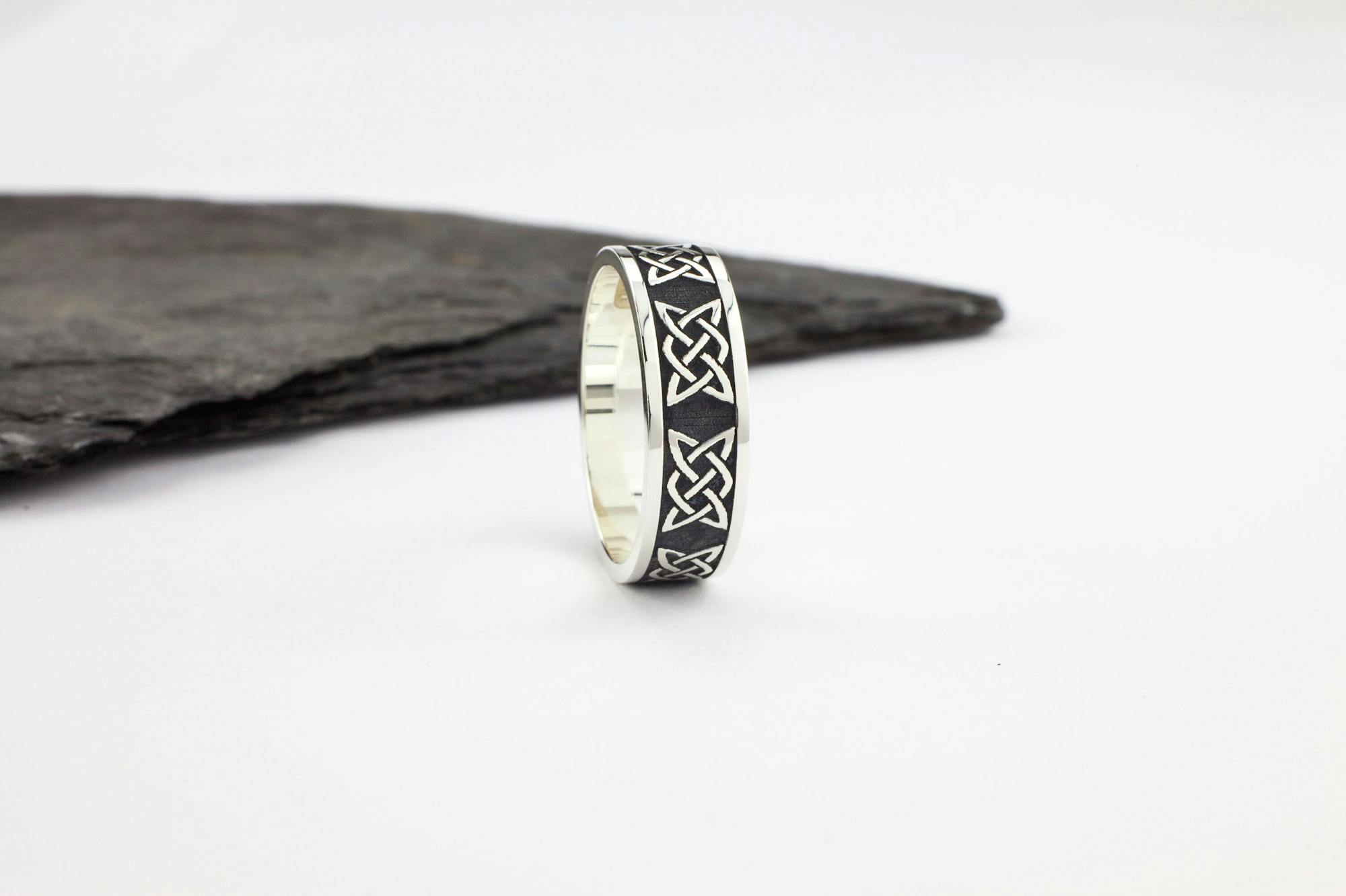 Elegant and intricate Celtic love knots repeat around the band. The embossed knots are formed by a continuous strand that weaves over and under in an unbroken loop, symbolising eternal love and connection - Perfect for celebrating a unique bond. Knots such as these adorn ancient manuscripts and Celtic treasures and were thought to confer protection and strength.