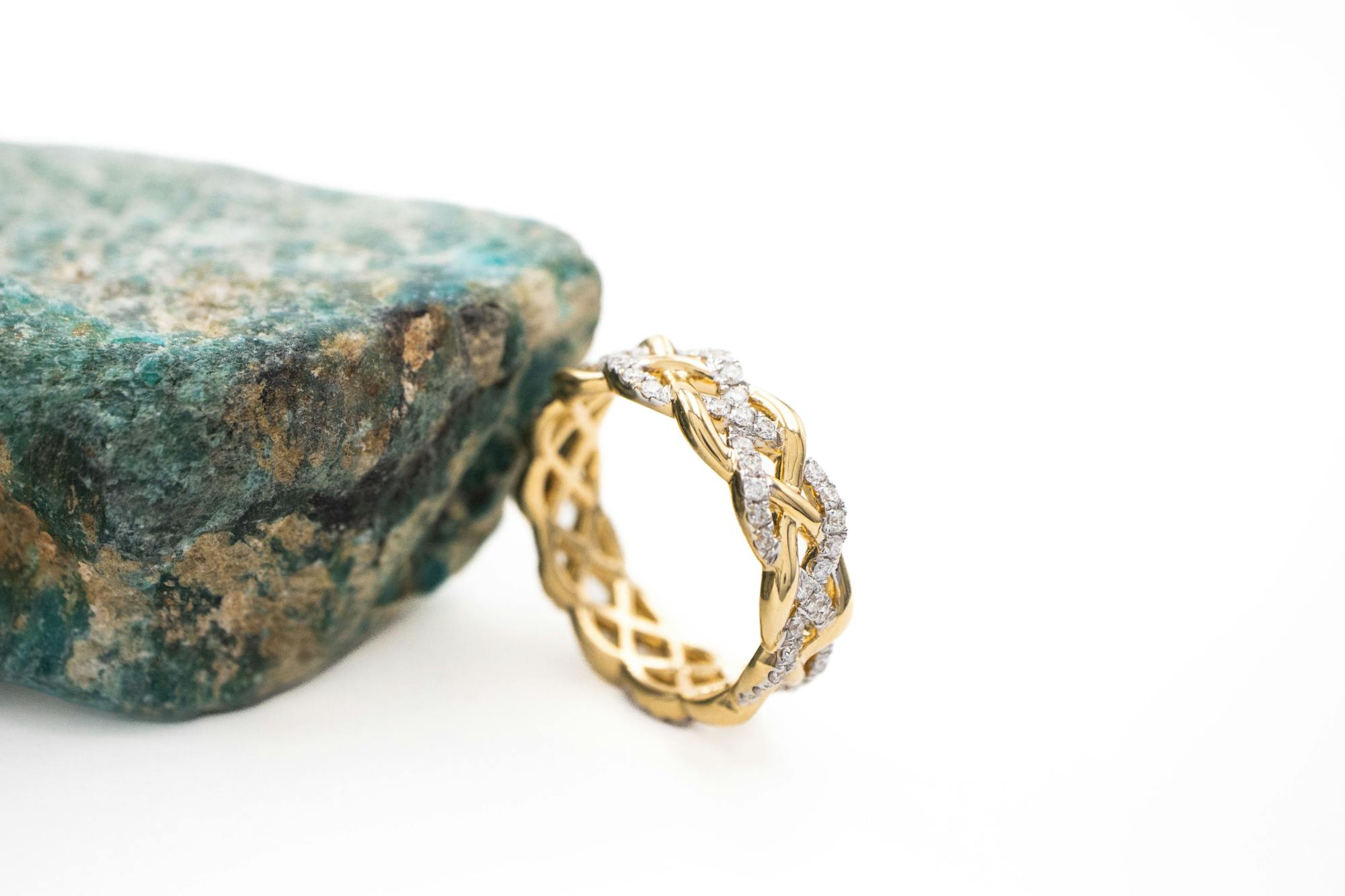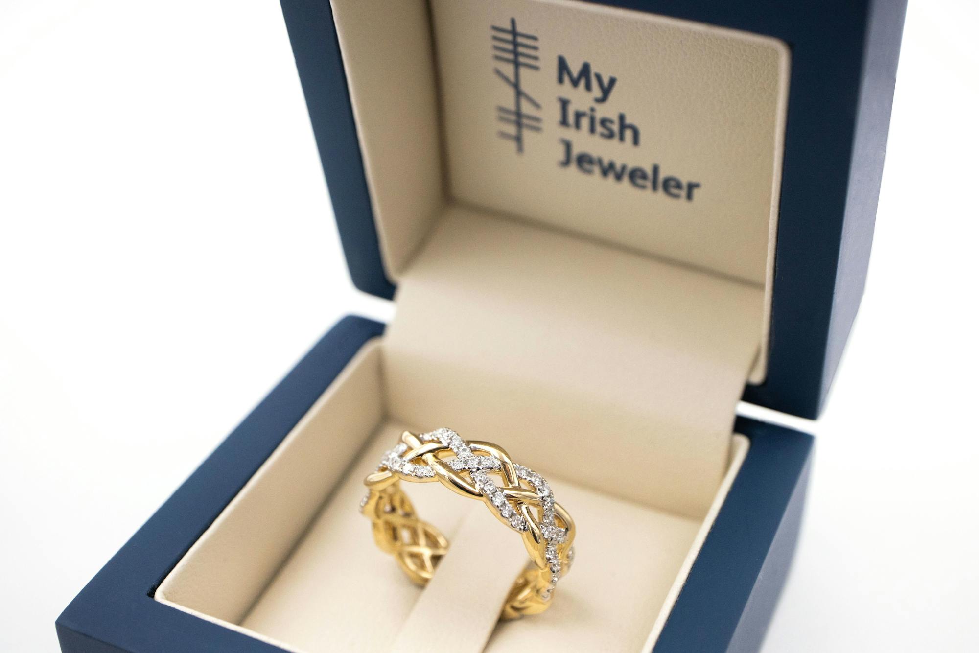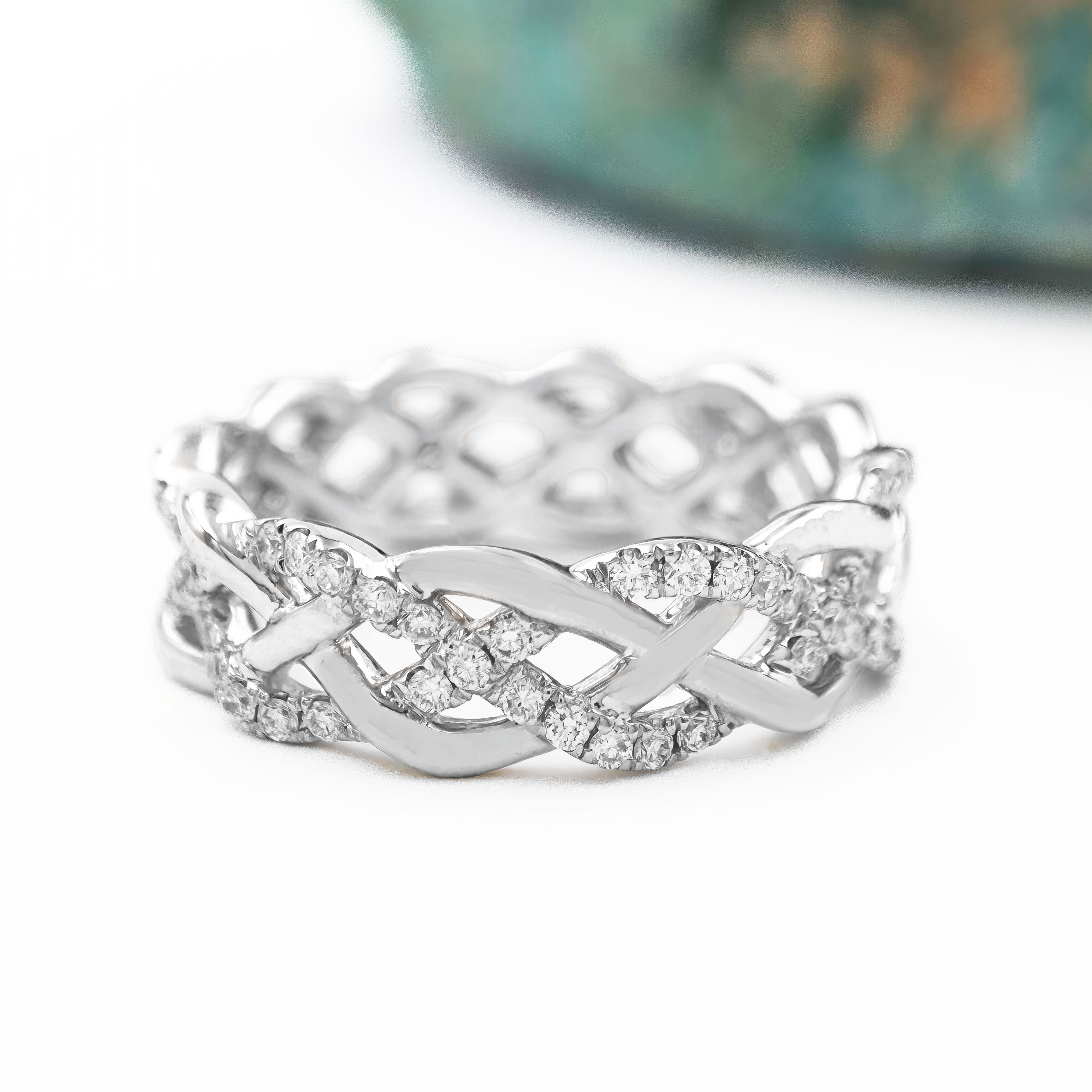 The continuous and unbroken nature of the Celtic interlace today represents connection, unity, and eternal love, making it a popular choice for those looking to mark significant life events or romantic couples celebrating a unique bond. Perfect for a stand-alone wedding ring, a magnificent anniversary ring, a spectacular gift for you or someone special.