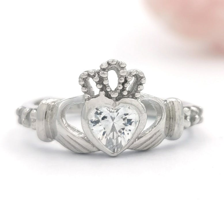 Imbued with the spirit of the Emerald Isle, this ornate Sterling Silver Claddagh Ring features a heart-shaped birthstone of your choosing, brilliantly offset by shimmering CZ stones. Engraved inscriptions of Love, Loyalty, and Friendship serve as touchstones to the values of the Claddagh. The rub-over setting, and meticulous milgrain detailing on the crown make this piece a truly special keepsake for those honoring their Irish heritage.