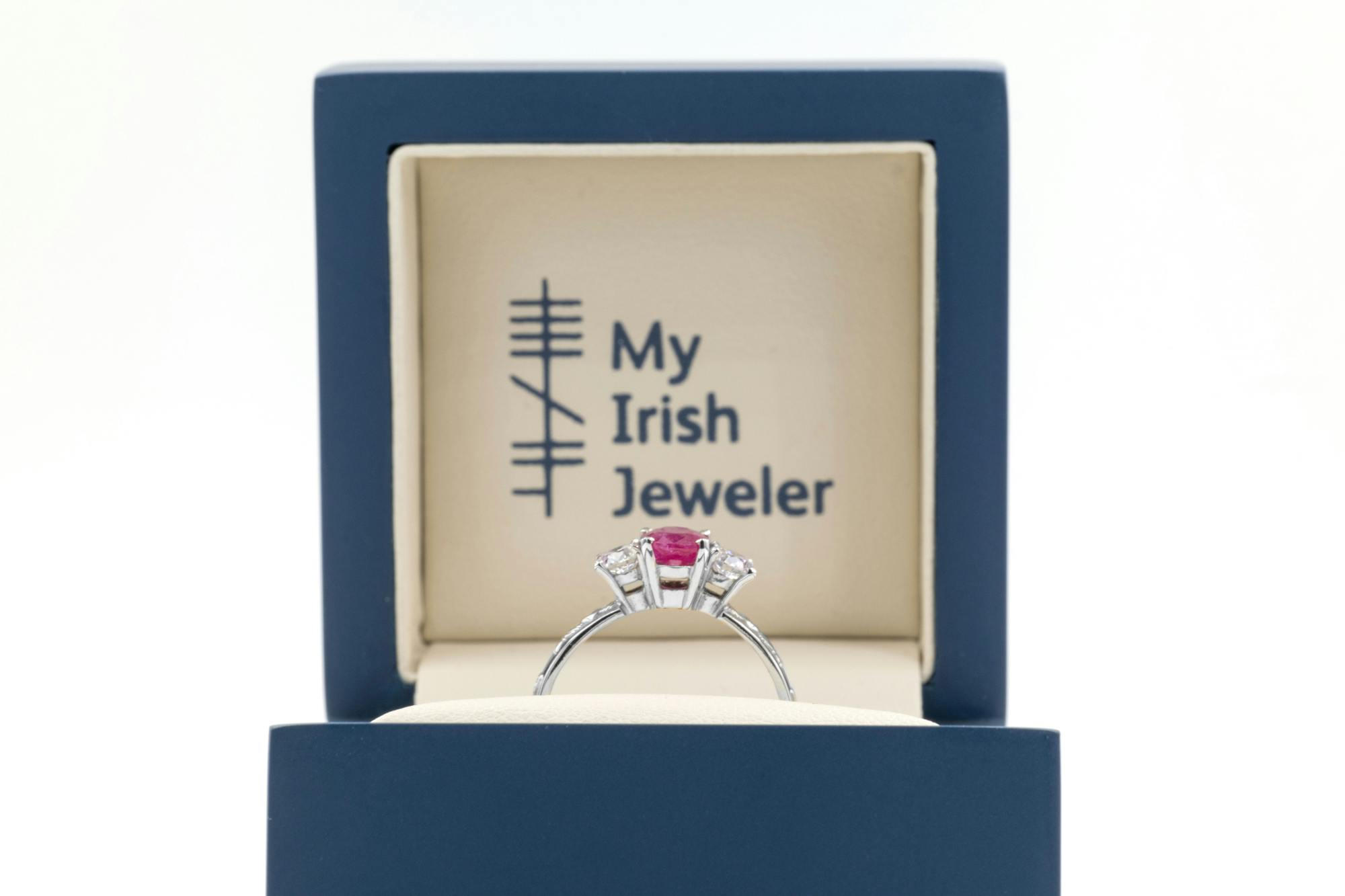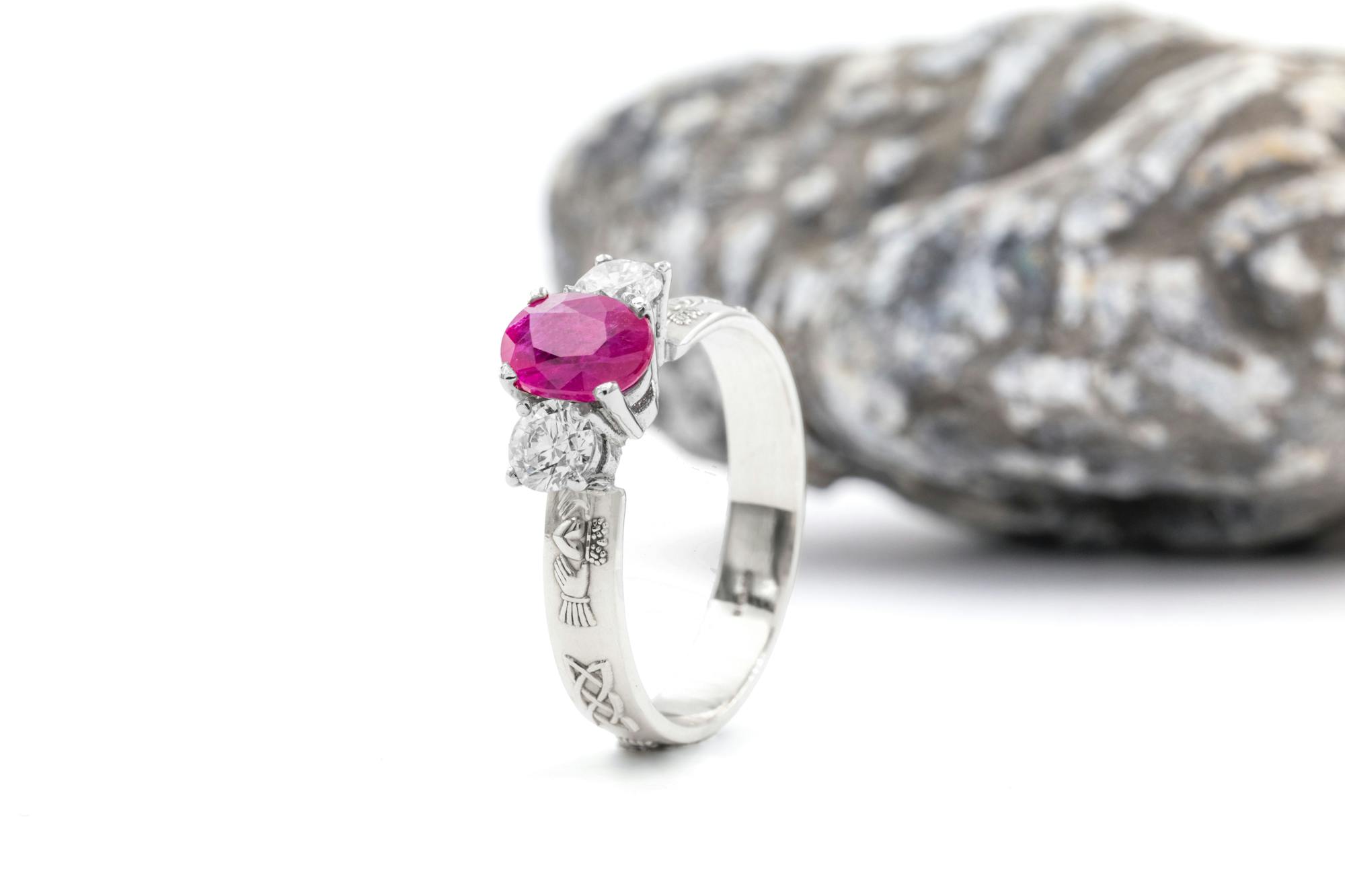 This Ring is set with a 0.75ct Oval shaped Natural Ruby, with 2 Side Stones.