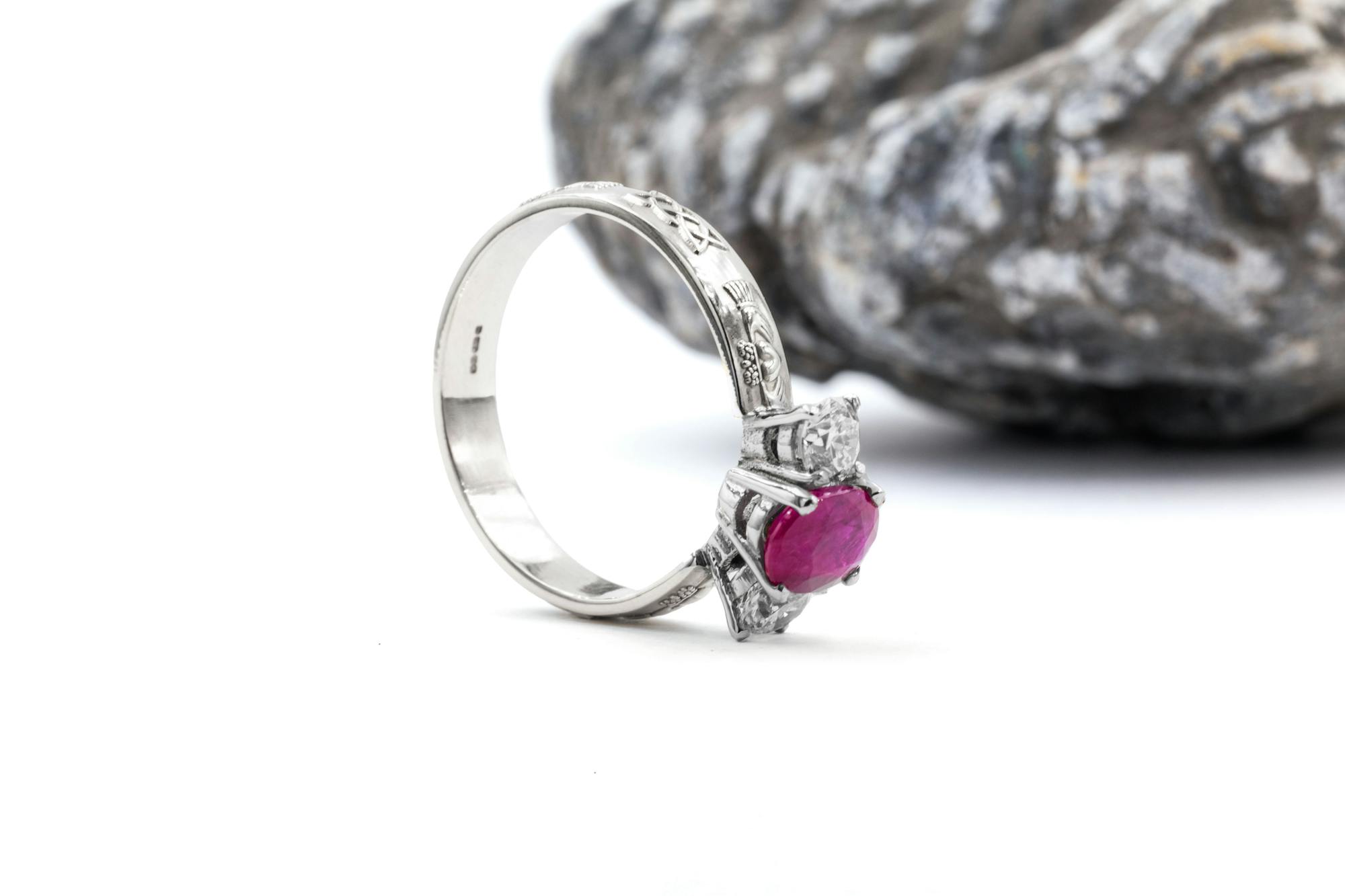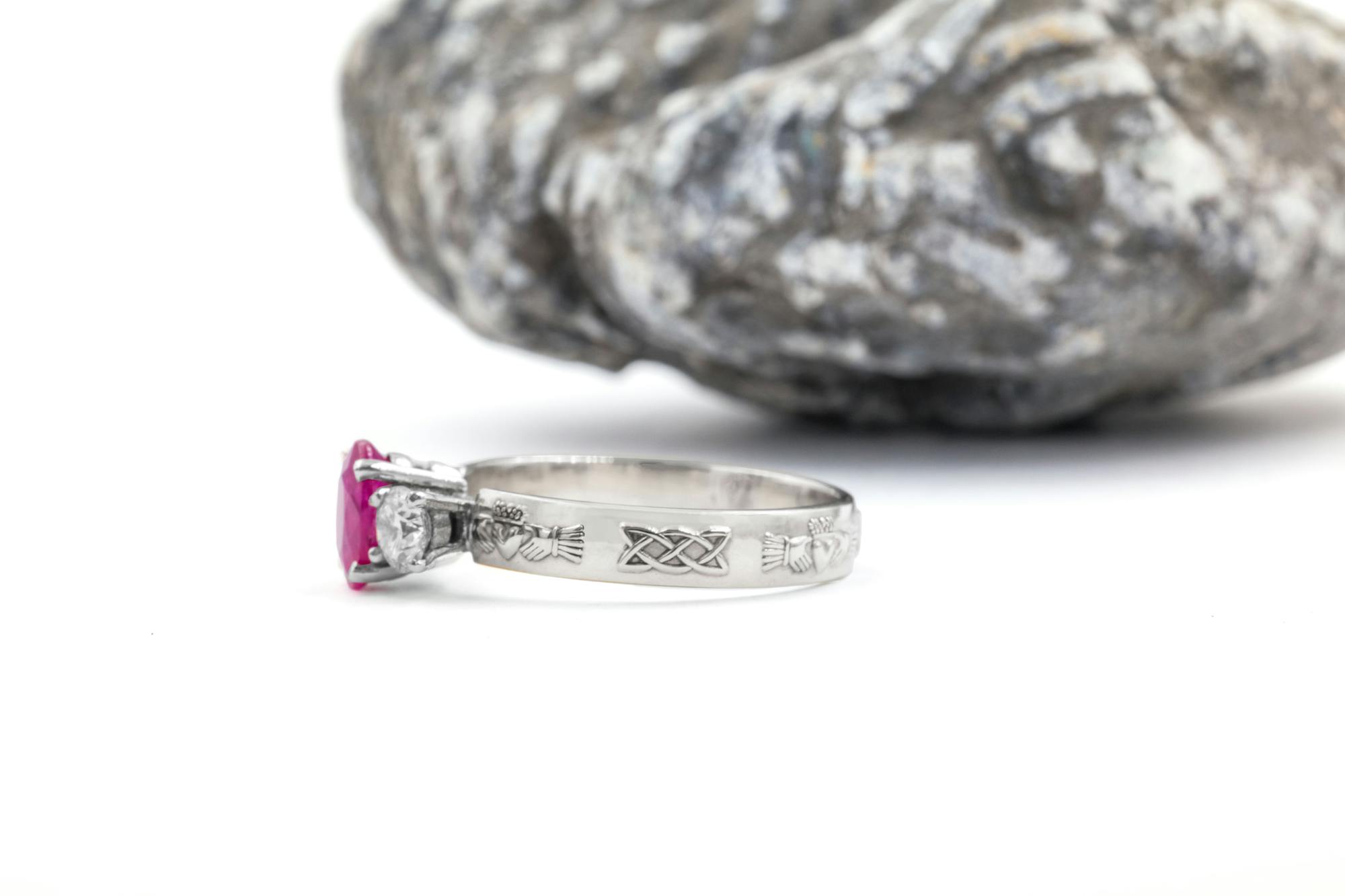 The elevated basket setting provides a striking profile while ensuring security for the precious stones. The 4mm band is beautifully detailed with alternating Claddagh and Celtic love knot designs, symbolising an unbreakable bond.