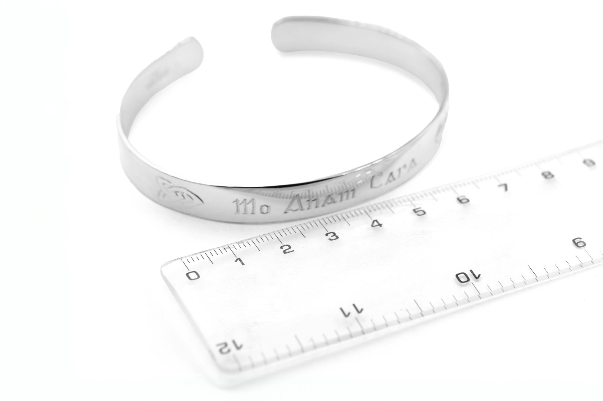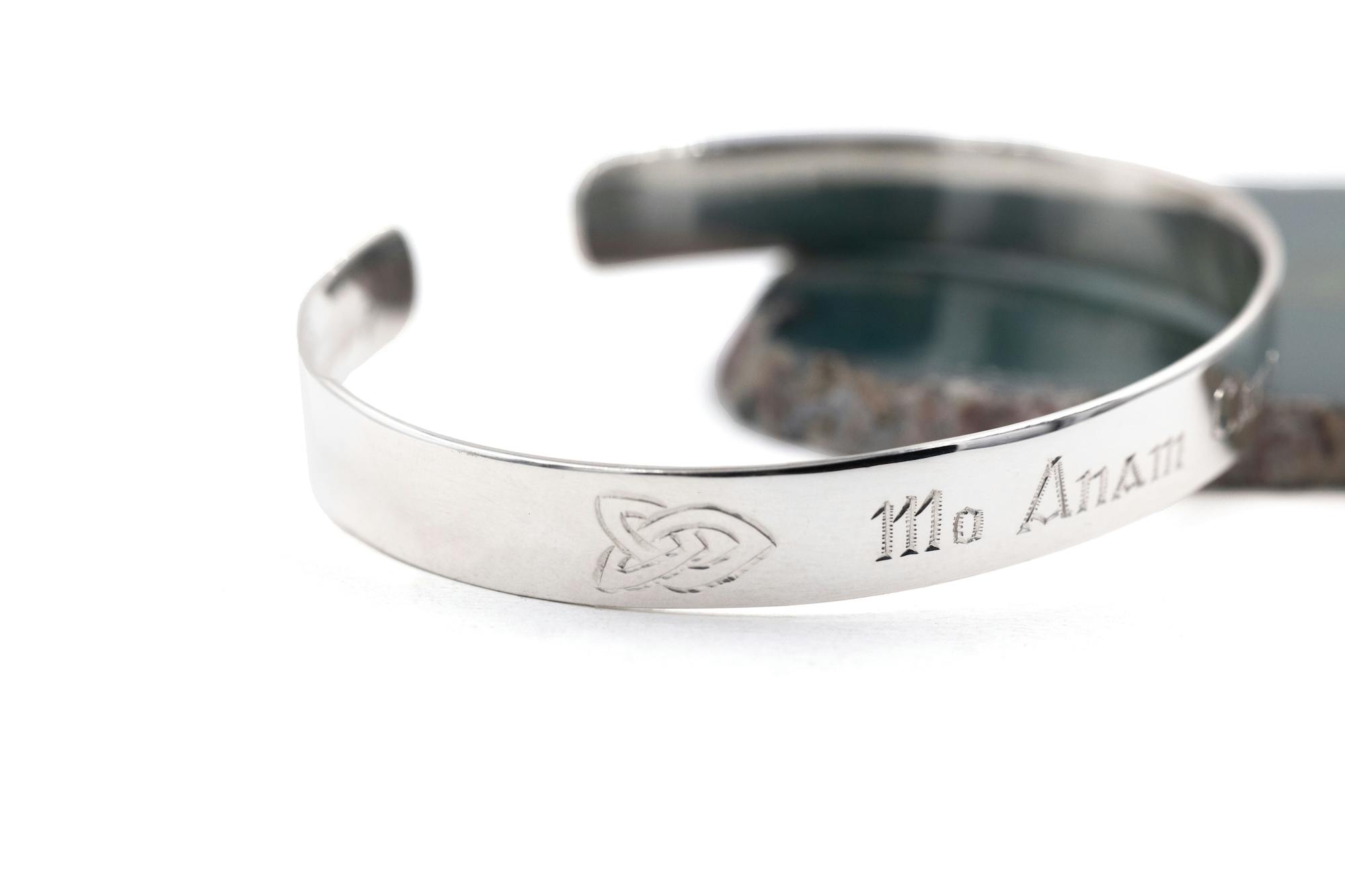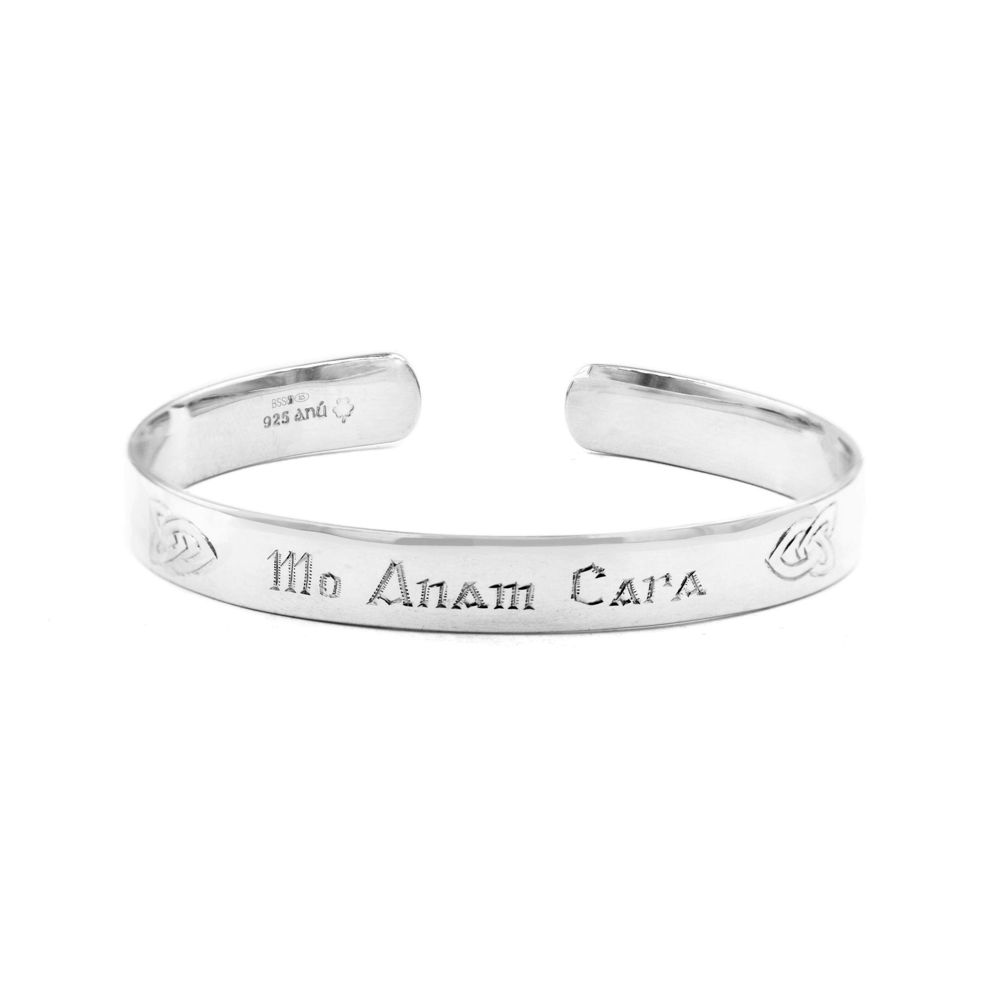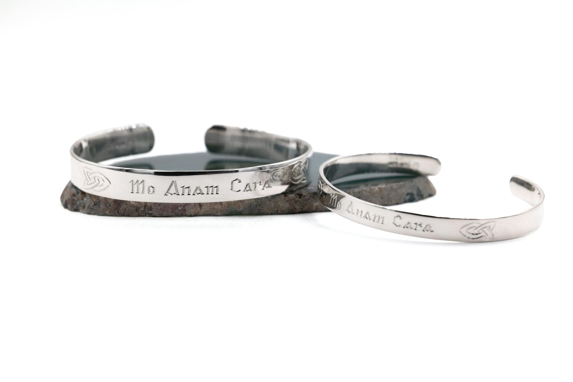 The bangle pictured has been hand engraved with the Irish phrase 'Mo Anam Cara' - which roughly translates as "My soul mate." Choose a name or wording of your choice - popular choices include: love forever, be mine, destiny, my soul-mate or anam cara, best friend, Ireland, health or slainte, home, family, friendship, love or grá, faith, hope, charity. The inside of the bangle can also be engraved with a message, import and date or word of your choice.