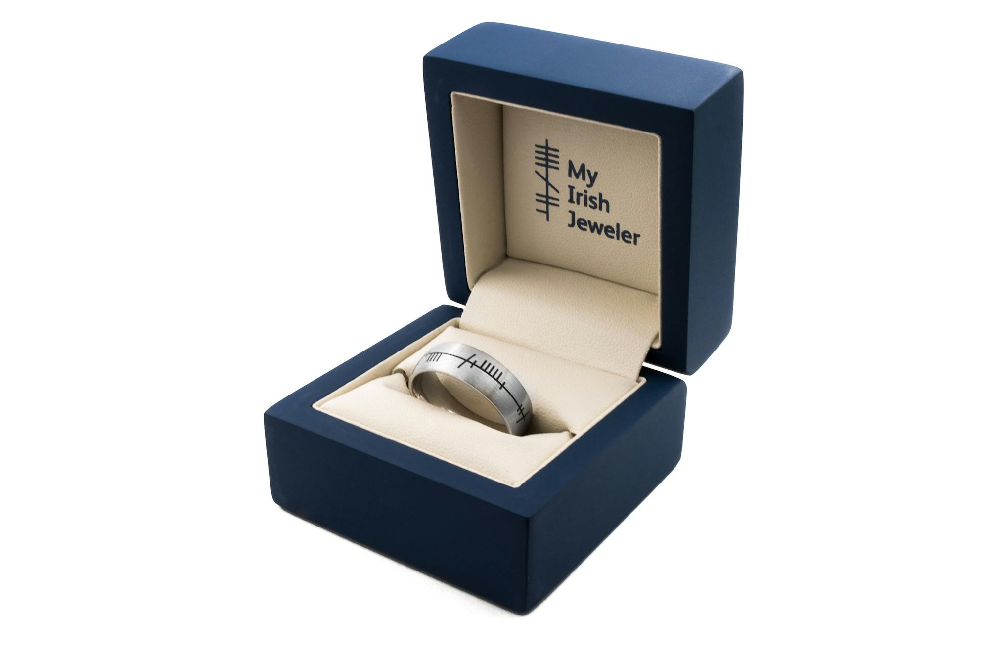 This is a deeply personal and striking ring with ancient roots and modern style. Personalise your choice of brushed platinum or white gold by having your name, the name of a loved one, or indeed a word of significance for you rendered in ogham with a striking cerin finish.