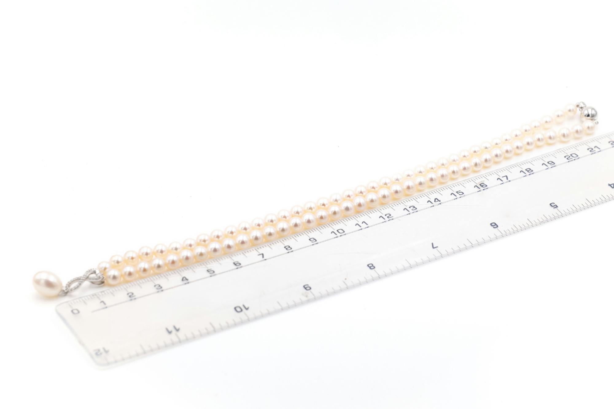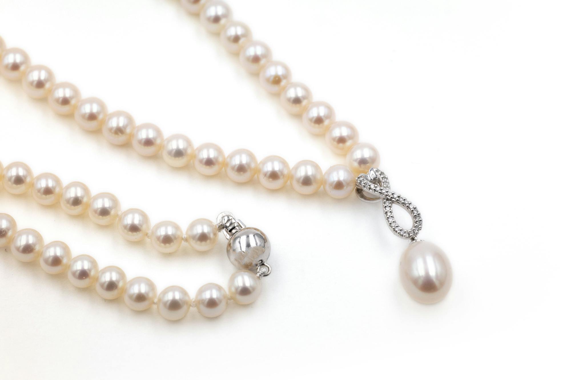Diamond 0.08 TCW, strand pearls measure 5mm round, pendant pearl measures 8mm x 8.5mm