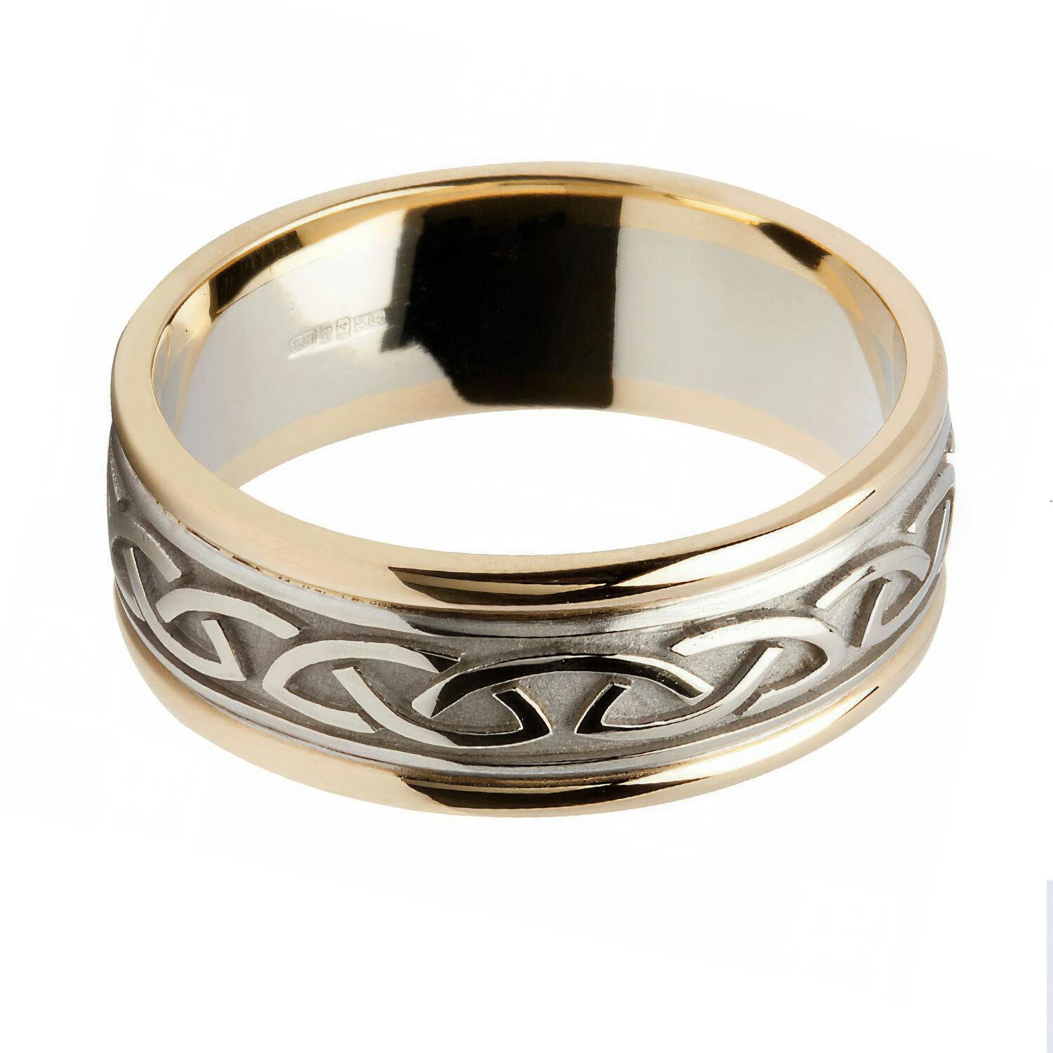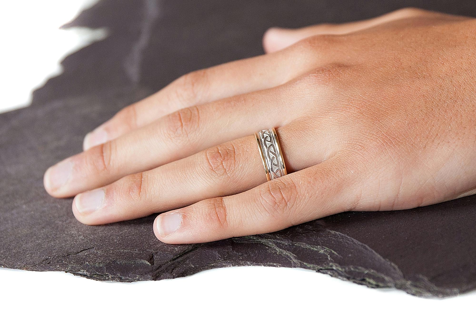 This ring features a polished & embossed Celtic Knot design with the pattern repeating all the way round the band. The area behind the design has an interesting satin or brushed finish which allows the detail of the Celtic Knot pattern to stand out.