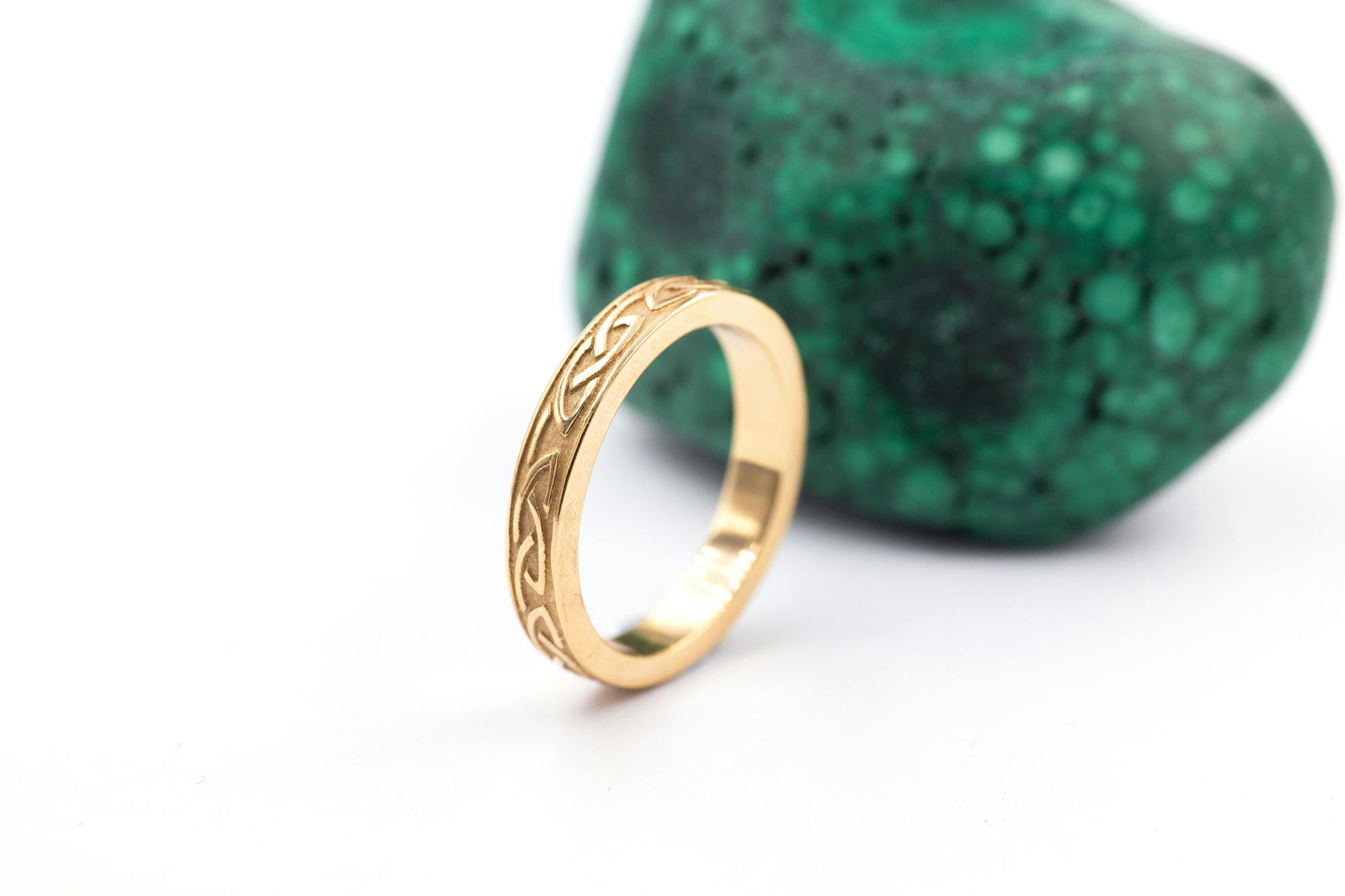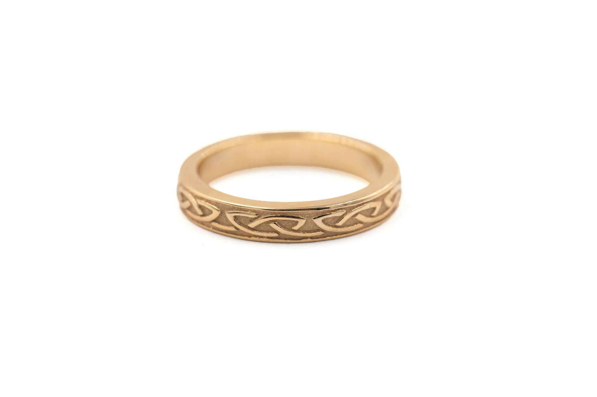 This ring features a polished & embossed Celtic Knot design where the pattern repeats all the way round the band. The area behind the design has a lovely satin or brushed finish which really makes the pattern stand out.