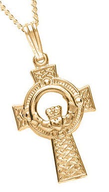 This 10k Celtic Cross has a very clever design as it incorporates the Claddagh symbol into the circle of the cross, A most unusual feature of this piece is the texture and finish due to the special tools used to create this 'raised and embossed' look.