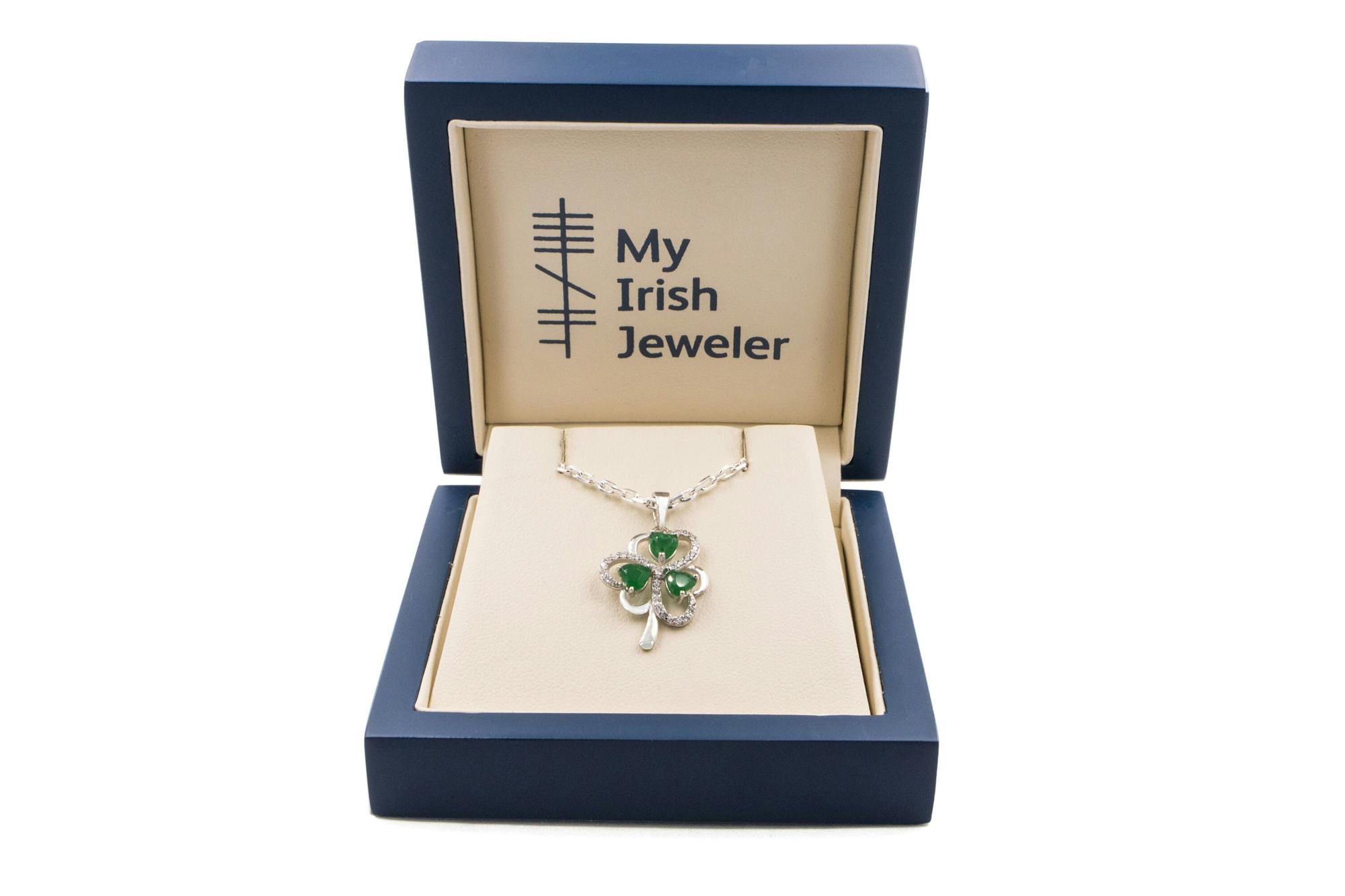 A stylish and symbolic sterling silver Shamrock necklace set with vibrant green agate and sparkling CZ