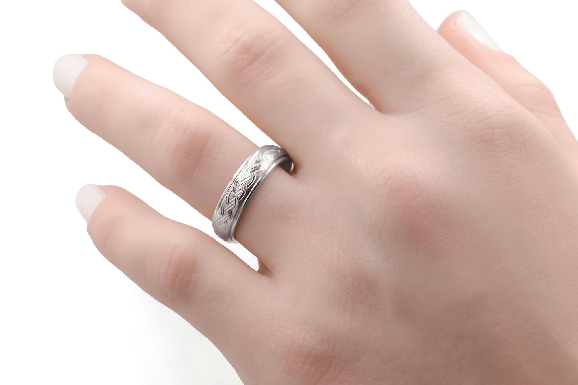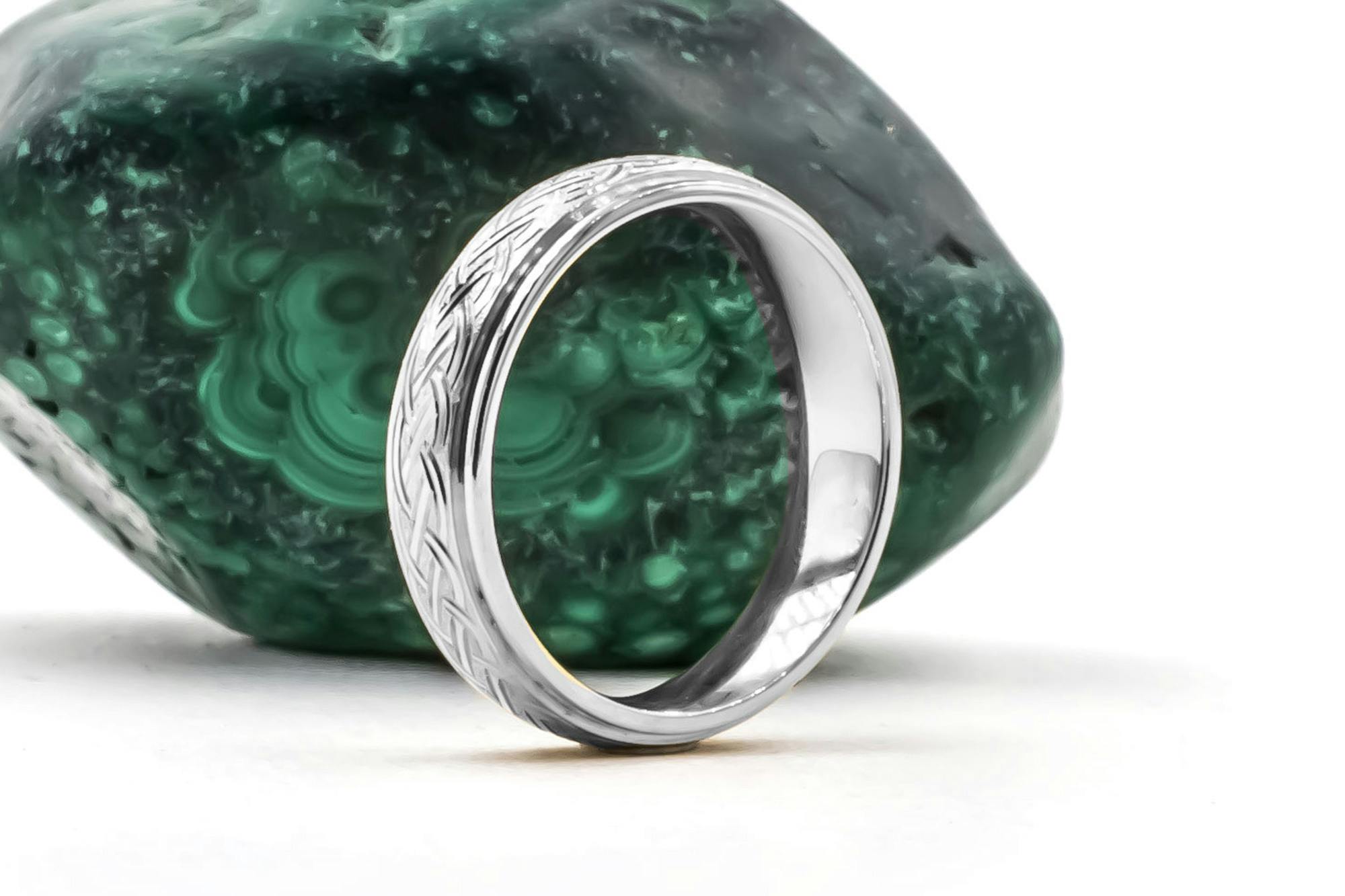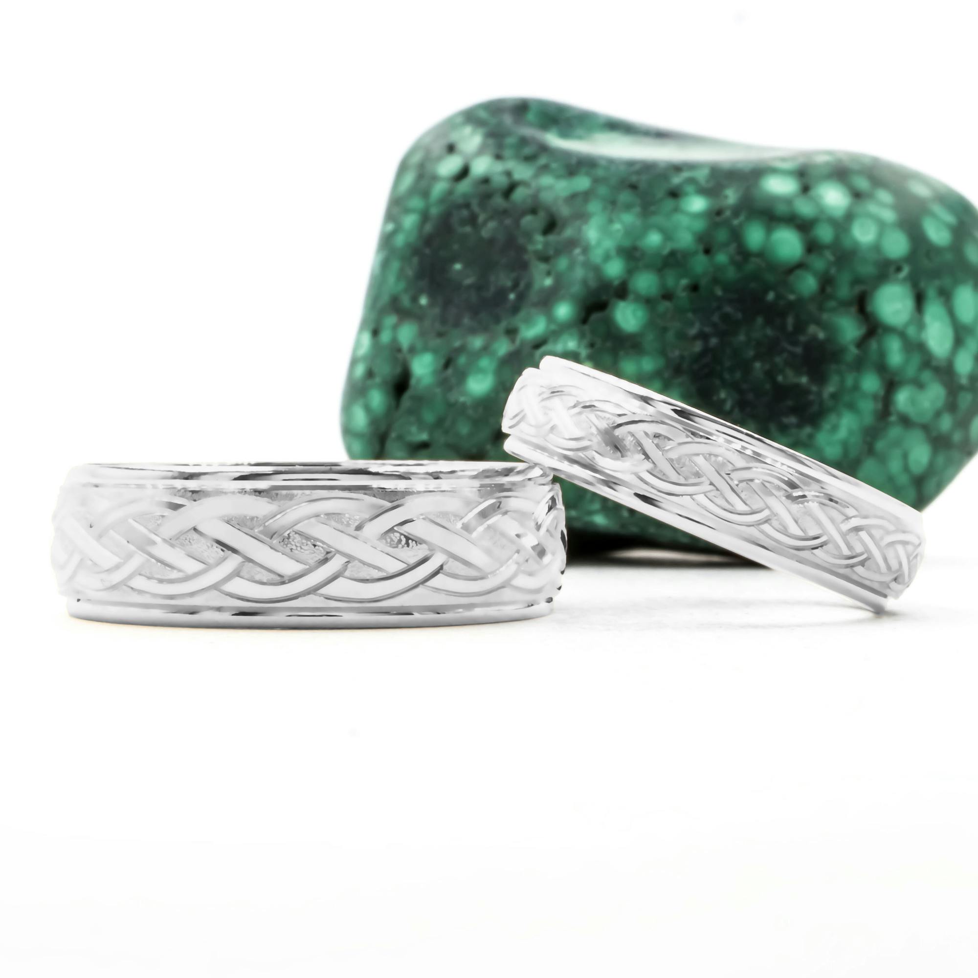 An intricate Celtic knot interlace is hand engraved around the entire band in this ring set. The unbroken nature of the design is an ancient symbol of eternal love and connection. Perfect for rings to celebrate a close bond.