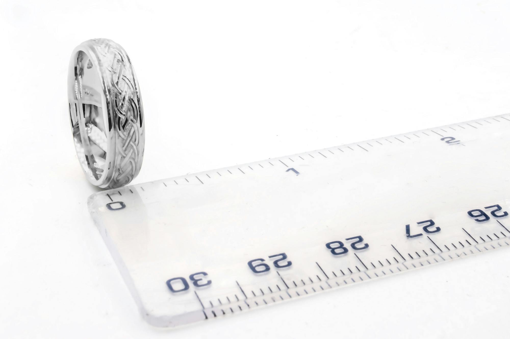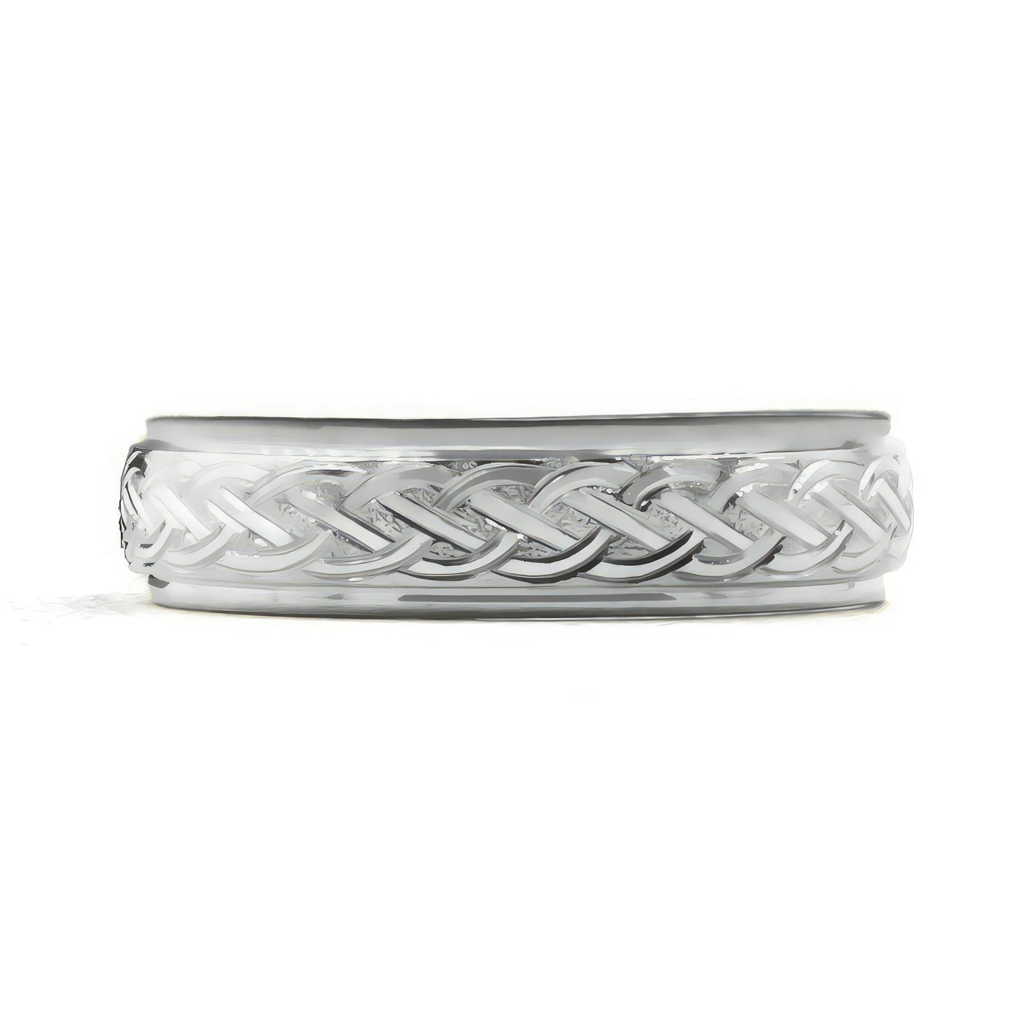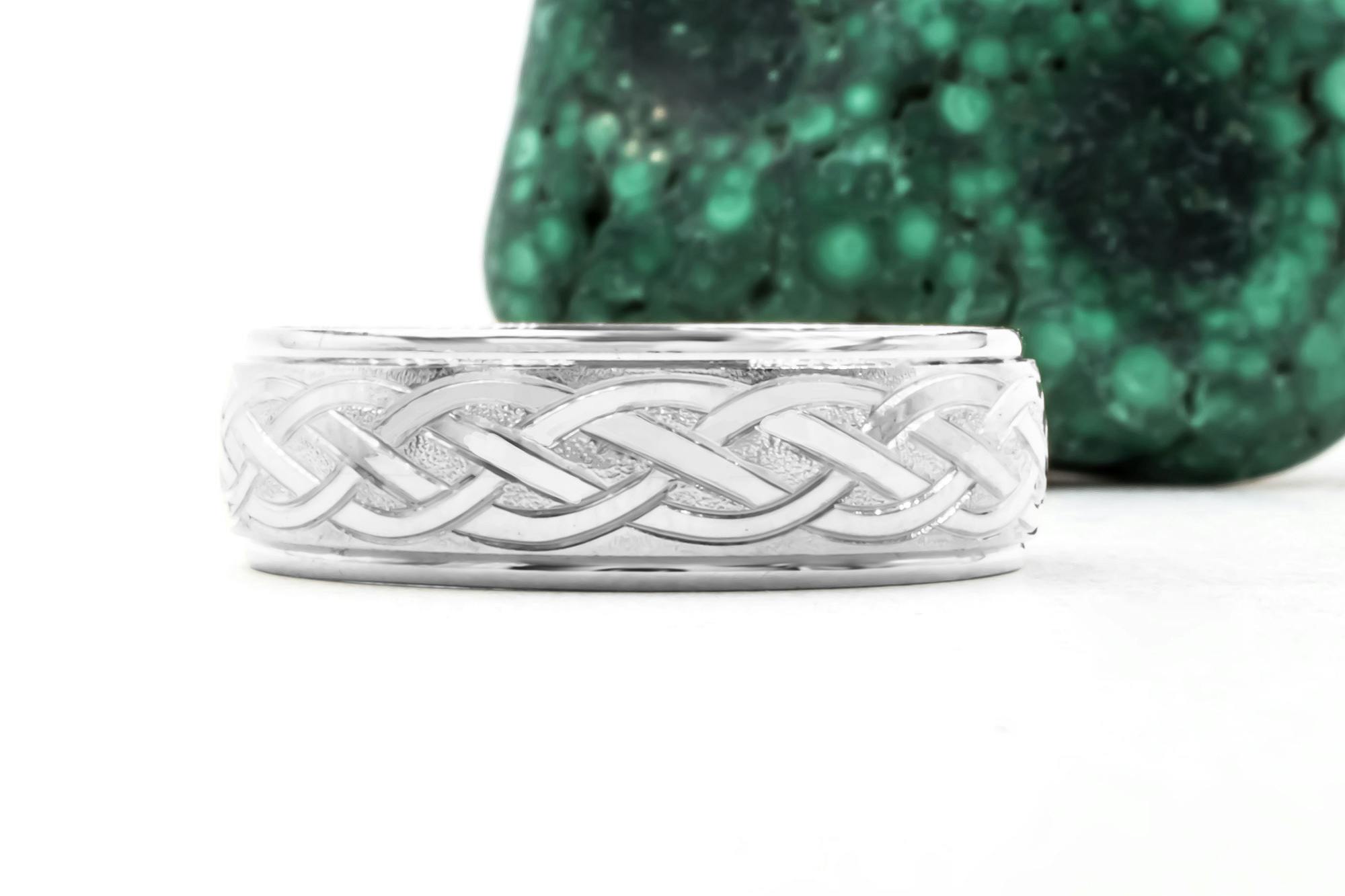 An intricate Celtic knot interlace is hand engraved around the entire band in this ring set. The unbroken nature of the design is an ancient symbol of eternal love and connection. Perfect for rings to celebrate a close bond.