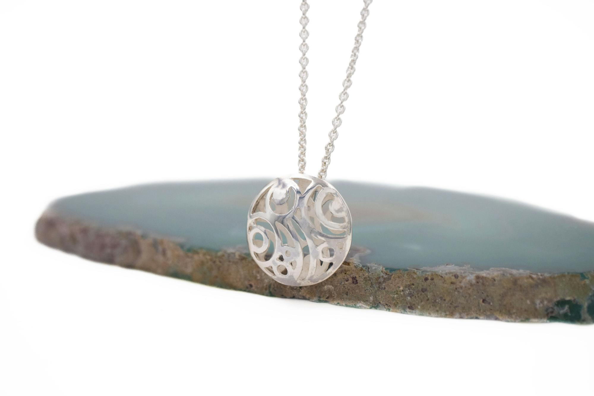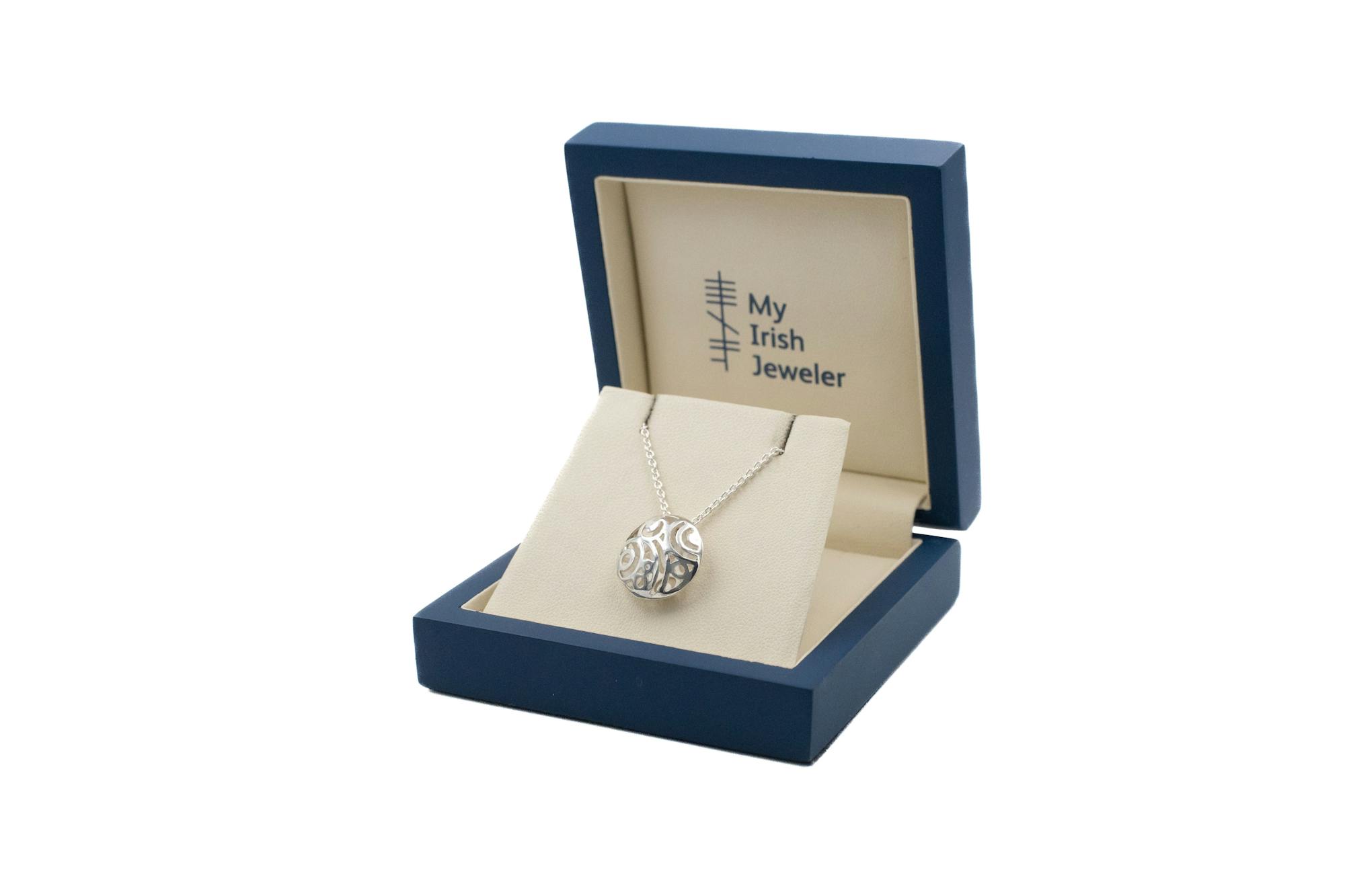 Designed and hand-crafted in Ireland, using solid sterling silver and carrying the stamp of quality and authenticity from the Irish Assay Office. The necklace hangs on an ingenuous hidden bale and can be worn between 16" or 18" on the included chain.