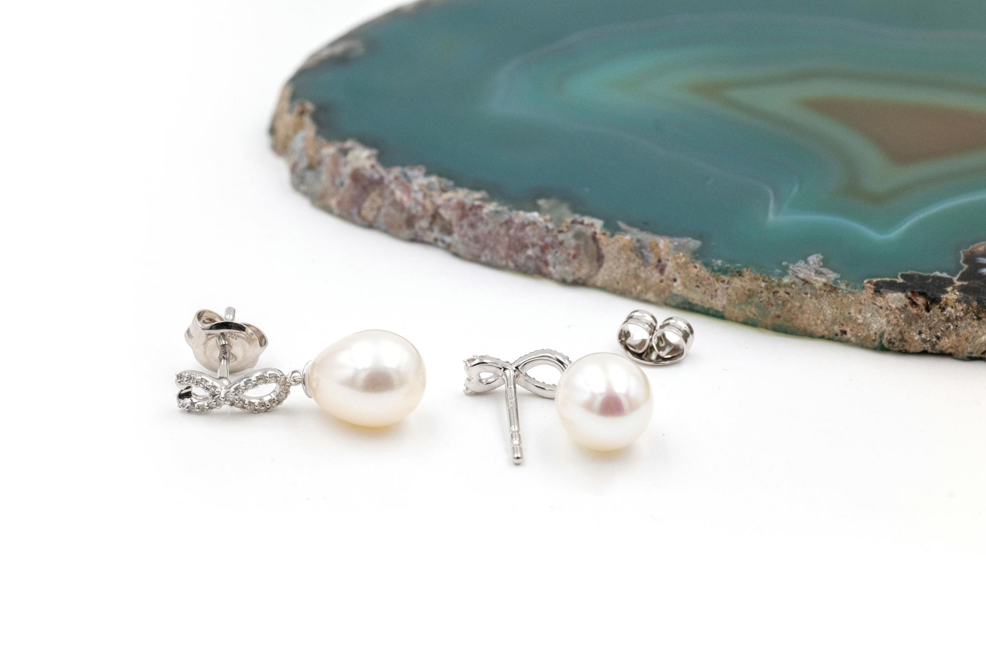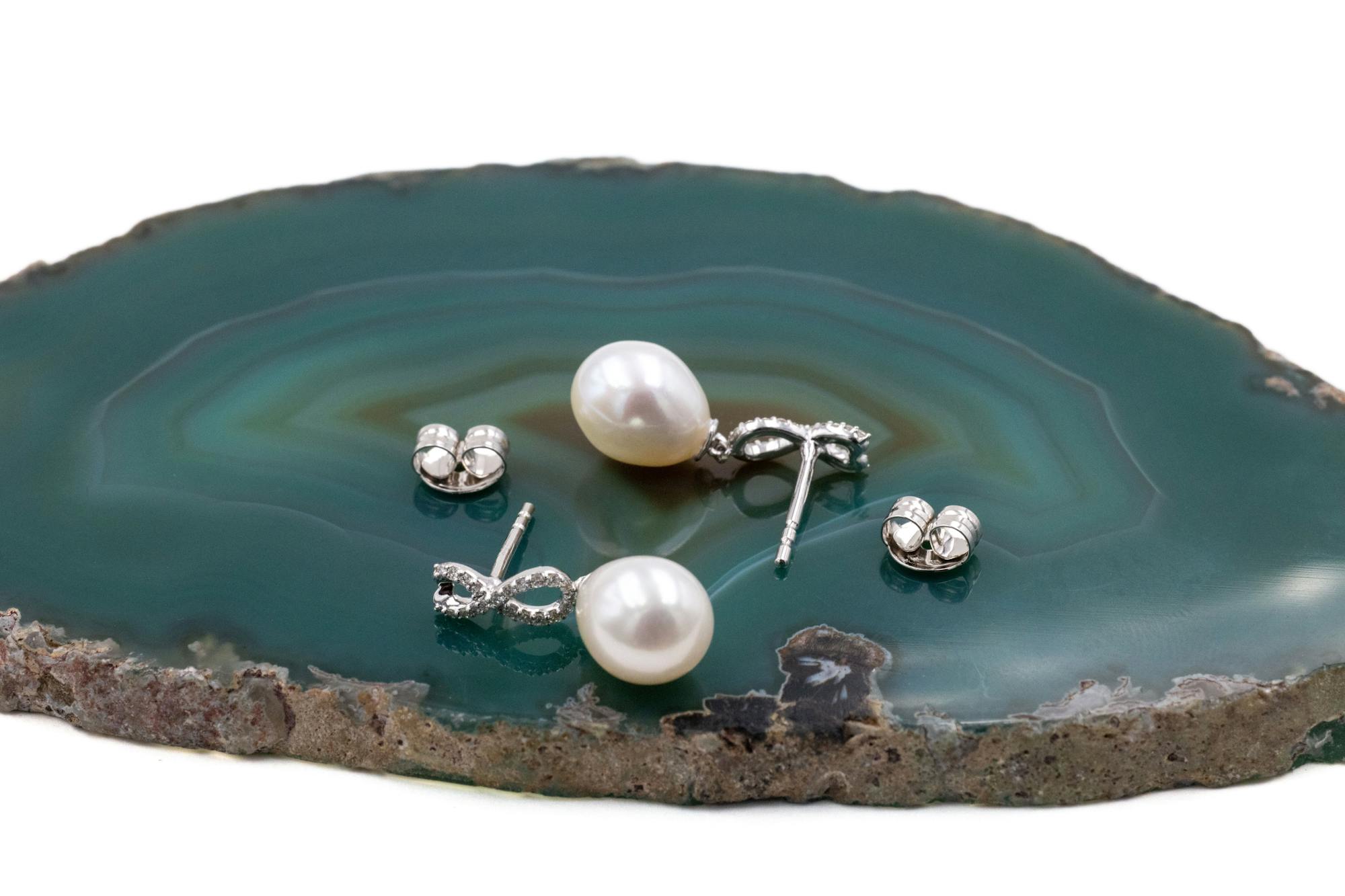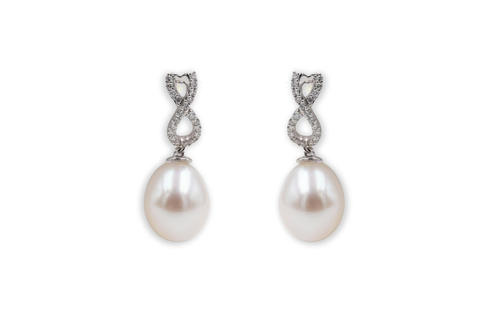 Shimmering diamond and lustrous pearl combine for timeless and elegant white gold drop earrings with style and symbolism