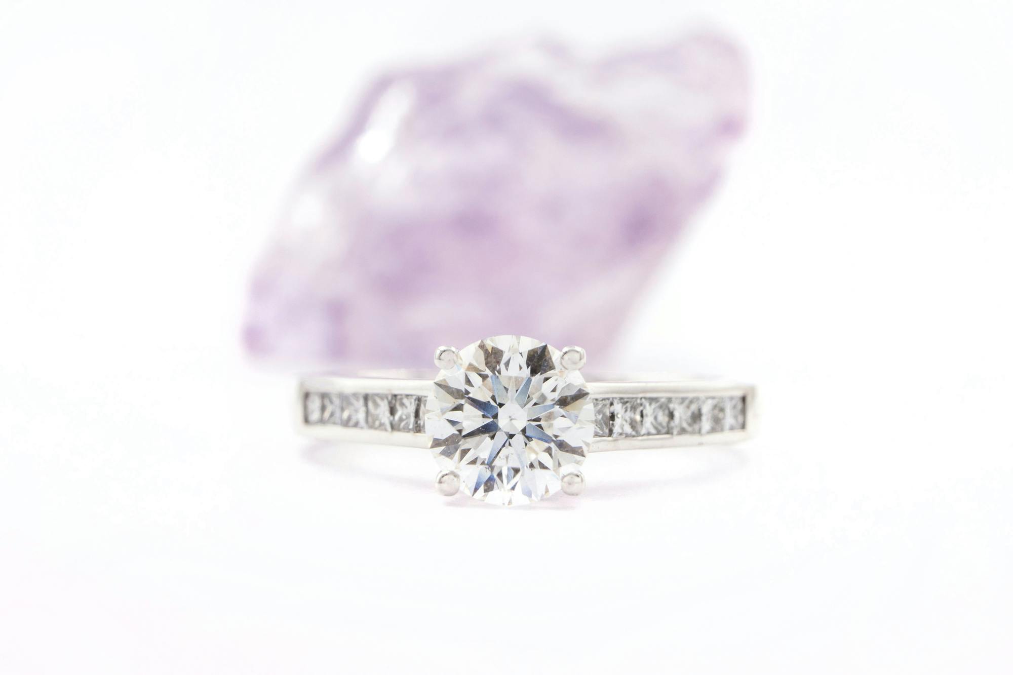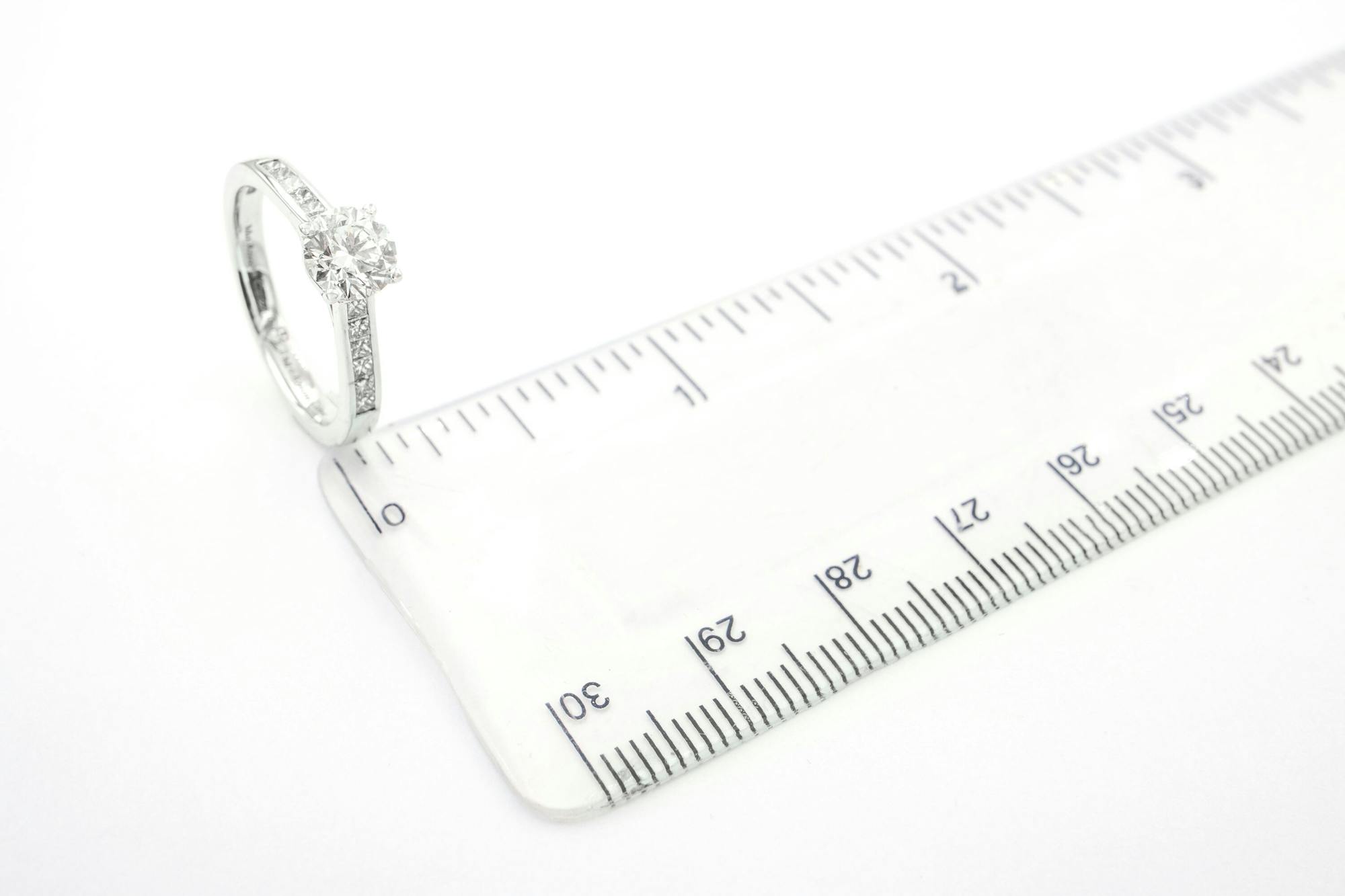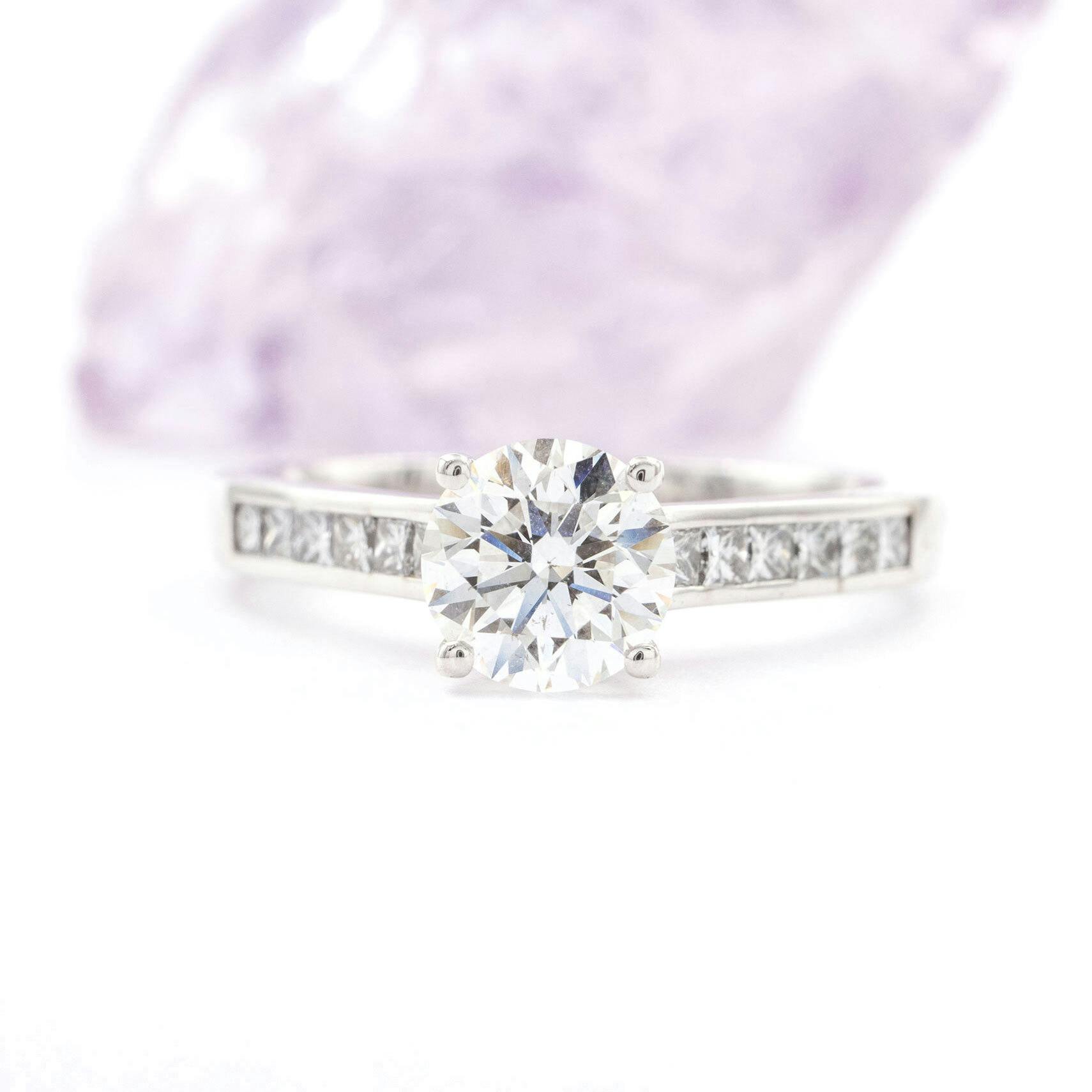 The 12 channel set princess cut natural stones in this ring are 0.02 ct each with G/H colour (near colourless), VS2 clarity (no visible inclusions to naked eye). These stones give an additional 0.24 carats giving this ring 0.99 twc.