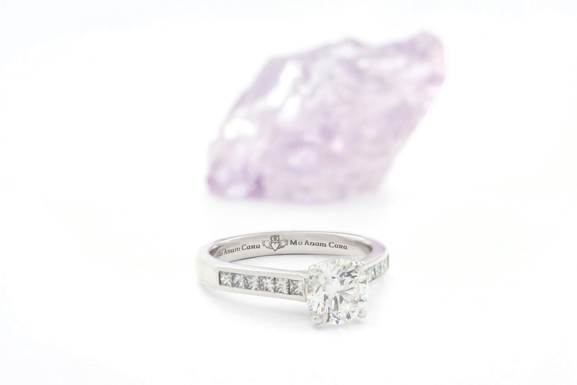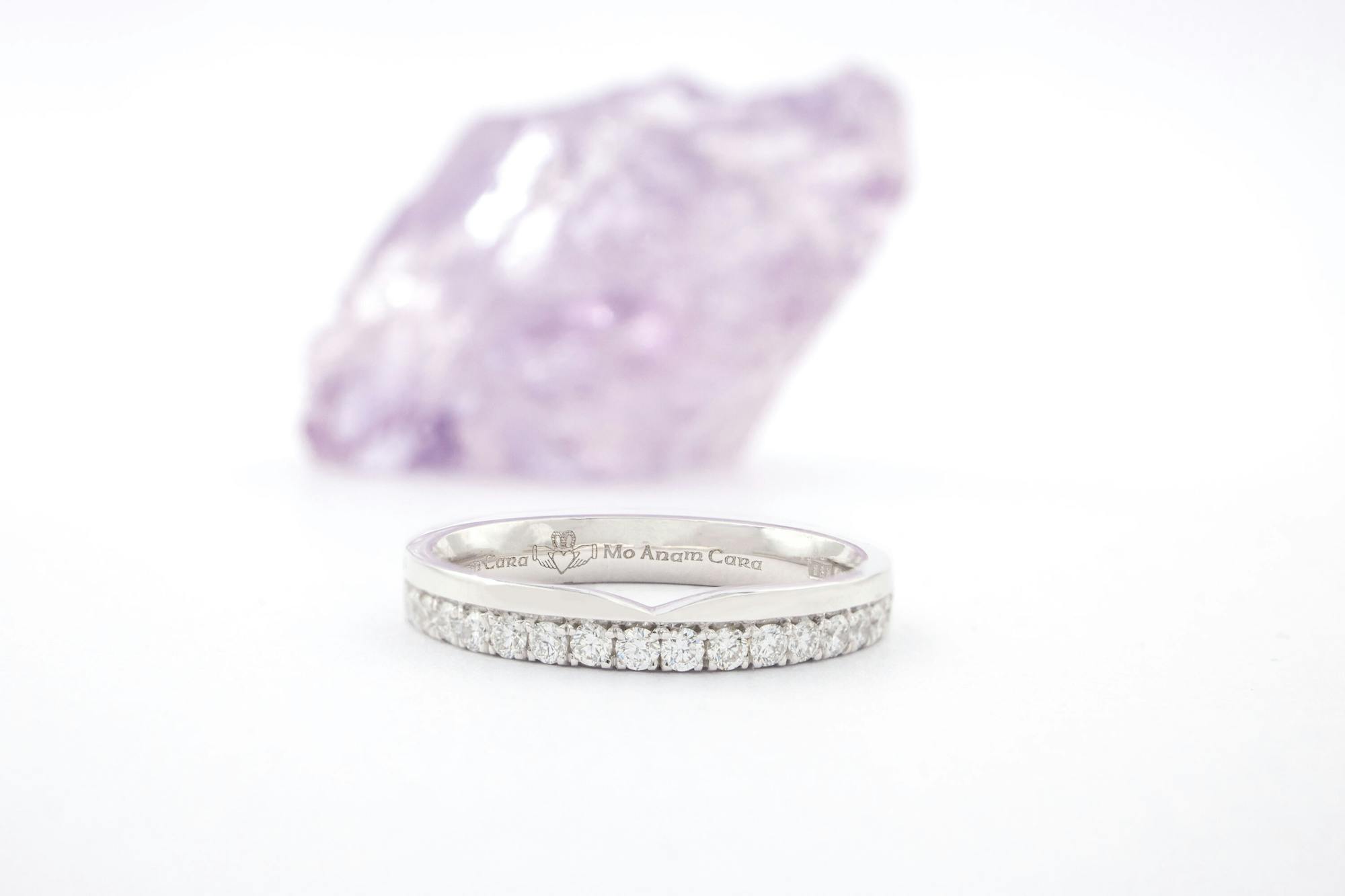This modern ring has a romantic Irish heart, with the inside of the band engraved with the ancient gaelic phrase “Mo Anam Cara”. The celts believed in a soul that radiated about the body. When two people formed a deep and lasting bond, their souls would mingle having found their "Anam Cara," their soul friend. Engraved between this beautiful sentiment is the claddagh, a timeless Irish symbol that promises of love, loyalty and friendship. Share this deep symbolism and meaning with your Anam Cara for a lifetime of love together.