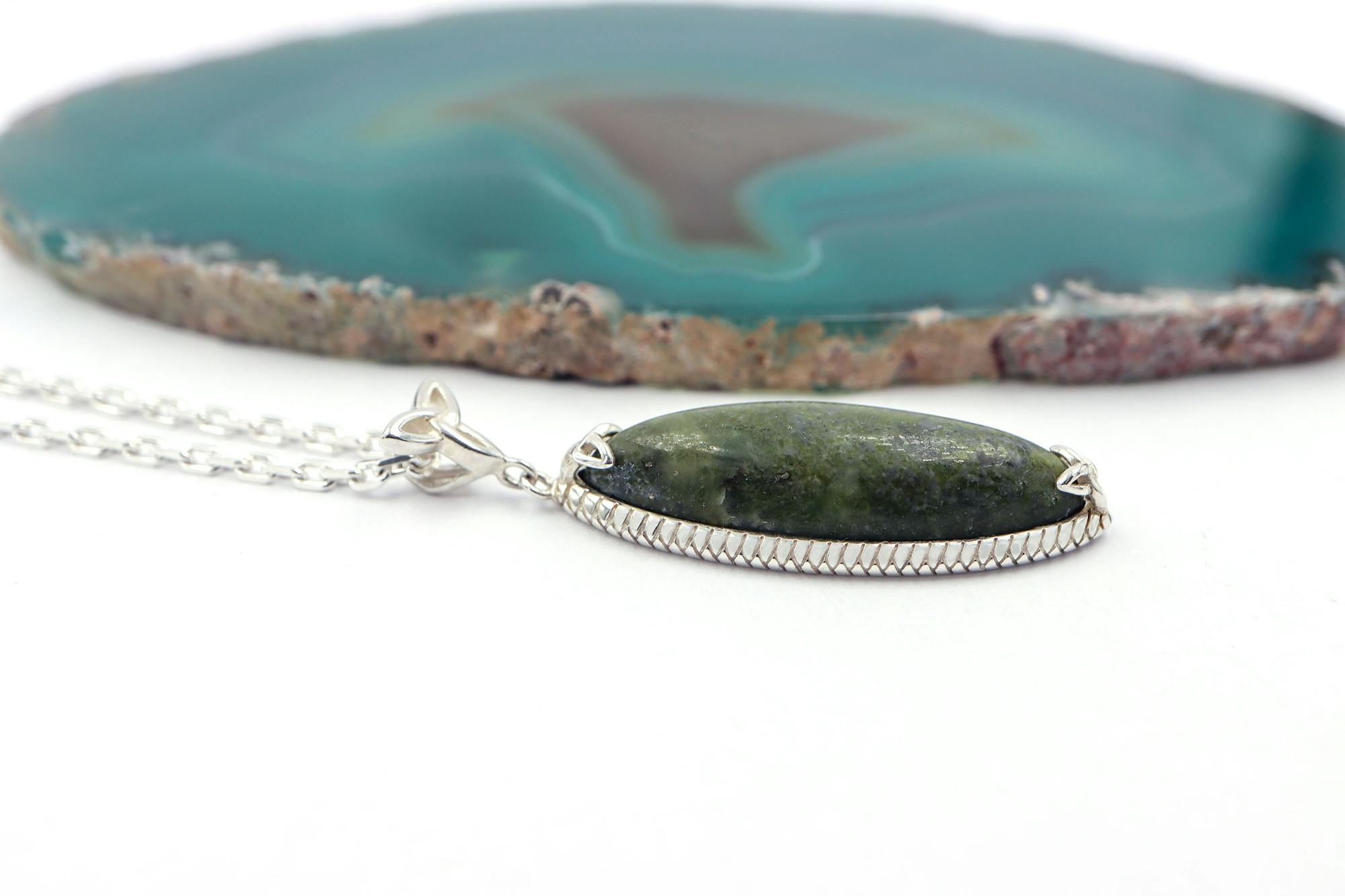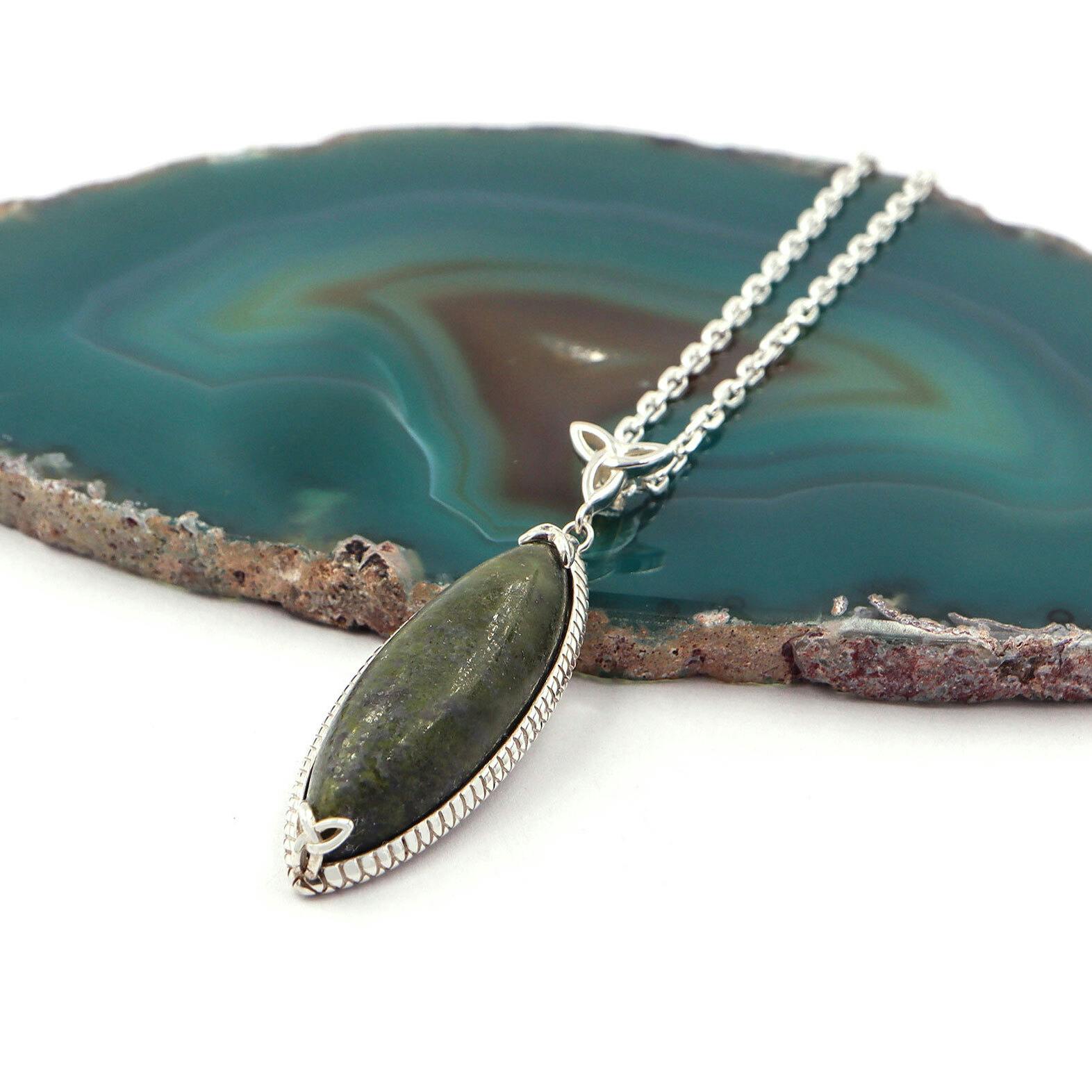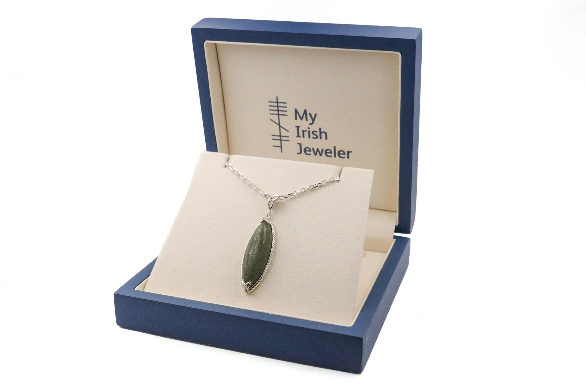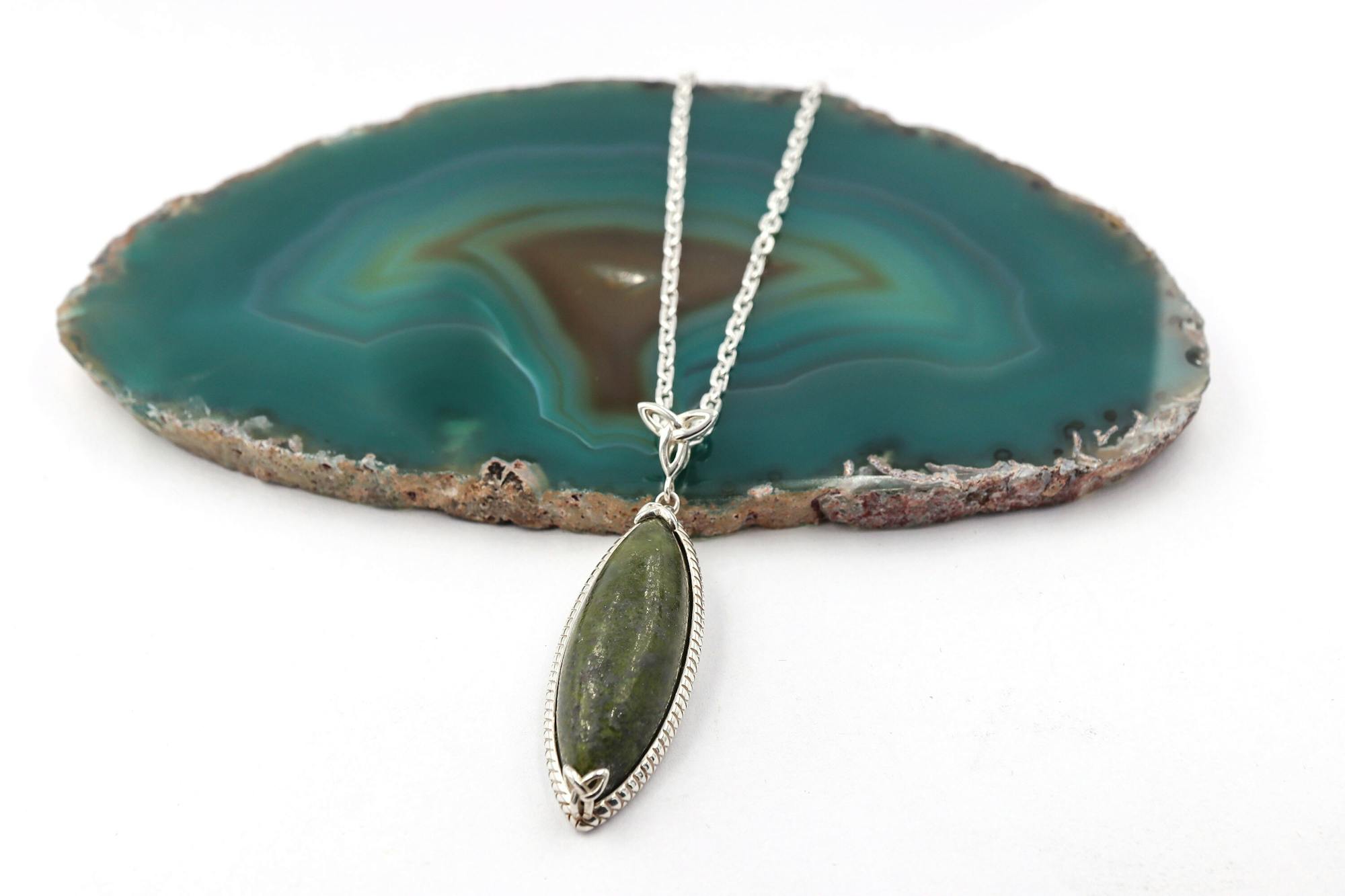 The marquise shaped Connemara marble cabochon is the star of this necklace and earring set, securely set in a sterling silver twisted Celtic wire bezel. Two sterling silver Trinity Knot claws add additional protection to this unique stone, capping it top and bottom.