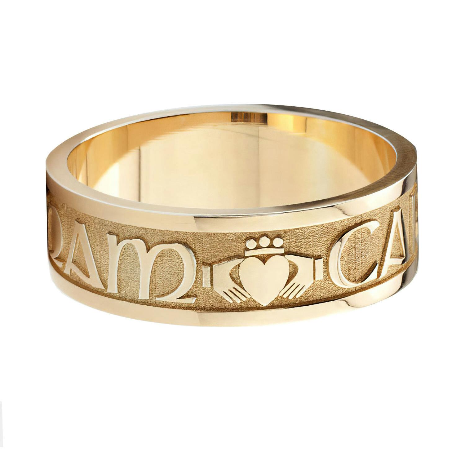 The bands are embossed with gaelic script which reads "Mo Anam Cara", a phrase we know today as "My Soul Mate". The ancient Celts believed that when two individuals formed a deep and lasting bond their souls would mingle. Each person had found their "Anam Cara", or soul friend. This lovely sentiment is enhanced by the heart and hands of the Claddagh that punctuates the script. A centuries old, cherished Irish symbol of love, loyalty, and friendship that looks beautiful against the matte background finish, framed by polished trims.