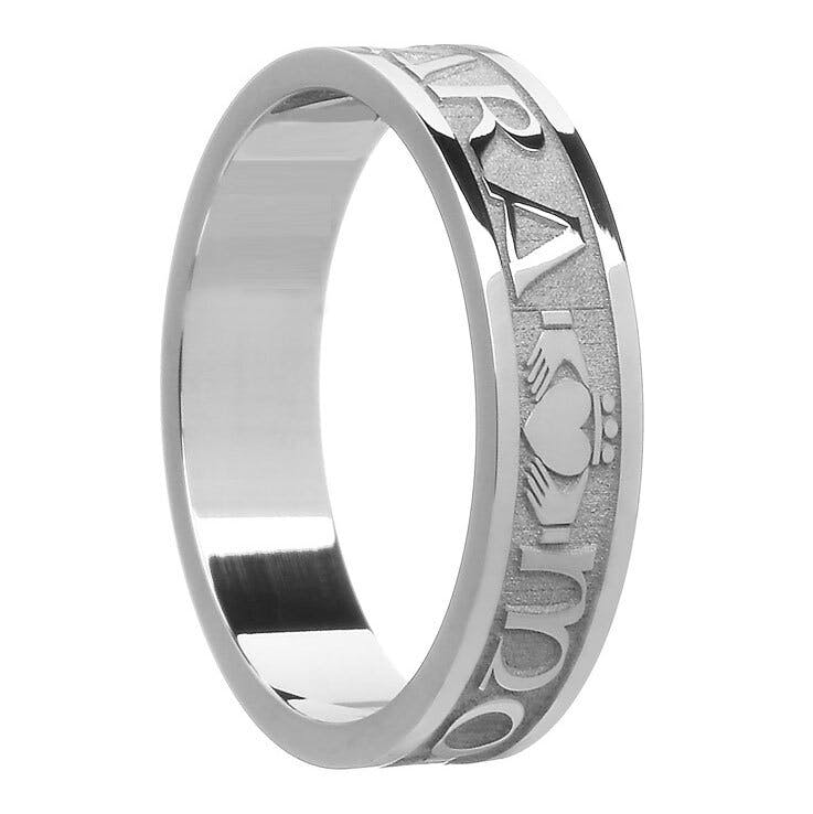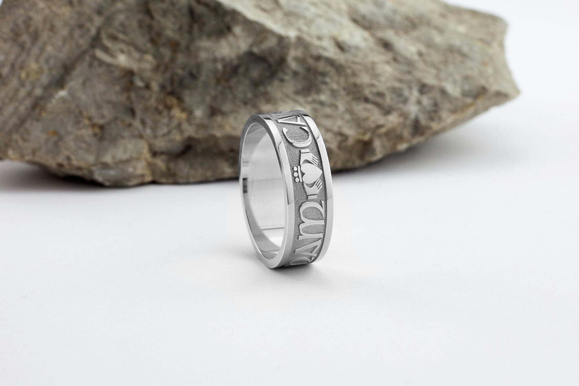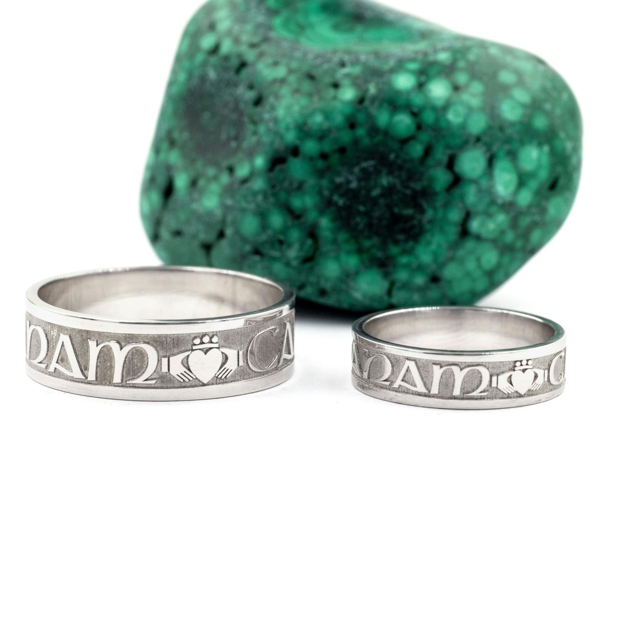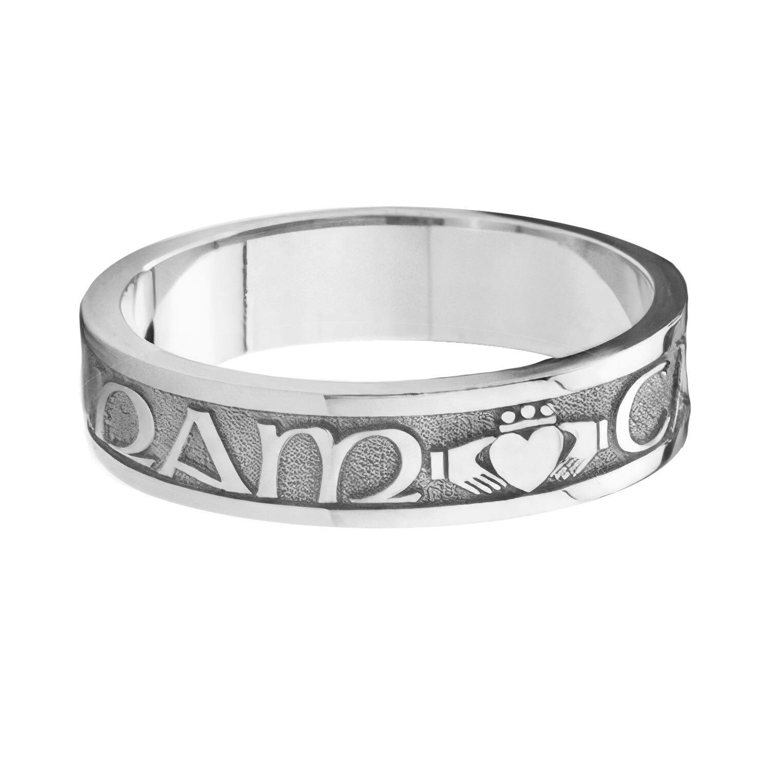 The bands are embossed with gaelic script which reads "Mo Anam Cara", a phrase we know today as "My Soul Mate". The ancient Celts believed that when two individuals formed a deep and lasting bond their souls would mingle. Each person had found their "Anam Cara", or soul friend. This lovely sentiment is enhanced by the heart and hands of the Claddagh that punctuates the script. A centuries old, cherished Irish symbol of love, loyalty, and friendship that looks beautiful against the matte background finish, framed by polished trims.