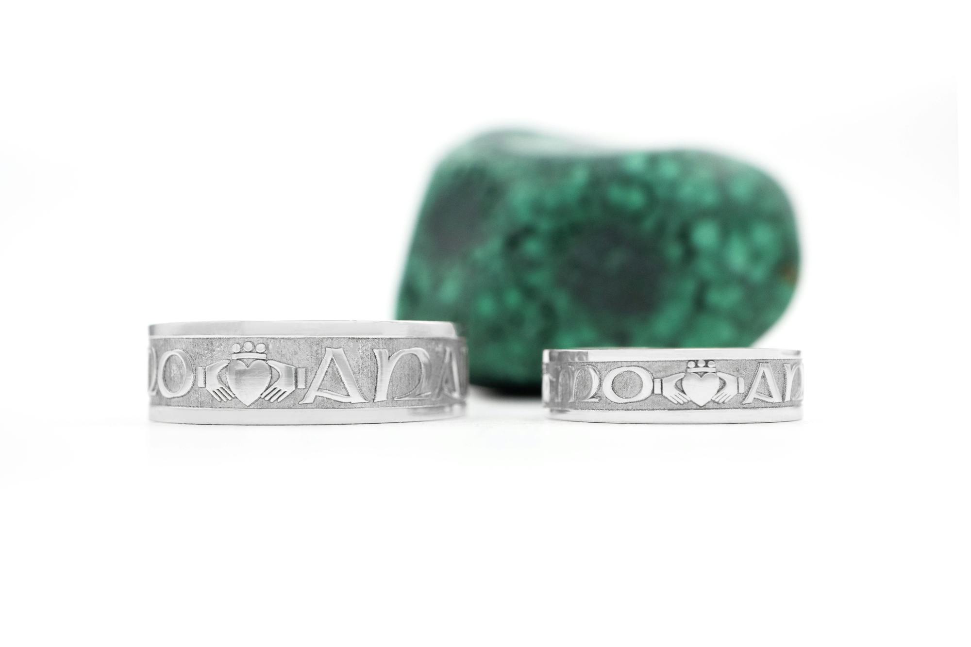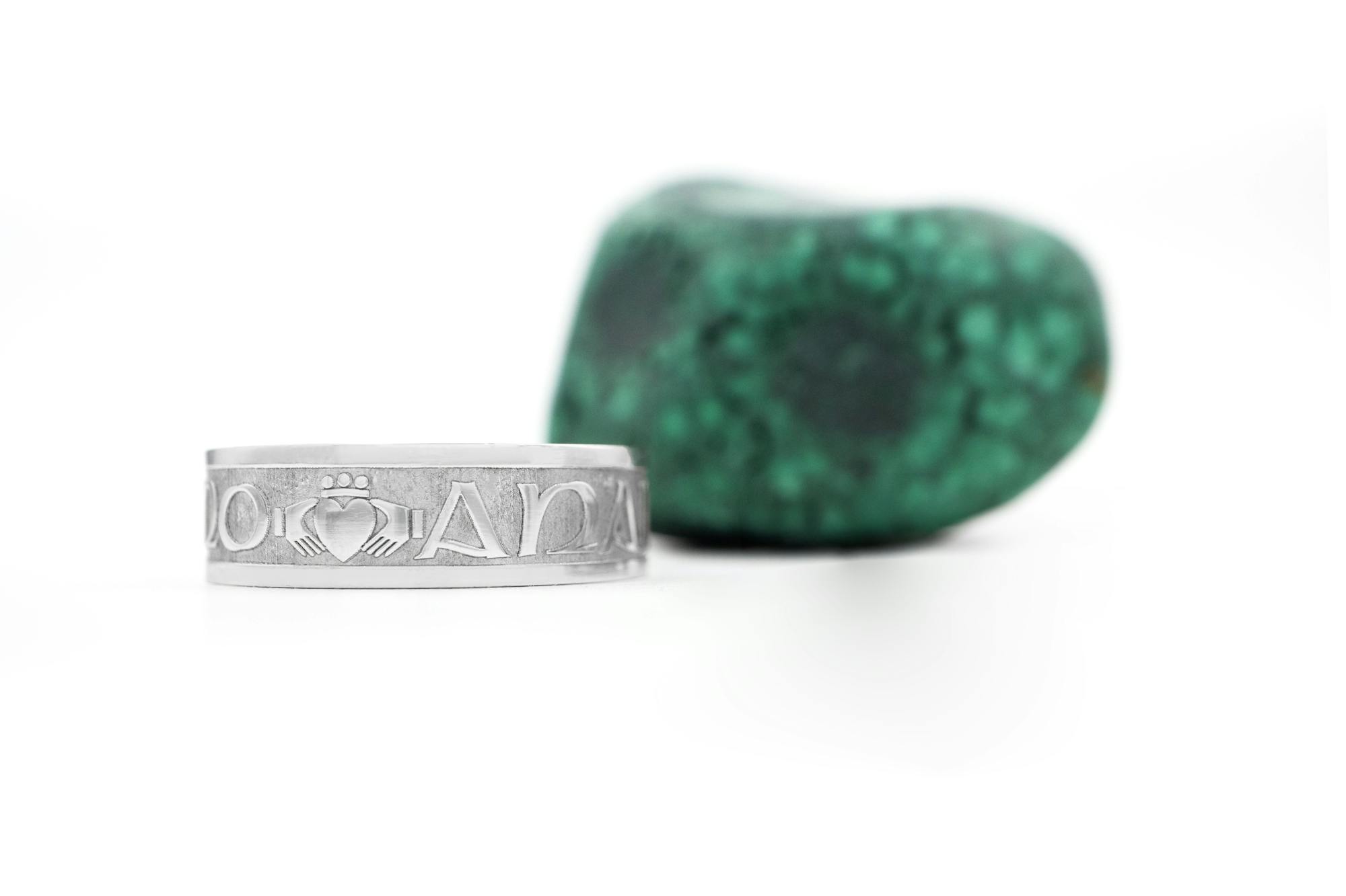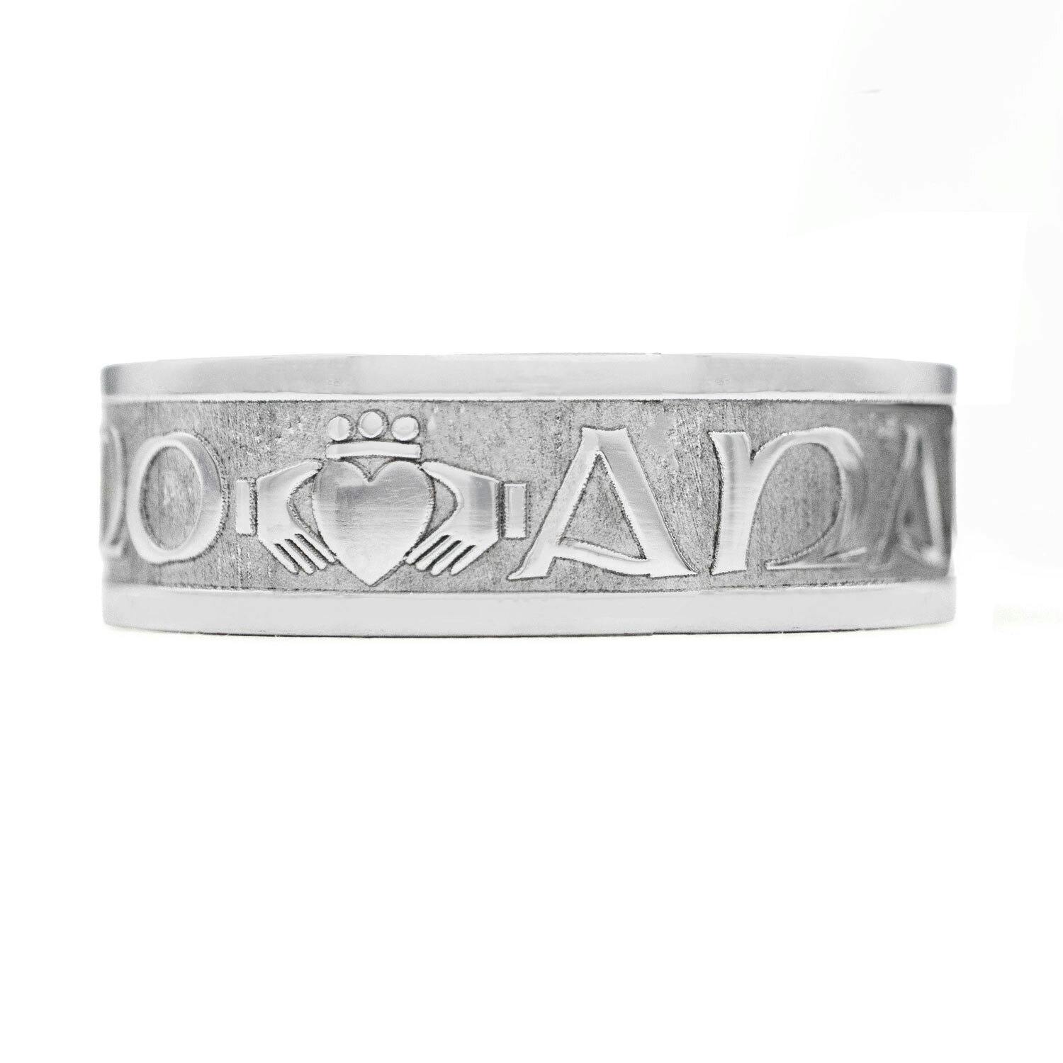 The band is embossed with gaelic script which reads "Mo Anam Cara", a phrase we know today as "My Soul Mate". The ancient Celts believed that when two individuals formed a deep and lasting bond their souls would mingle. Each person had found their "Anam Cara", or soul friend. This lovely sentiment is enhanced by the heart and hands of the Claddagh that punctuates the script. A centuries old, cherished Irish symbol of love, loyalty, and friendship.