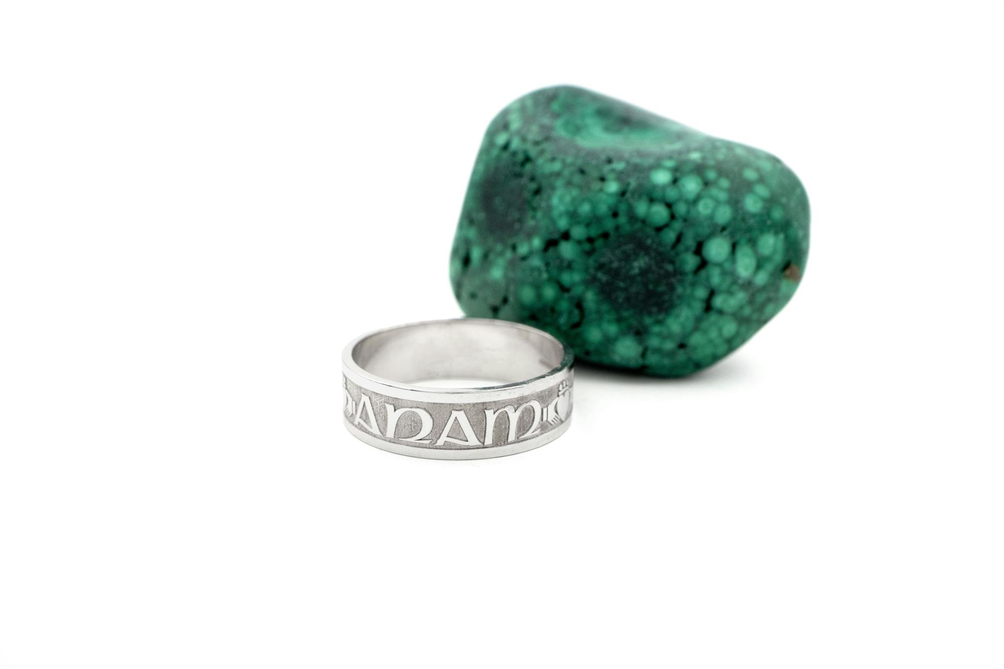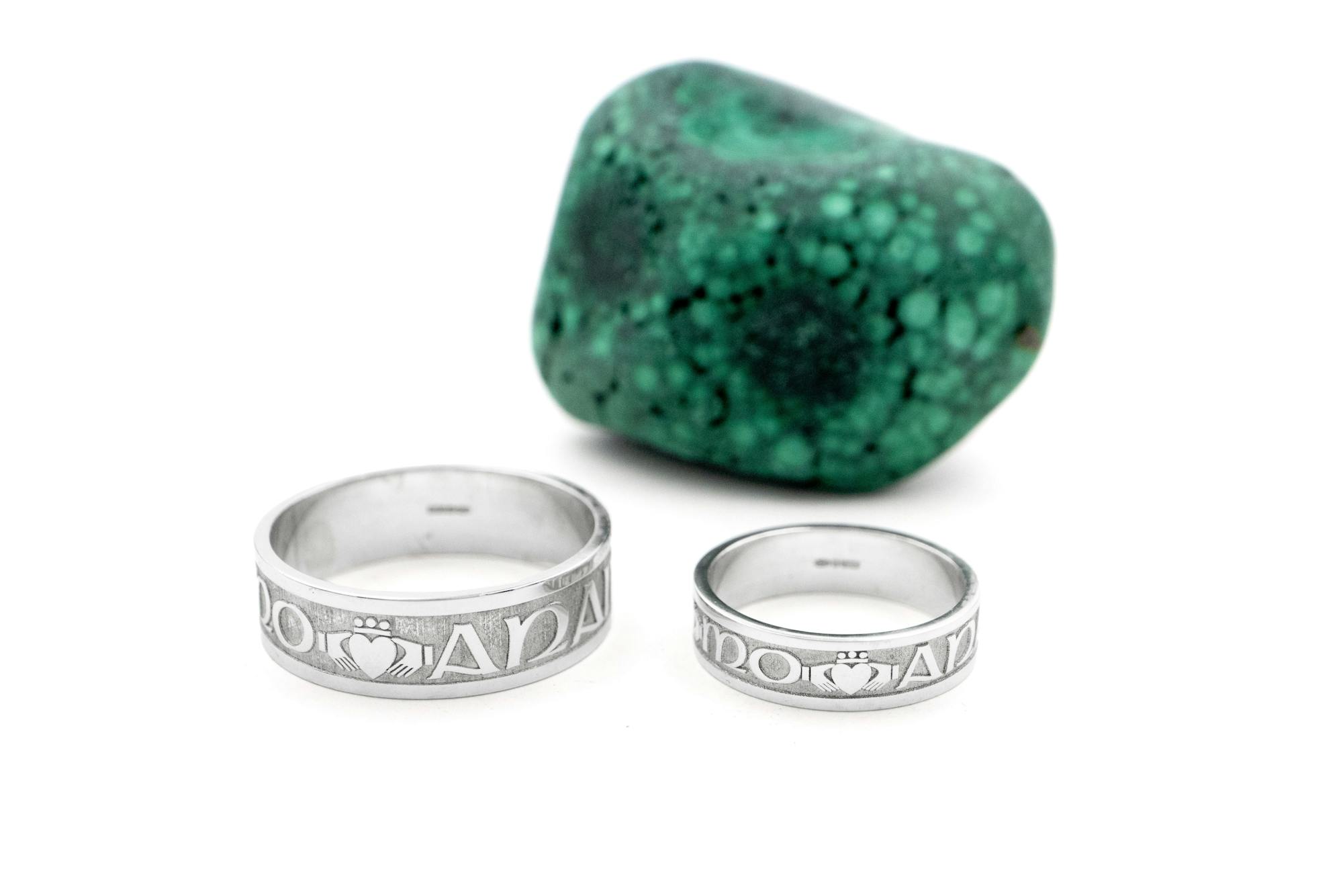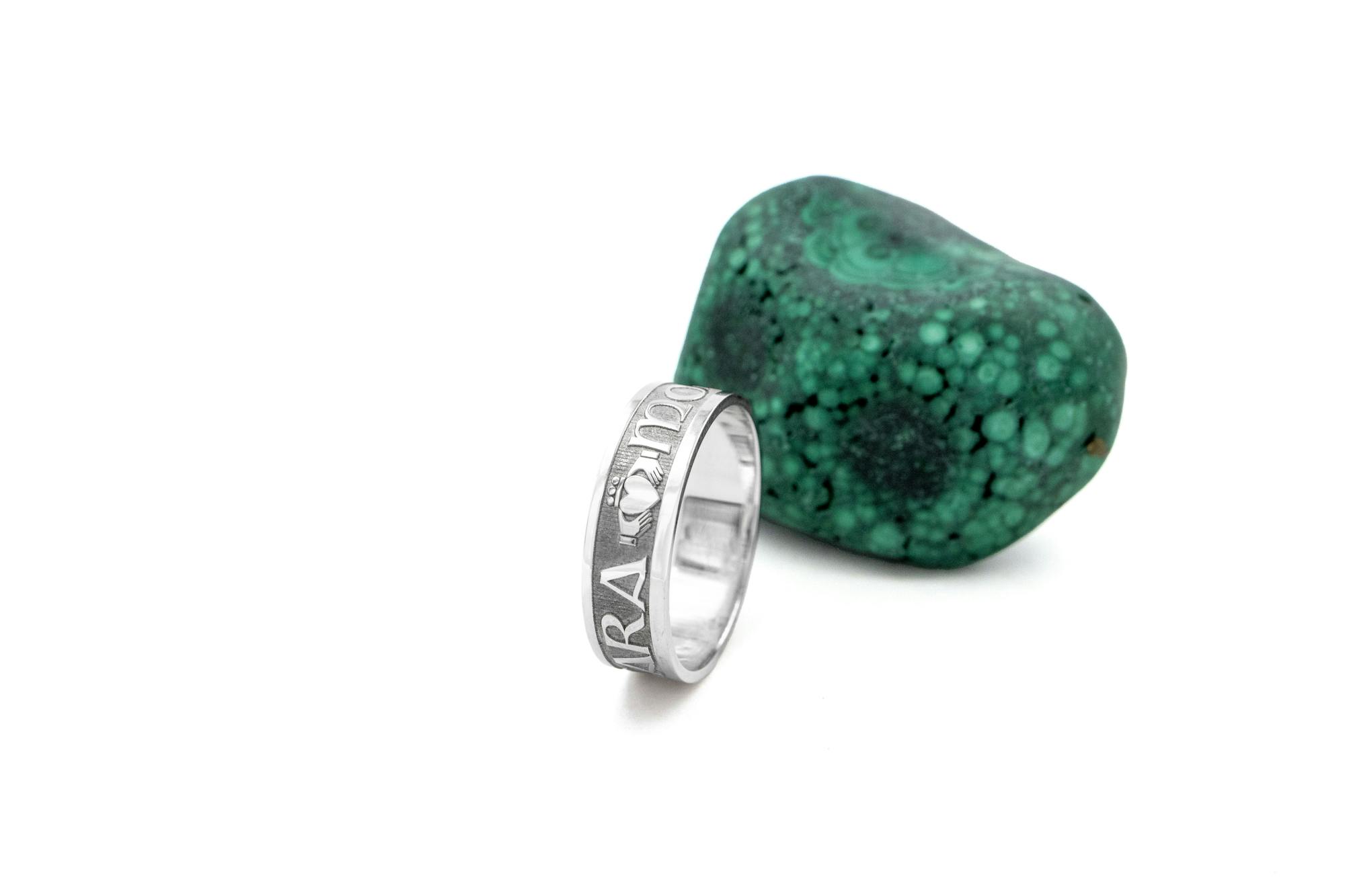 The band is embossed with gaelic script which reads "Mo Anam Cara", a phrase we know today as "My Soul Mate". The ancient Celts believed that when two individuals formed a deep and lasting bond their souls would mingle. Each person had found their "Anam Cara", or soul friend. This lovely sentiment is enhanced by the heart and hands of the Claddagh that punctuates the script. A centuries old, cherished Irish symbol of love, loyalty, and friendship.