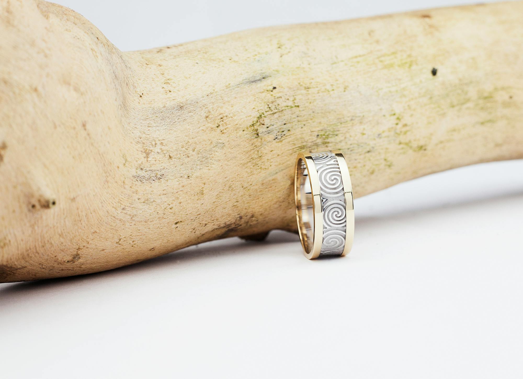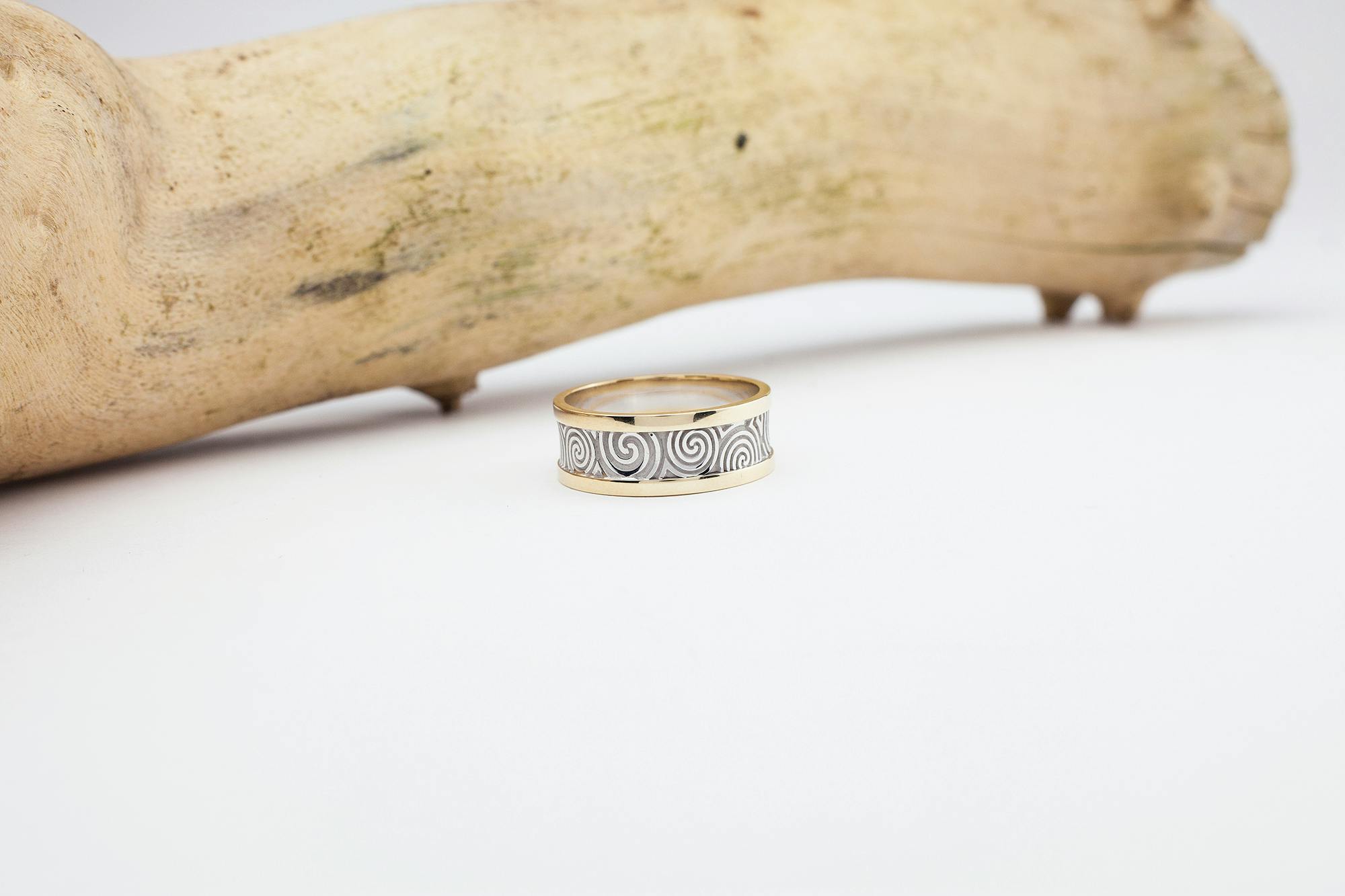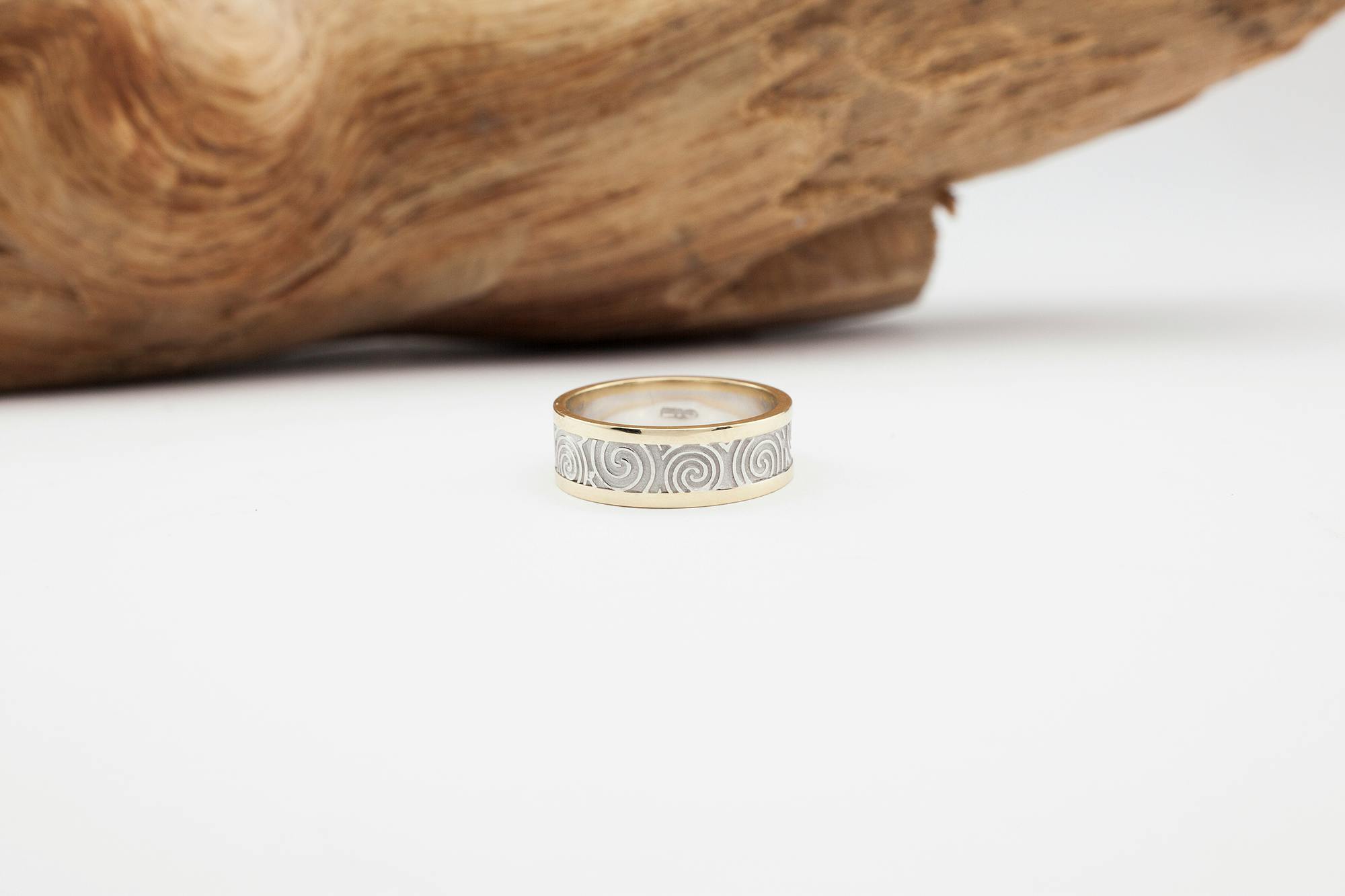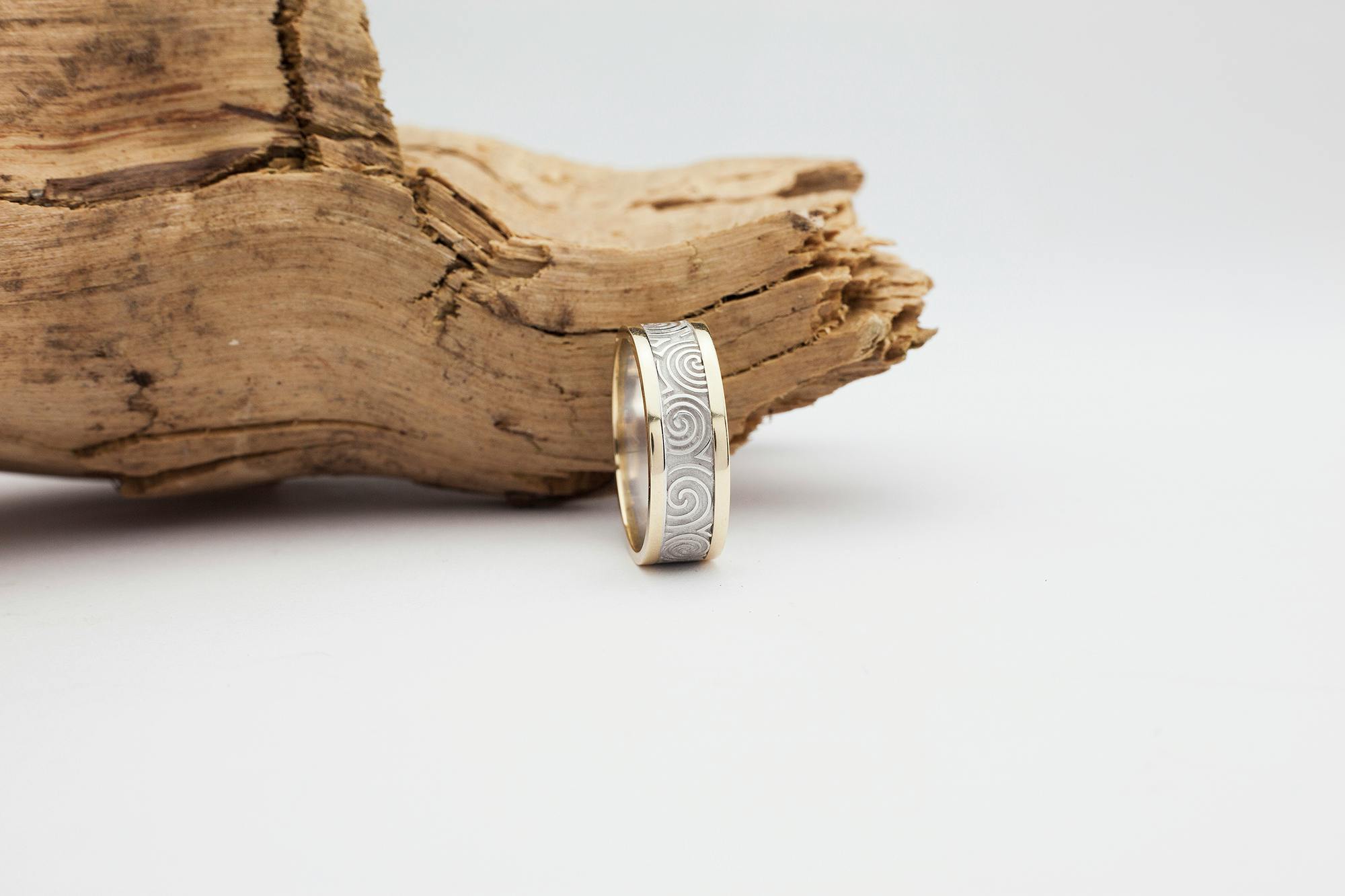 The ring can be made in two widths, 6.5 mm and 8.1 mm. The larger band sizes shows off the spiral design to perfection.