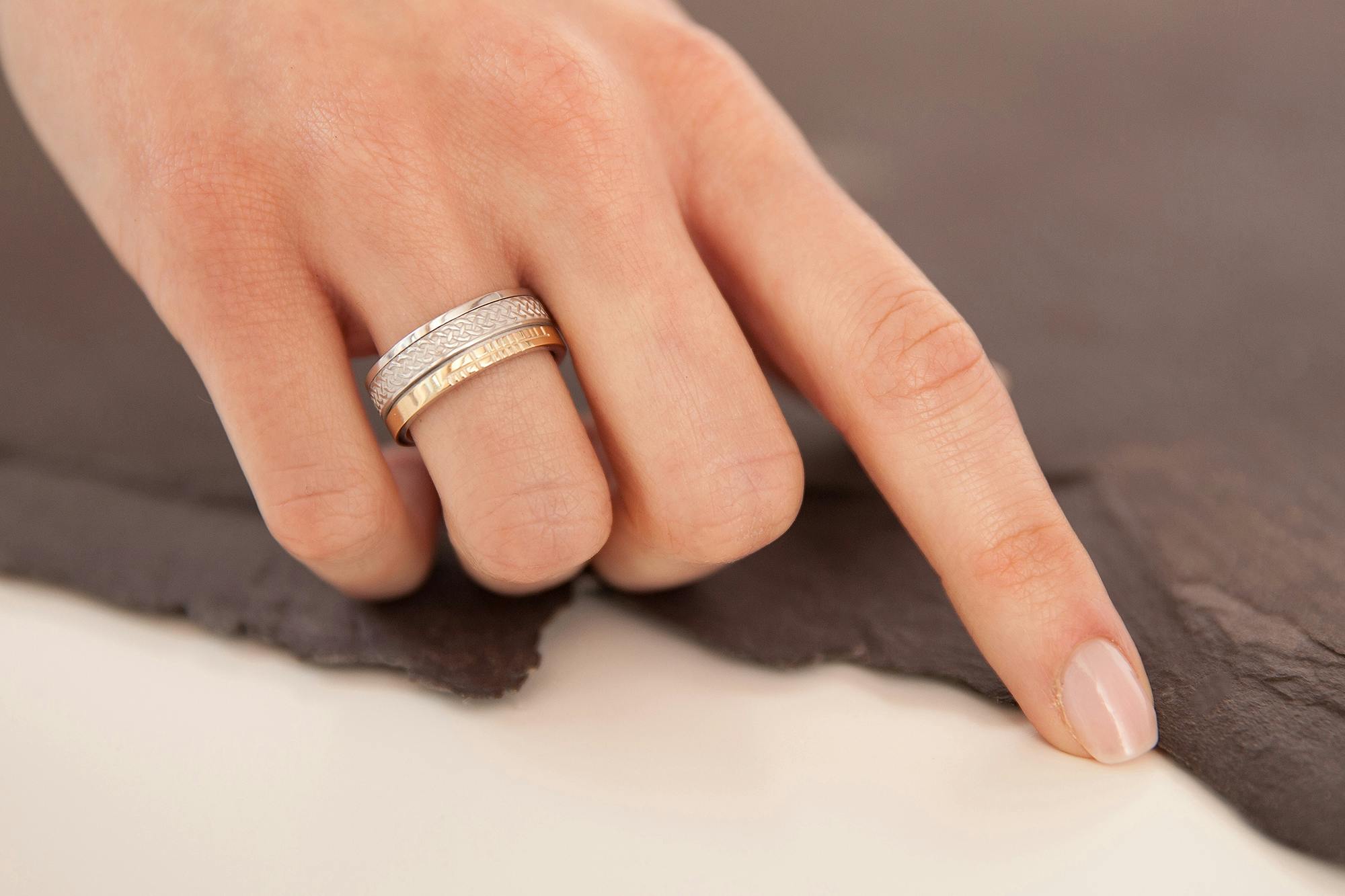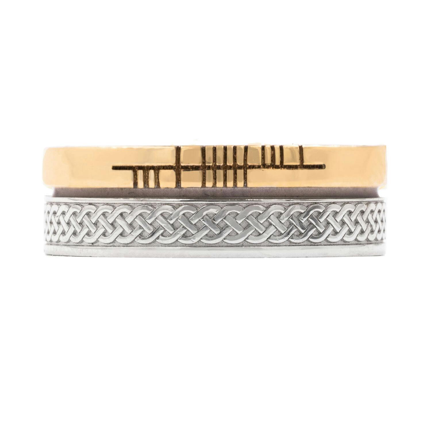 This striking inscription is complimented and contrasted by the intricate, fluid beauty and wonderful symbolism of the Celtic Knot. Inspired by one of Ireland's most famous decorative designs, Celtic Knots adorn some of our most revered treasures. Representing strength, connection, and beauty this wonderful history and symbolism makes this design a perfect choice for a ring of significance.