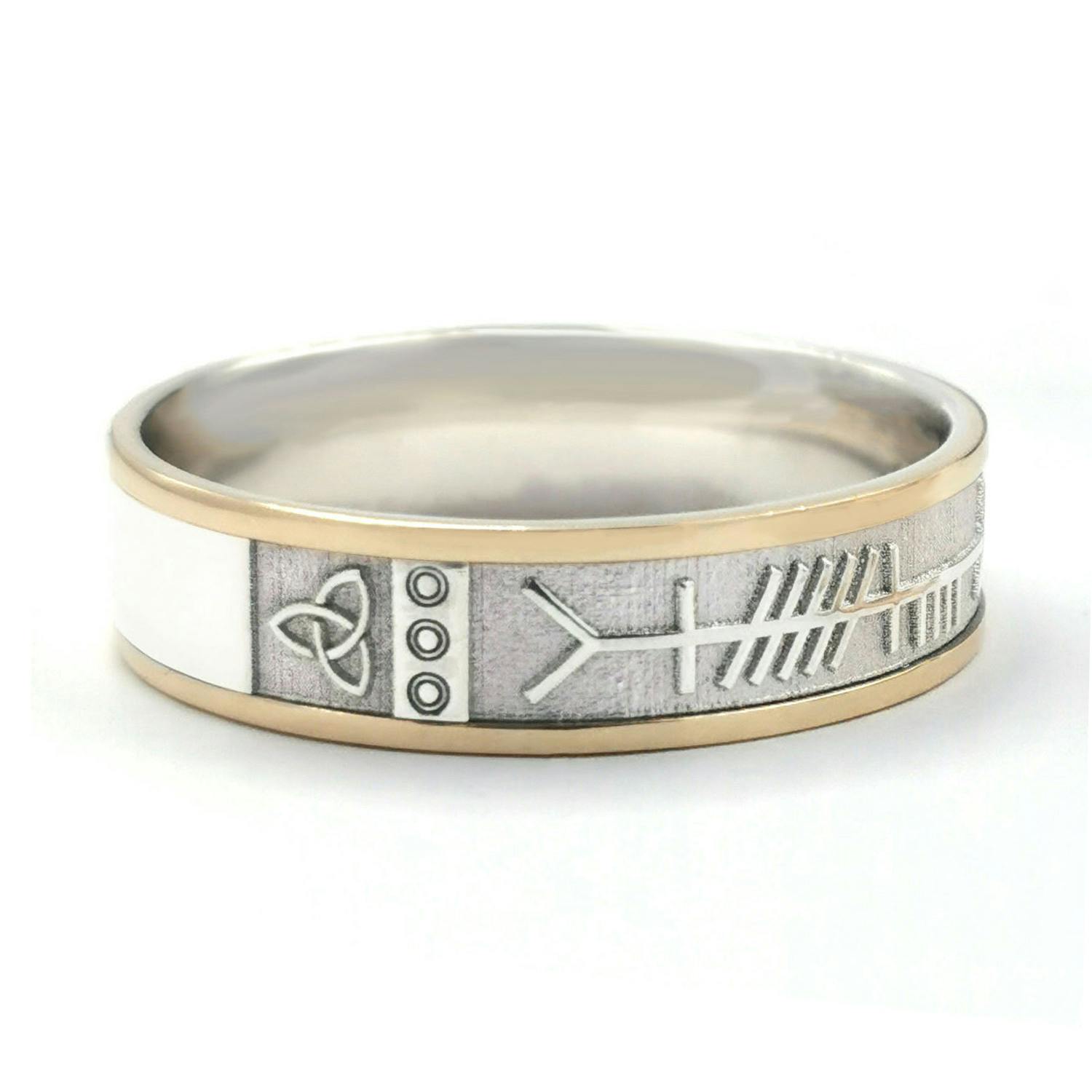 This ring features the phrase "Mo Anam Cara" in Ogham script. 'Mo Anam Cara' is gaelic for 'My Soul Mate'. Ogham is the earliest form of writing in the Irish language. With such wonderful meaning, this ring is perfect for your special day. This ring has been so finely executed there are simply no flaws.