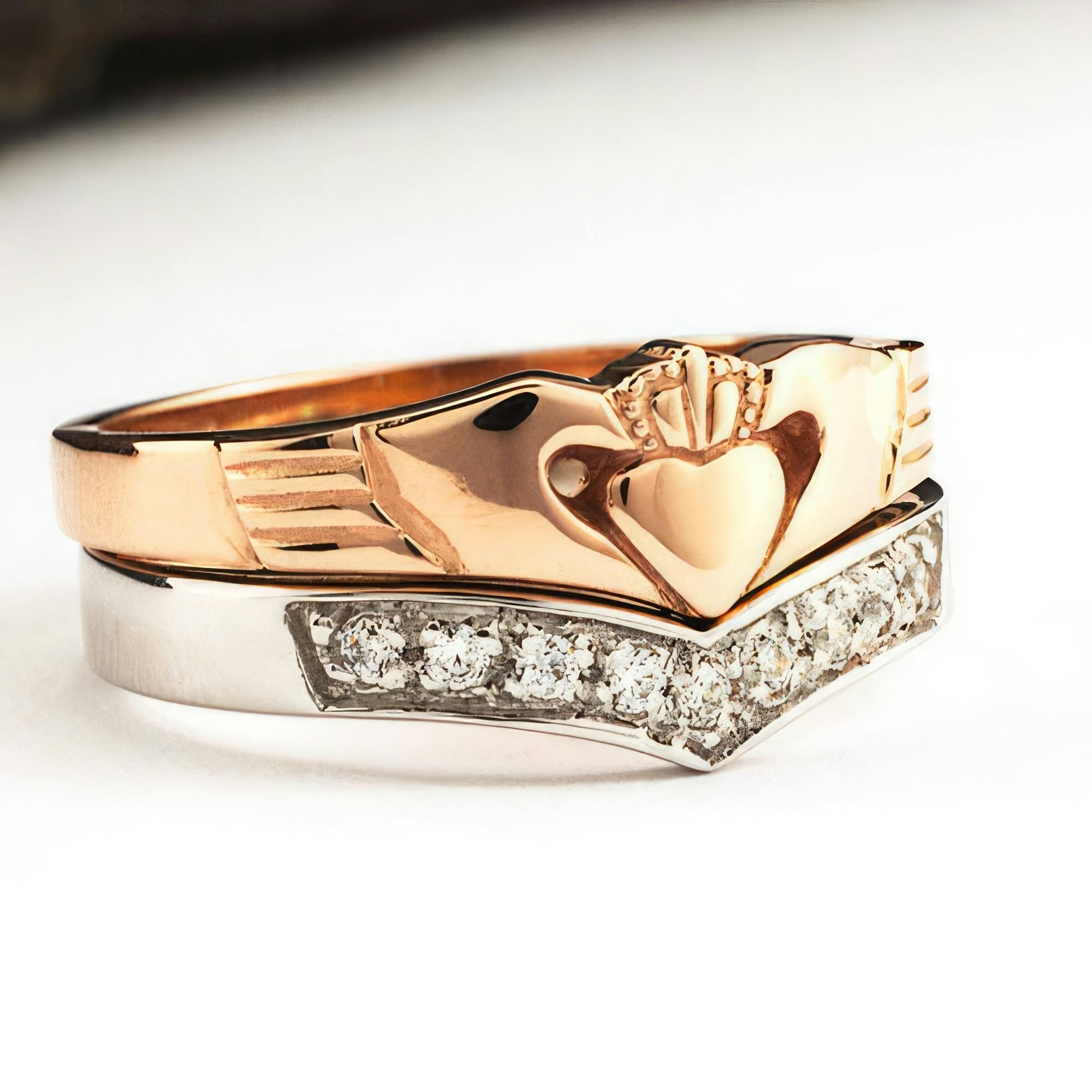 If you are looking for something different, this set is sure to attract your attention. The Claddagh ring is set in 10k rose gold. Rose gold has a very distinctive colour, subtle and tasteful, yet easy on the eye. The matching 10k white gold diamond wishbone band blends in perfectly and enhances the rose gold claddagh ring.