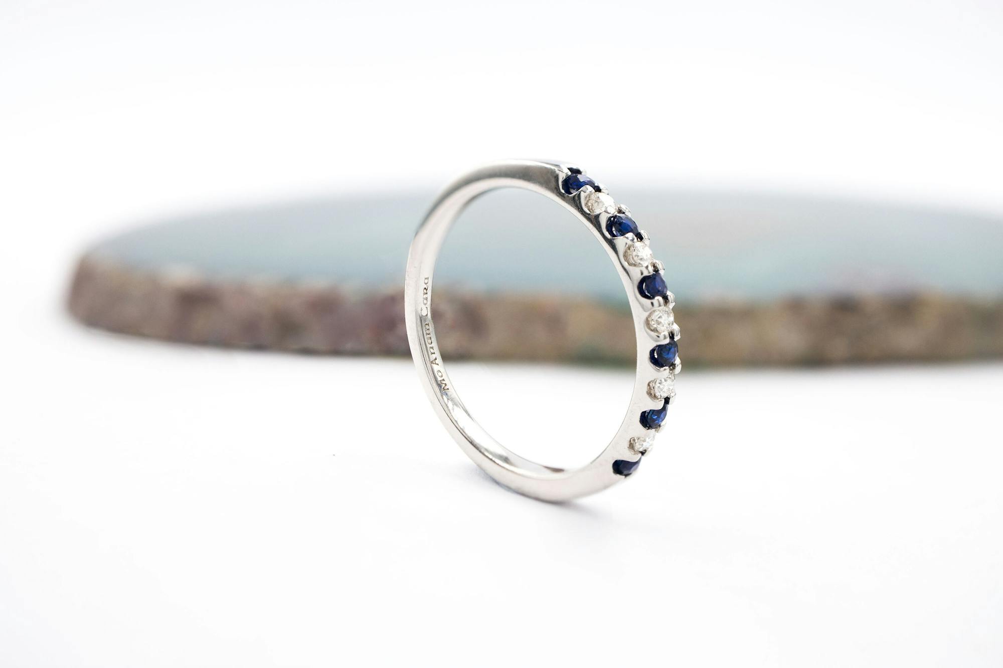Set with six stunning sapphire stones and five sparkling diamonds, this anniversary-style band has been carefully crafted to nestle perfectly against the contours of the halo engagement ring. Designed for each other, they ensure a comfortable fit that can be worn proudly every day of your life together.