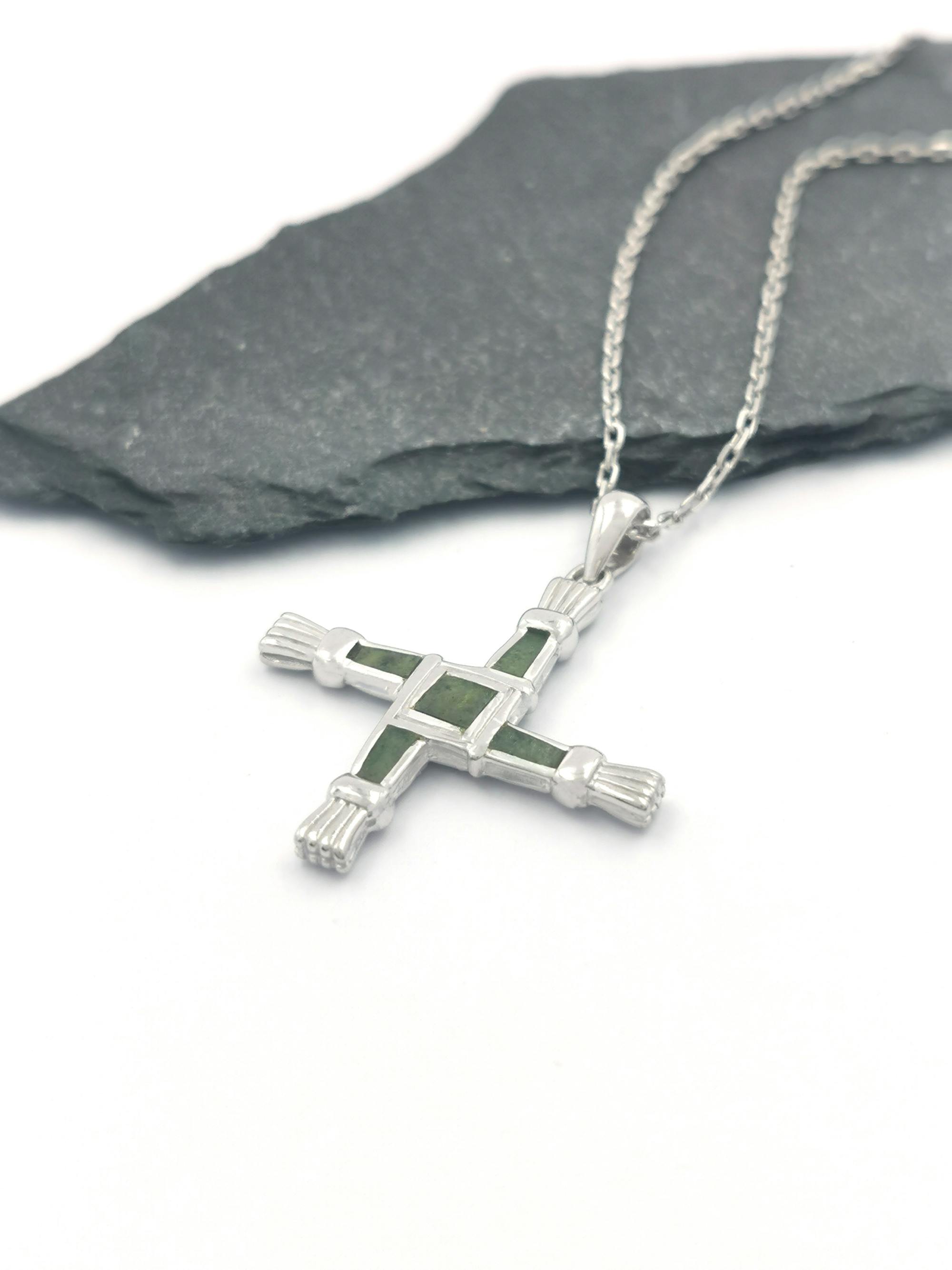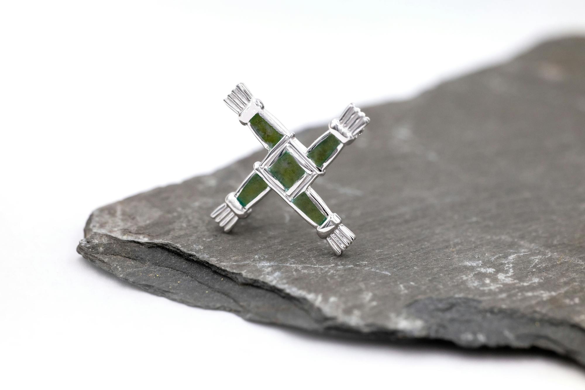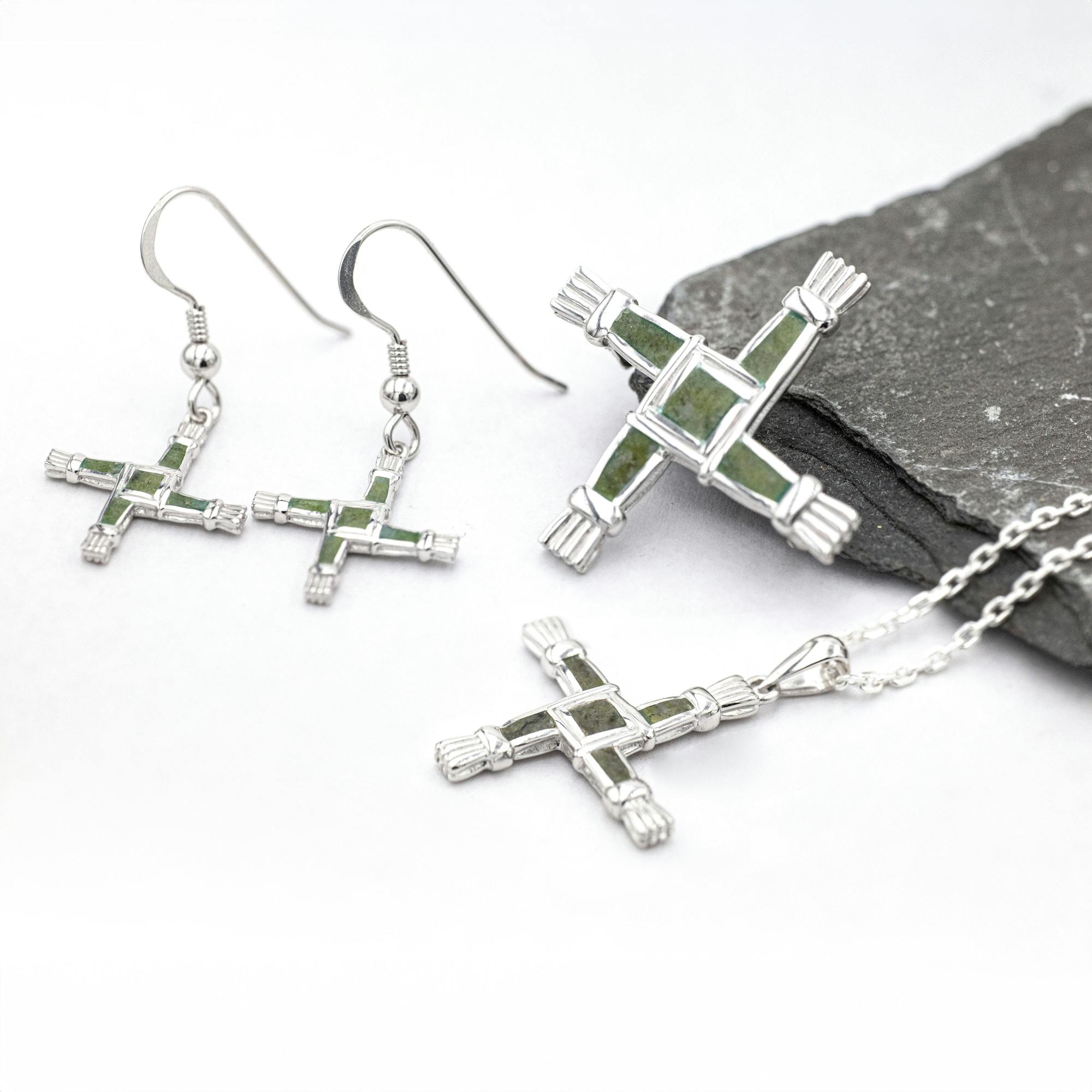 Faithful to the form of a traditional rush cross, with a textured feel, these striking matching pieces have been carefully crafted in solid sterling silver and set with iconic Irish Connemara marble. The instantly recognisable cross is an ancient design that traces its roots back hundreds of years to Ireland’s female patron saint, and beyond to the Celts and the goddess Brigid.