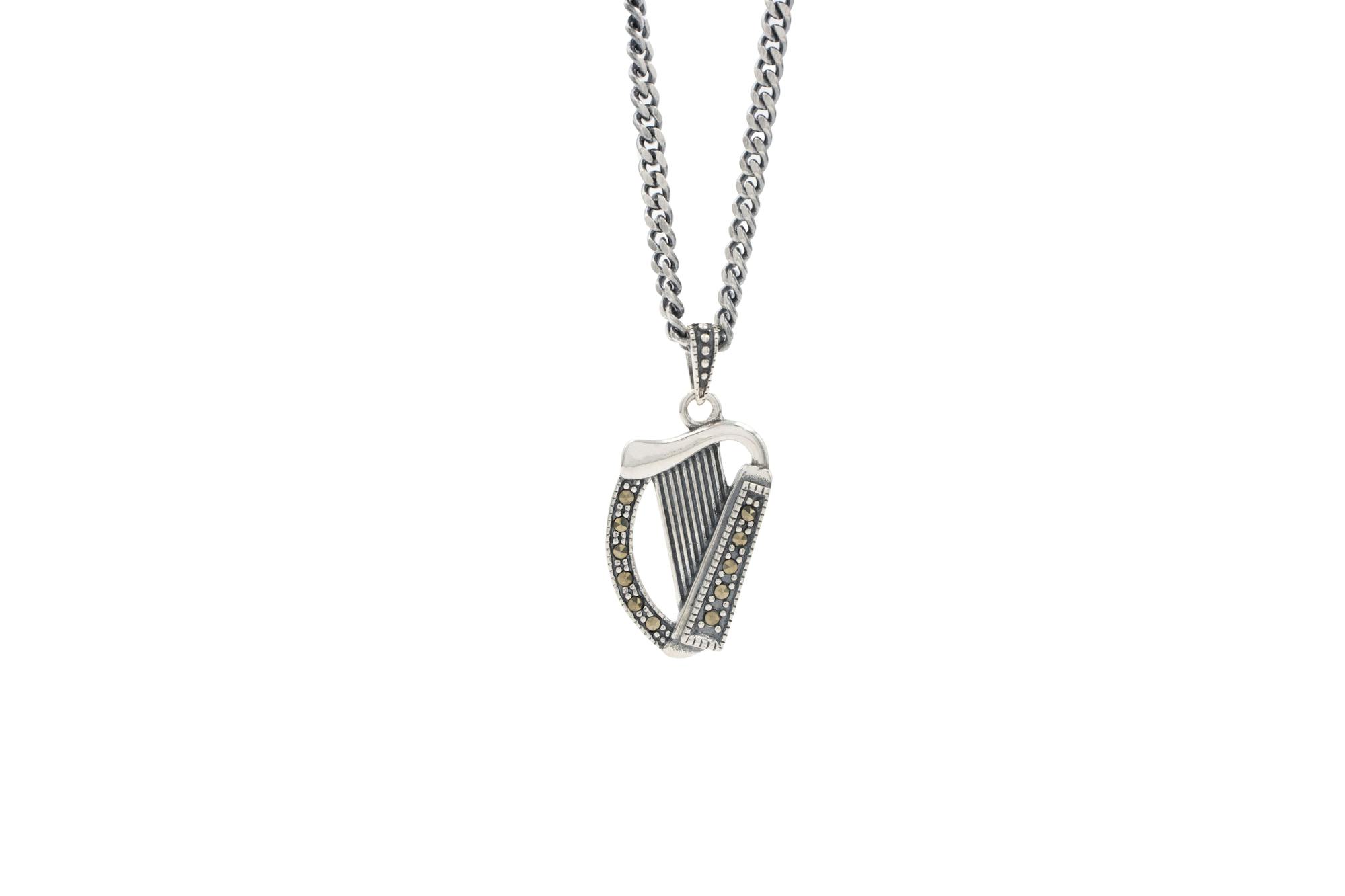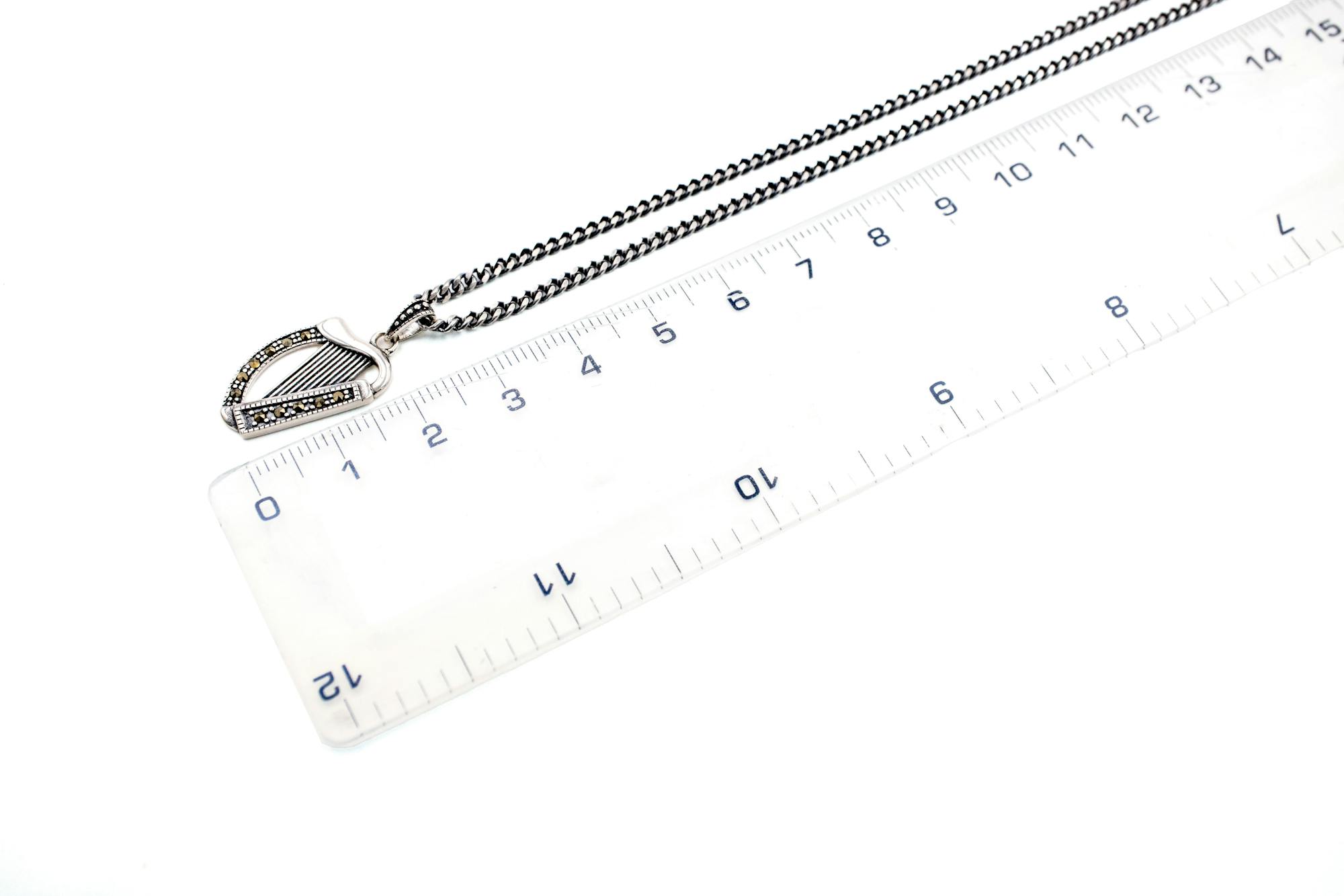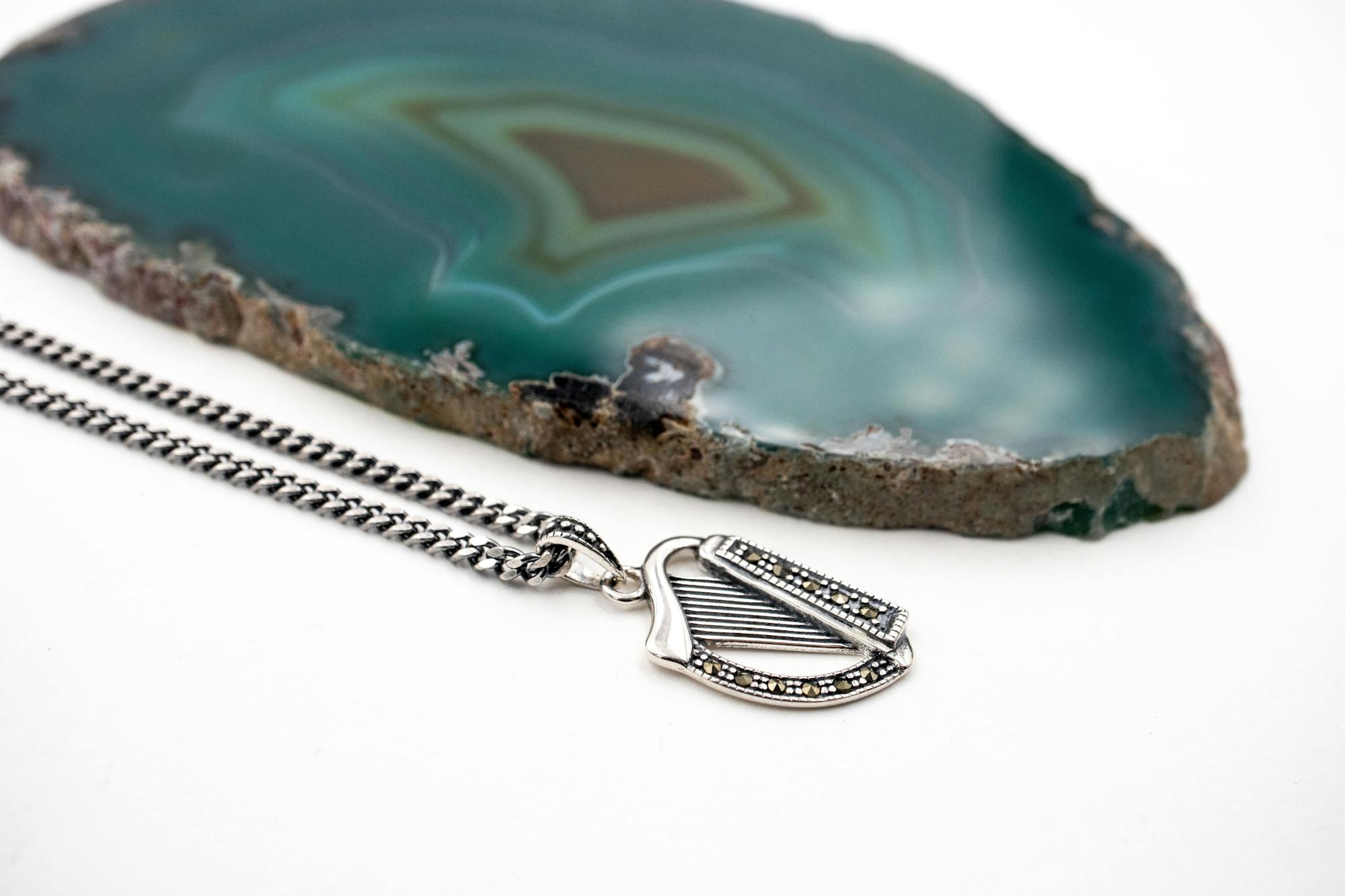This is a stunning sterling silver harp necklace. Beautifully embellished, and studded with glimmering marcasite stones creating a wonderful understated shine.
