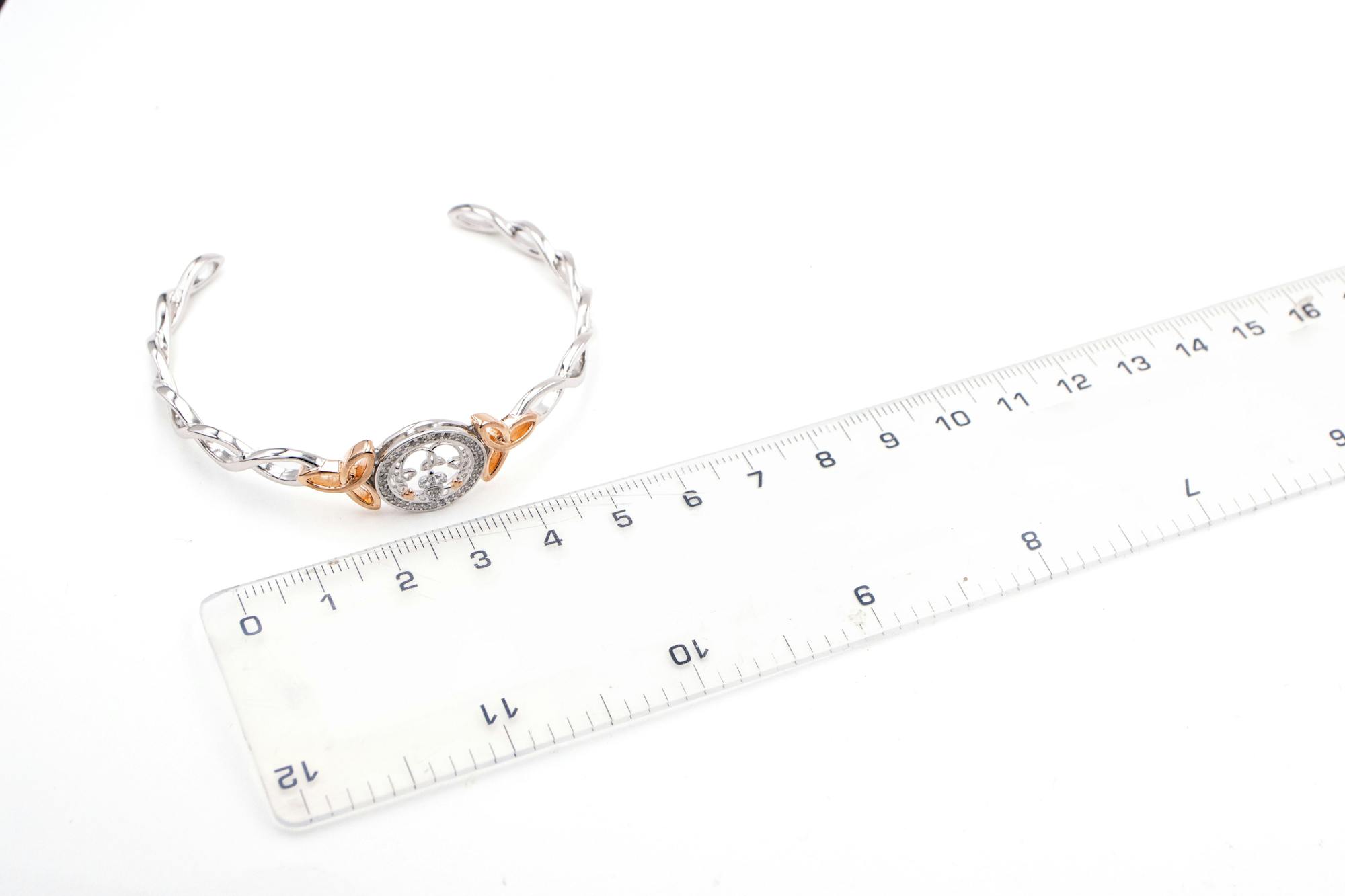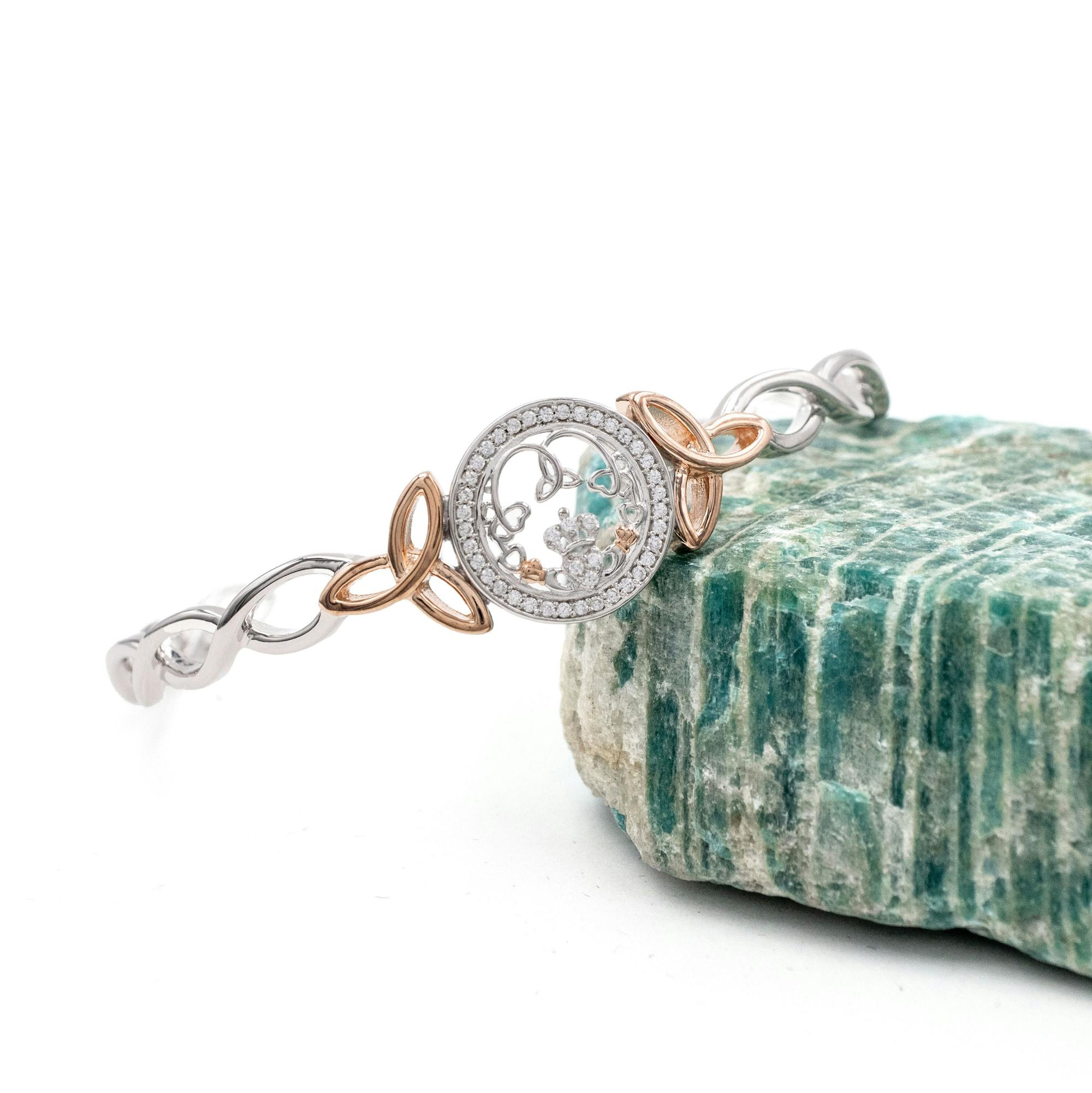 The centre disc features the claddagh emblem which is surrounded by a circle of bright CZ stones. The cuffs on the hands have been rose gold plated to accentuate the design. We have also added two rose gold plated Trinity Knot emblems on the shoulders of the bangle.