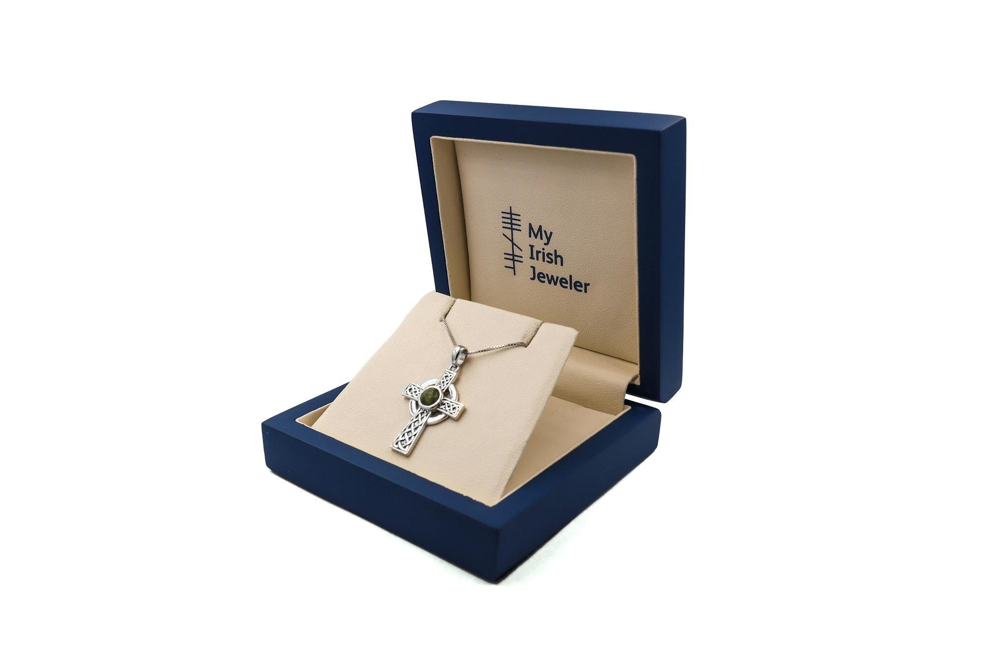 This sterling silver cross is a real work of art with so many layers. Unusually, the Connemara marble stone has been faceted, which means the stone has been cut at minute angels to give a subtle shine and catch the light. The marble is recessed into a rub over setting. You will also notice the area behind beautiful Celtic design has been oxidised or blackened slightly, this has the effect of making the Celtic pattern really stand out. Beautifully crafted with precision.