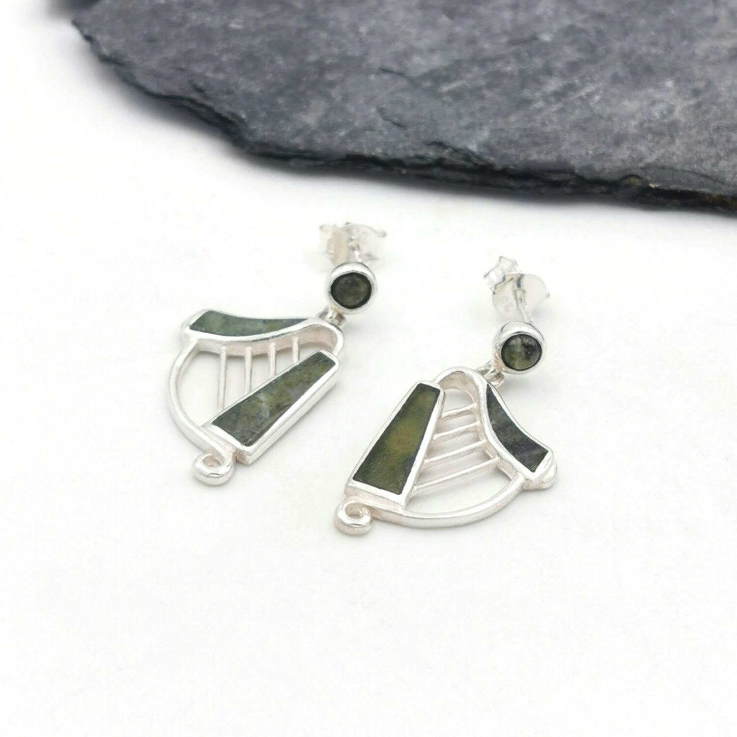Sterling silver Connemara Marble harp earrings. This unique marble is known as the gemstone of Ireland because of its unique green colour. The shade of marble used in these earrings is a deep sage or moss green to blend in perfectly with the silver metal.