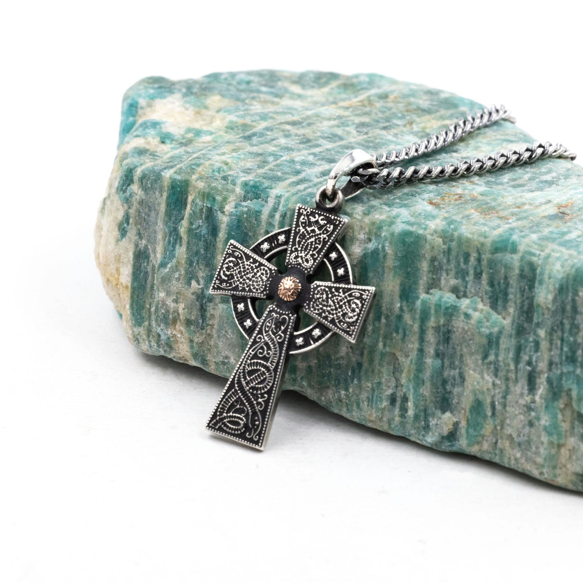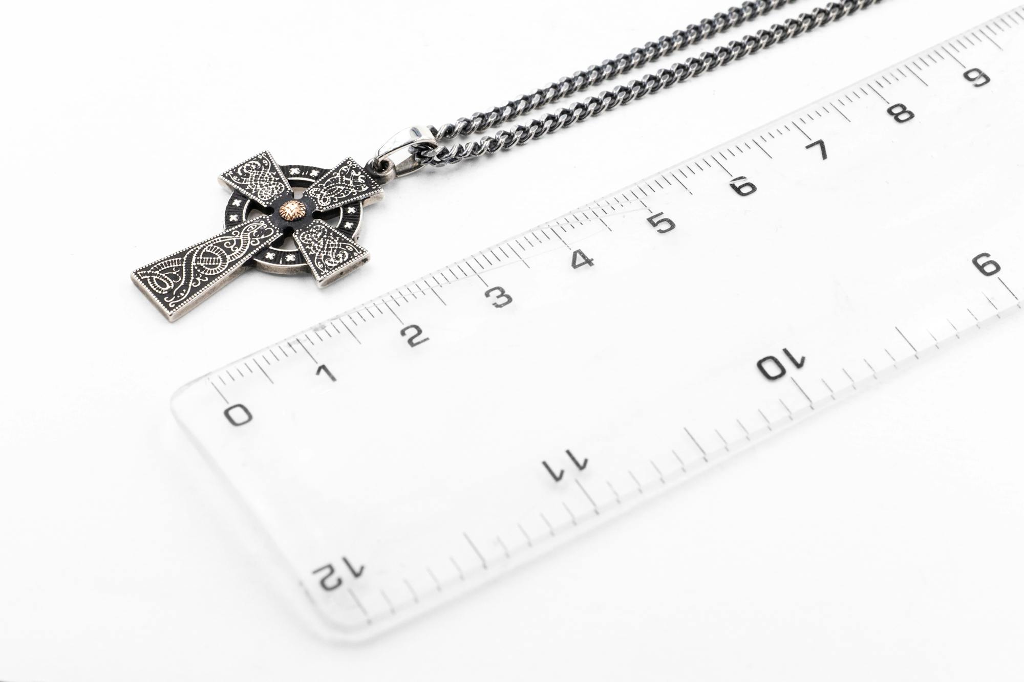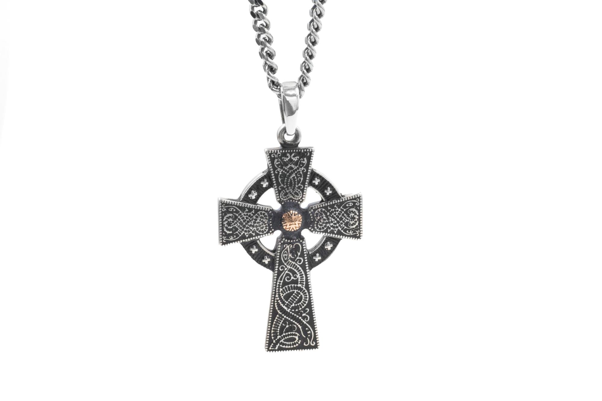 A rose gold boss at the centre of the cross is adorned with a 'shield decoration' inspired by the armour of our ancient ancestors. The intricate Celtic pattern throughout are picked out by the oxidised finish to the sterling silver, giving this cross an old world feel. A distinctive and stylish cross with exquisite attention to detail.
