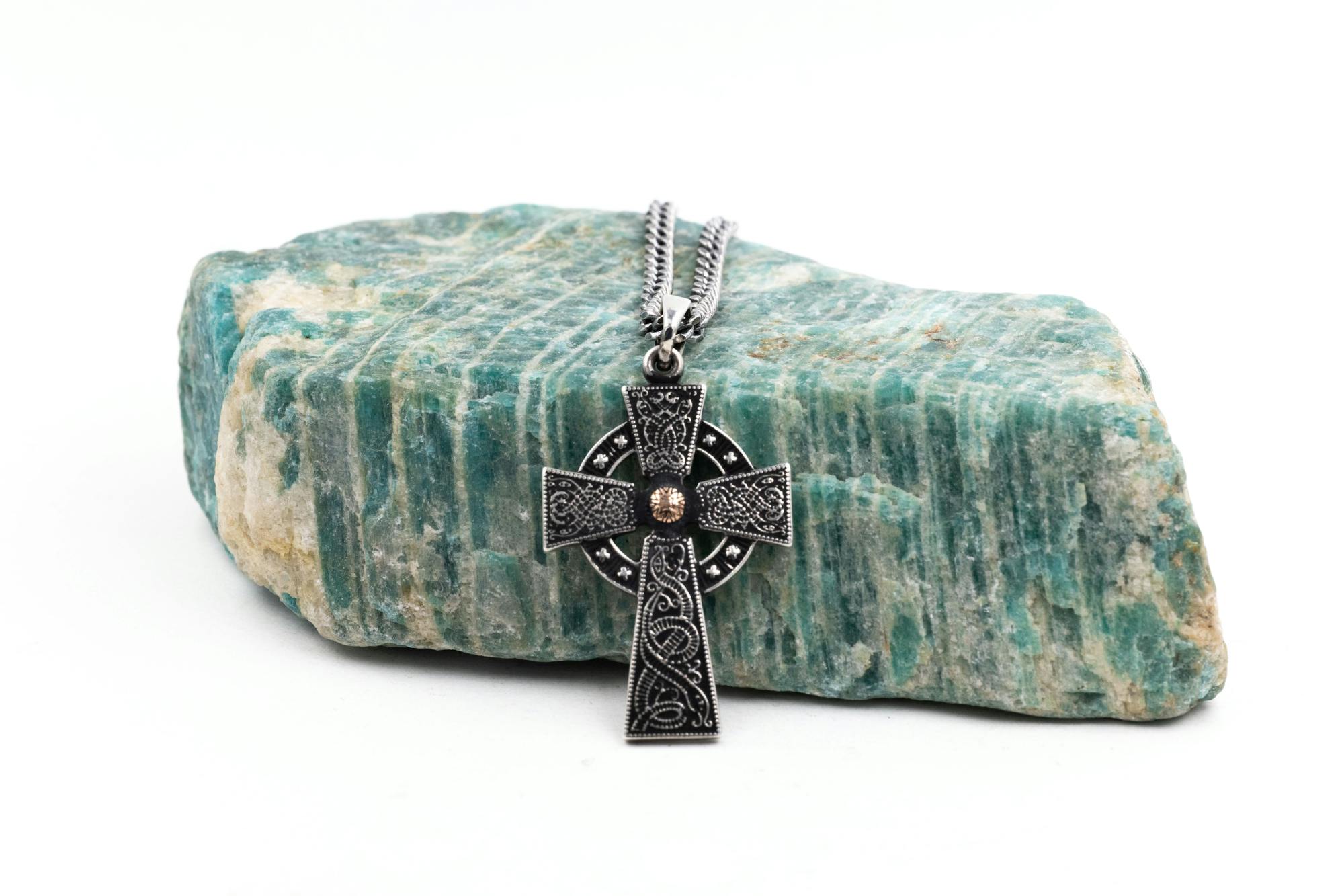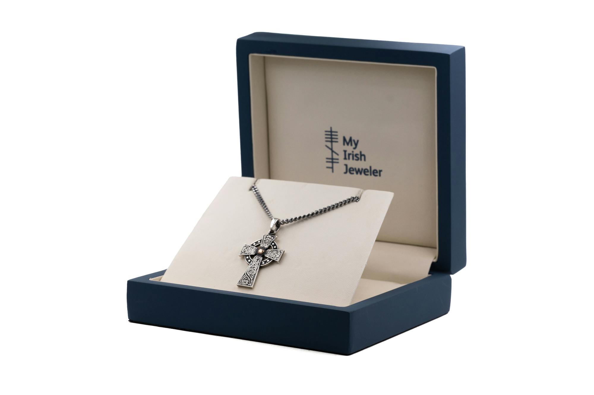 The marvellous and intricate design of this Celtic Cross is inspired by the a famous Irish treasure, the Ardagh Chalice, found in Lough Gur Co Limerick in 1868.