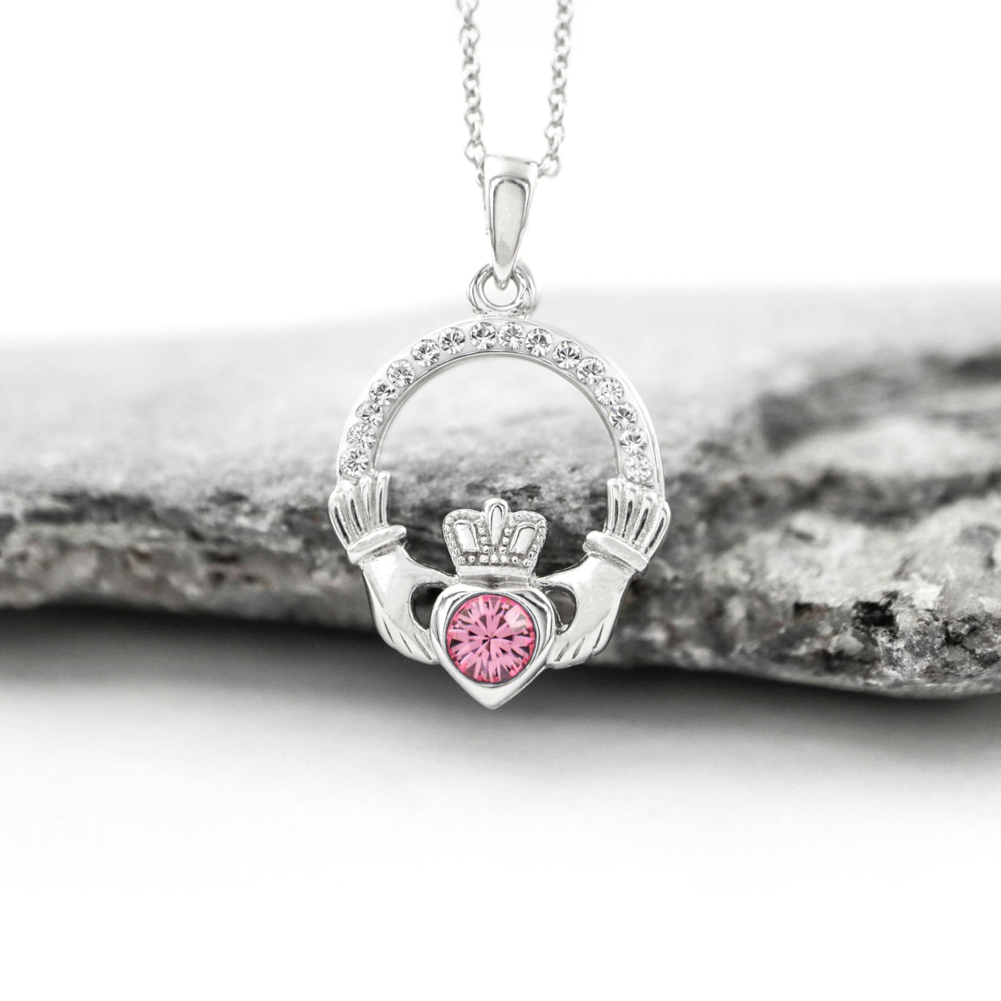 A stunning sterling silver Claddagh necklace set with crystals and the birthstone of your choice