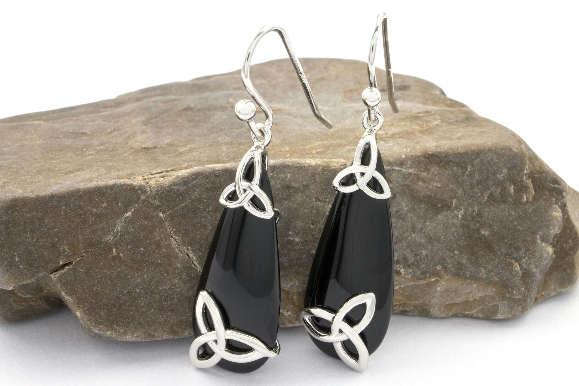 These Trinity Knot earrings are sure to turn heads. The two sterling silver Trinity Knots on each earring look striking silhouetted against the deep black of onyx stone teardrops.