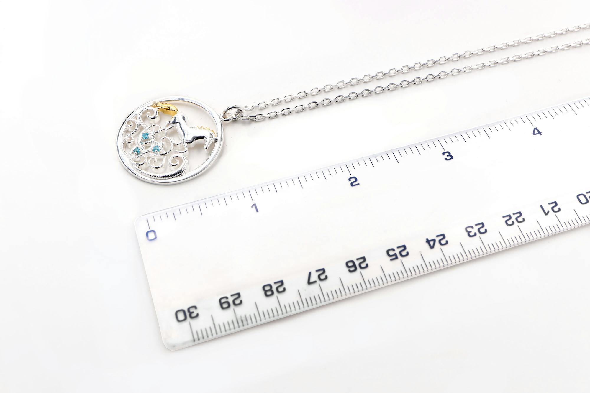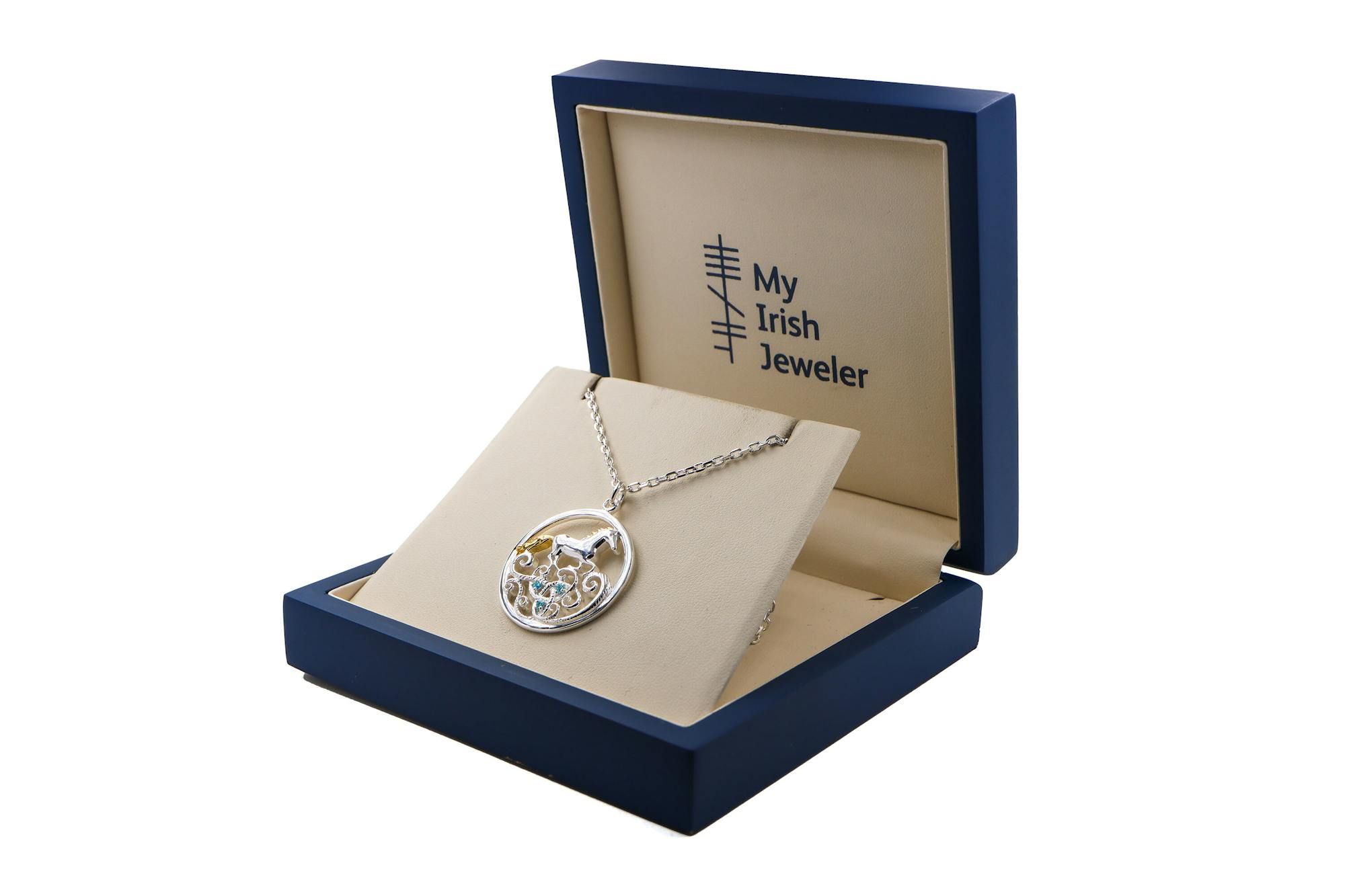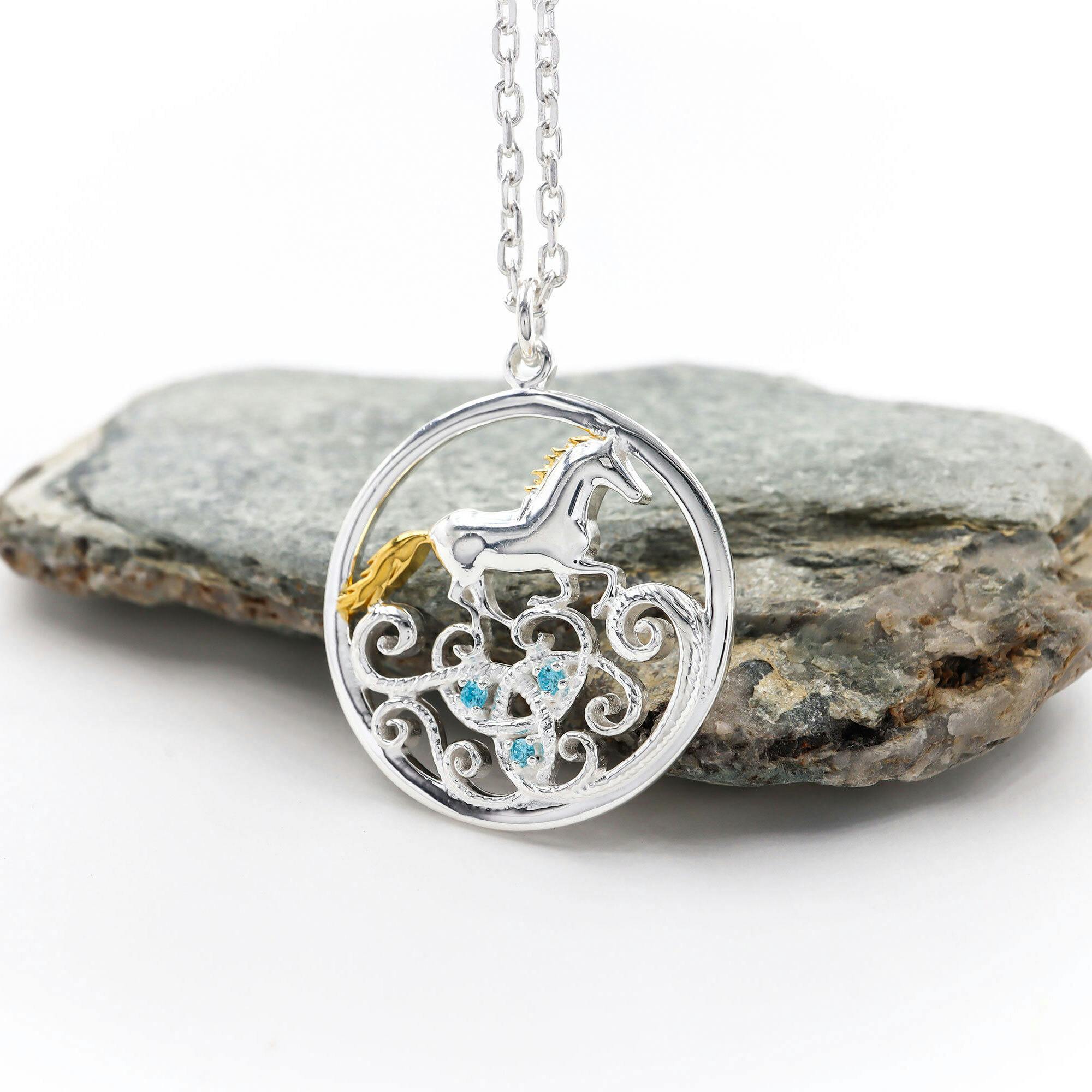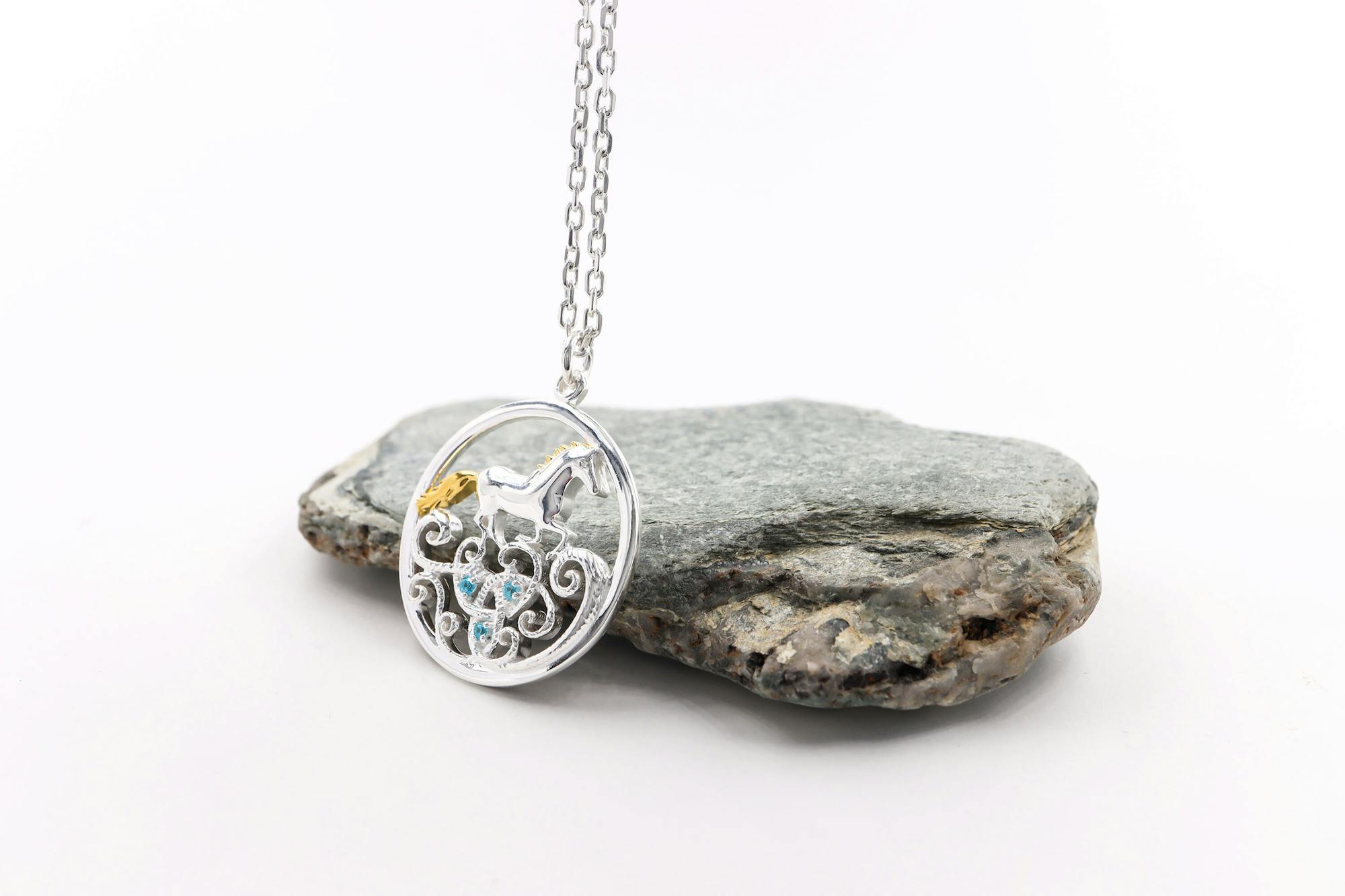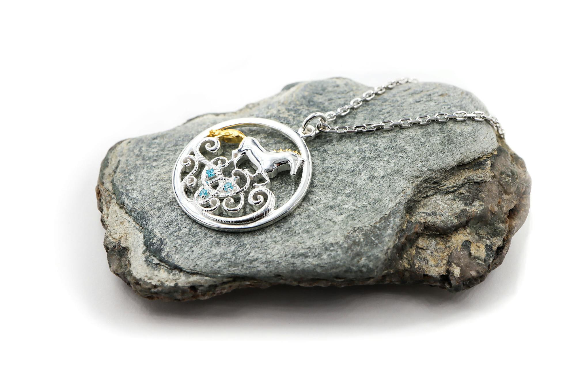 This sterling silver necklace set with stunning blue stones is inspired by the Legend of Tir Na N'Og. Enbarr of Manannan is the magical silver horse that dances across the waves to the mythical land of Tír na nÓg, an otherworldly island of eternal youth, beauty and love.