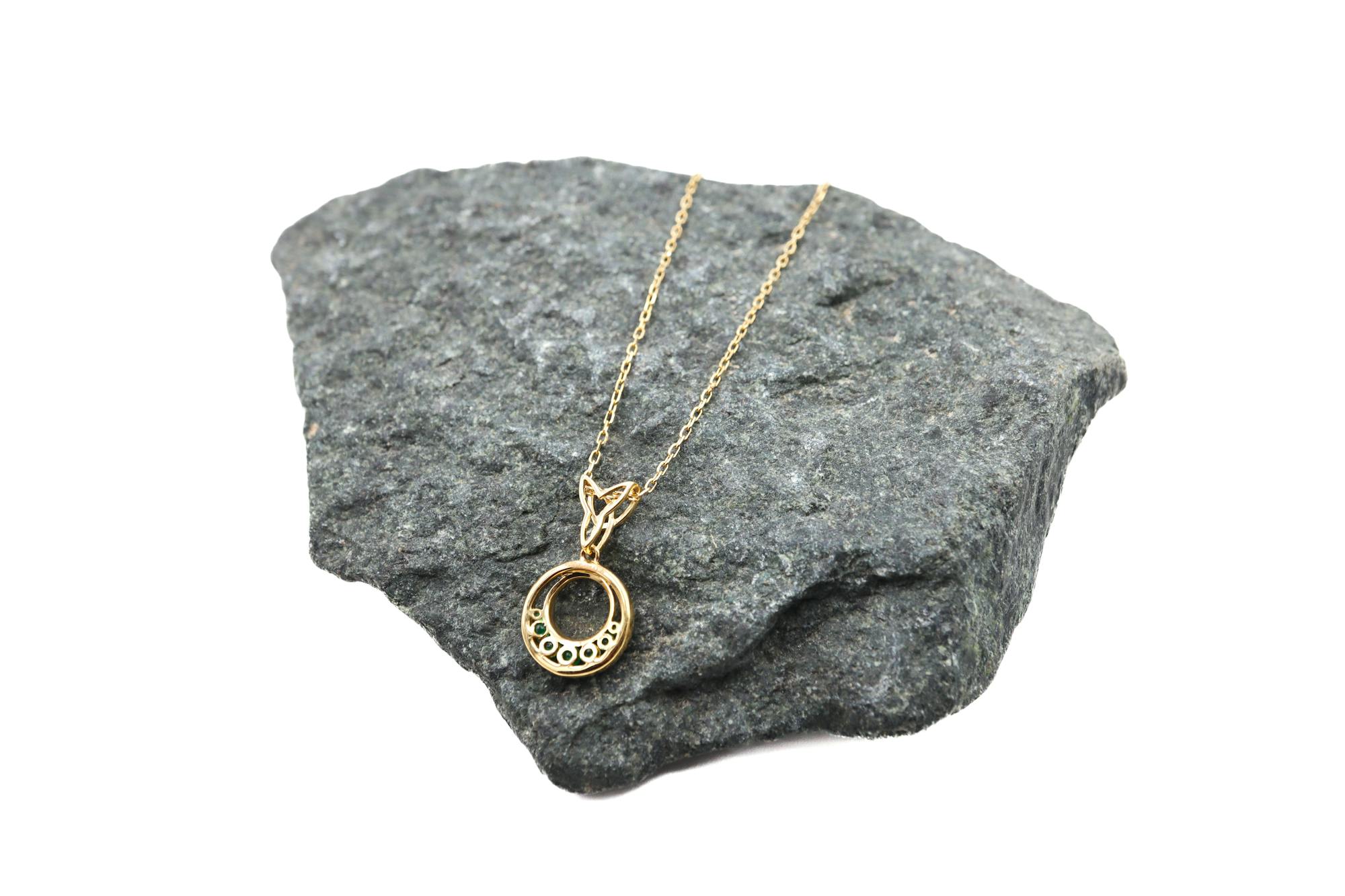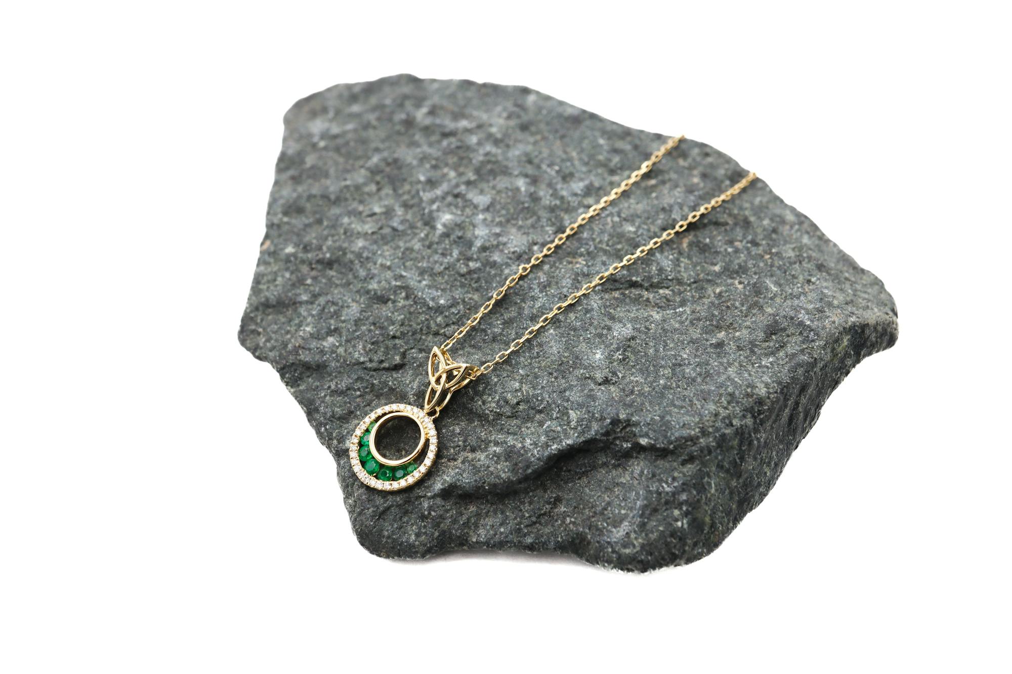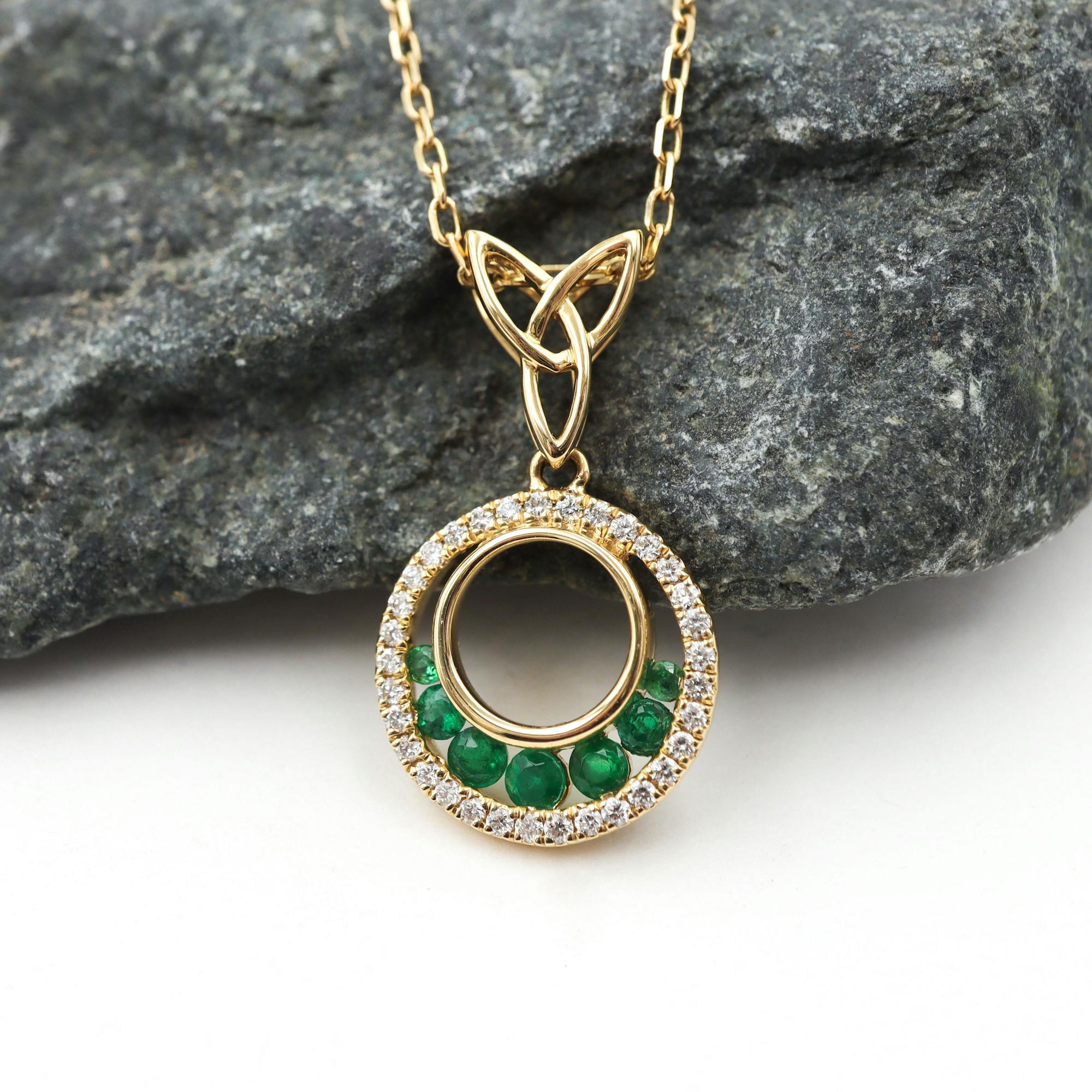 An airy three leaved trinity knot, an ancient symbol representing eternity and eternal love, forms an ingenious hidden bale. Dangling from the tip of this Celtic Love not, a halo of sparkling natural diamonds holds 7 vivid natural emeralds perfectly framed by an inner circle of warm yellow gold.