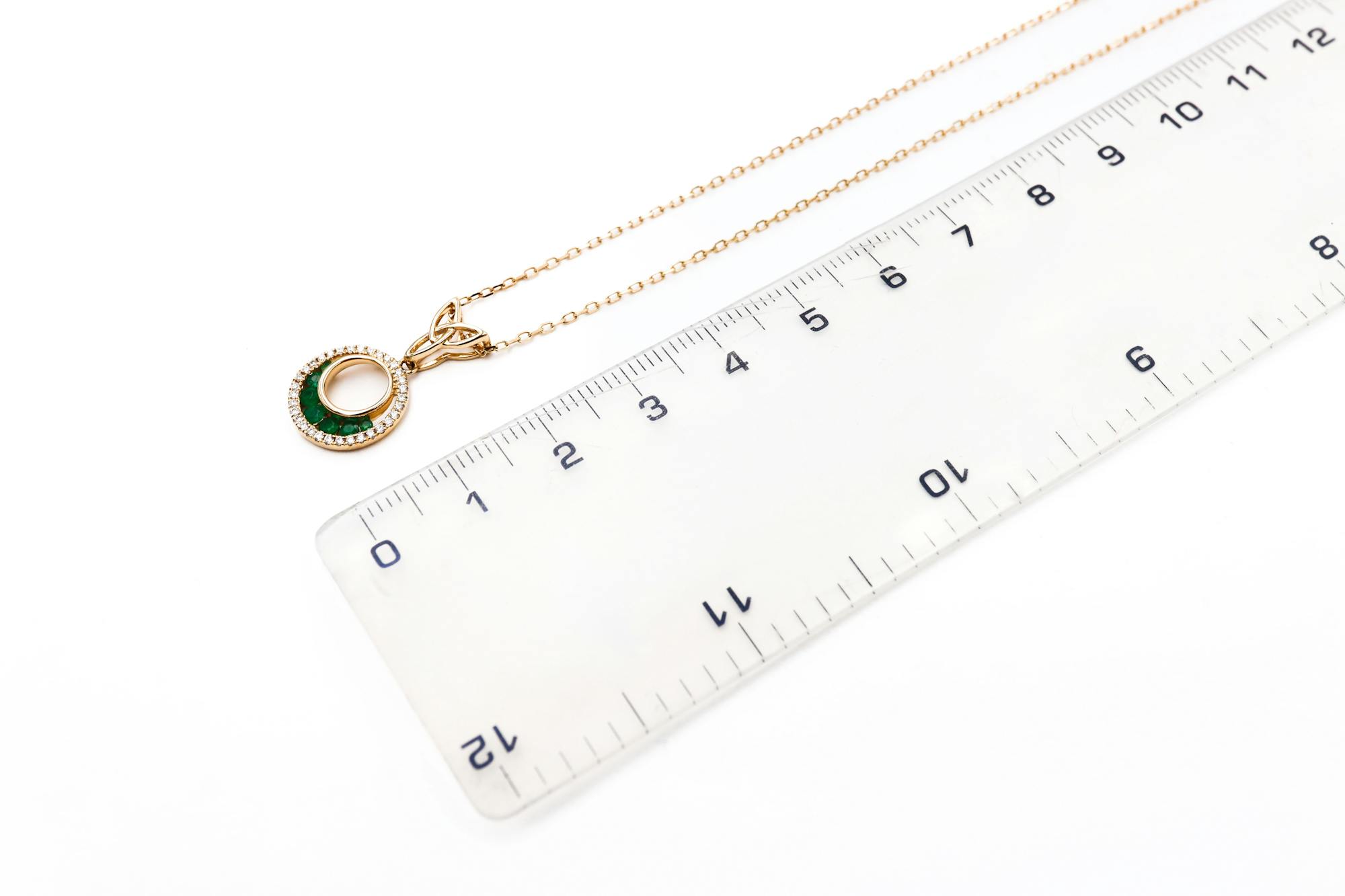 The necklace is made with 0.12 tcw of natural diamond (G/H SI) and 0.21 tcw of vibrant natural emerald of the highest colour quality. A 14K gold 18" inch chain is included which can be shortened 17" or 16" inches as desired. If you prefer a longer or chunkier chain please choose from the handpicked selection that pair perfectly with this special bale.