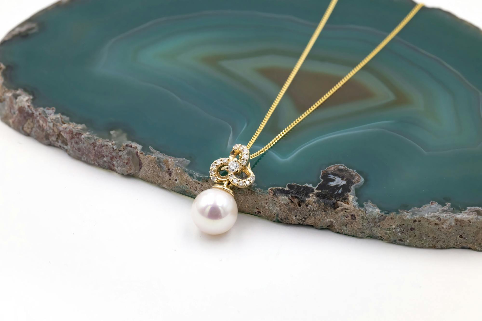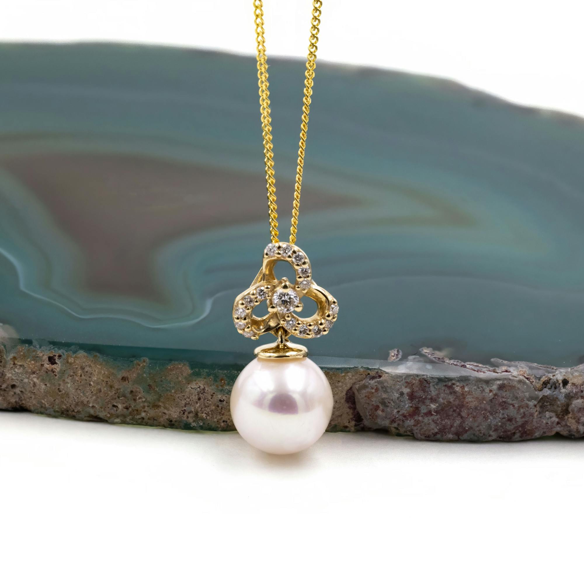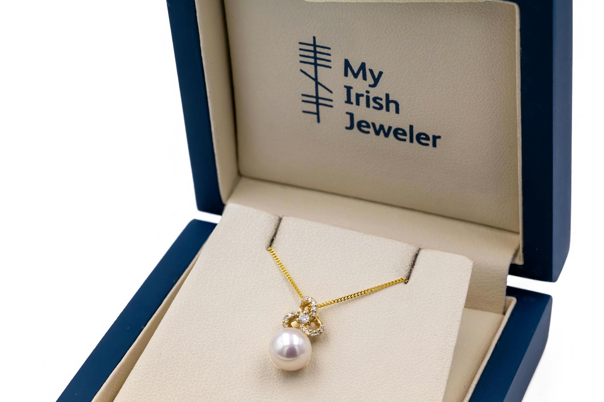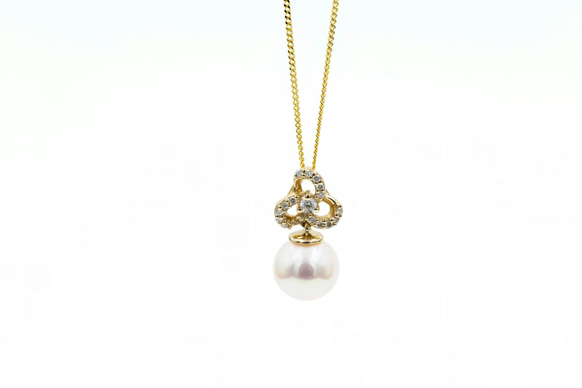 A stunning freshwater pearl is suspended from an elegant 9K yellow gold Trinity knot set with diamonds. With a round diamond at it's centre this necklace combines symbolism and subtle sparkle for timeless elegance.