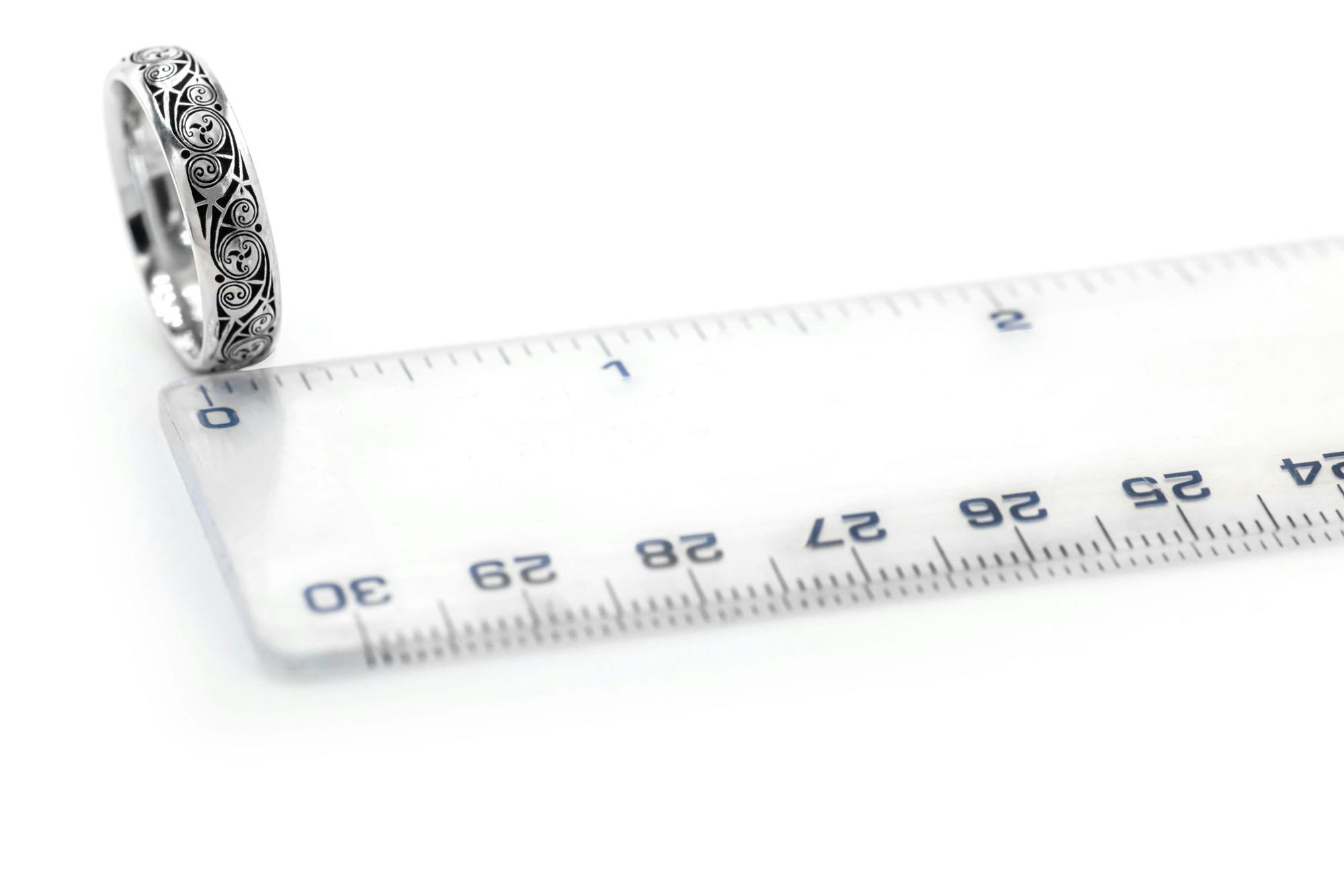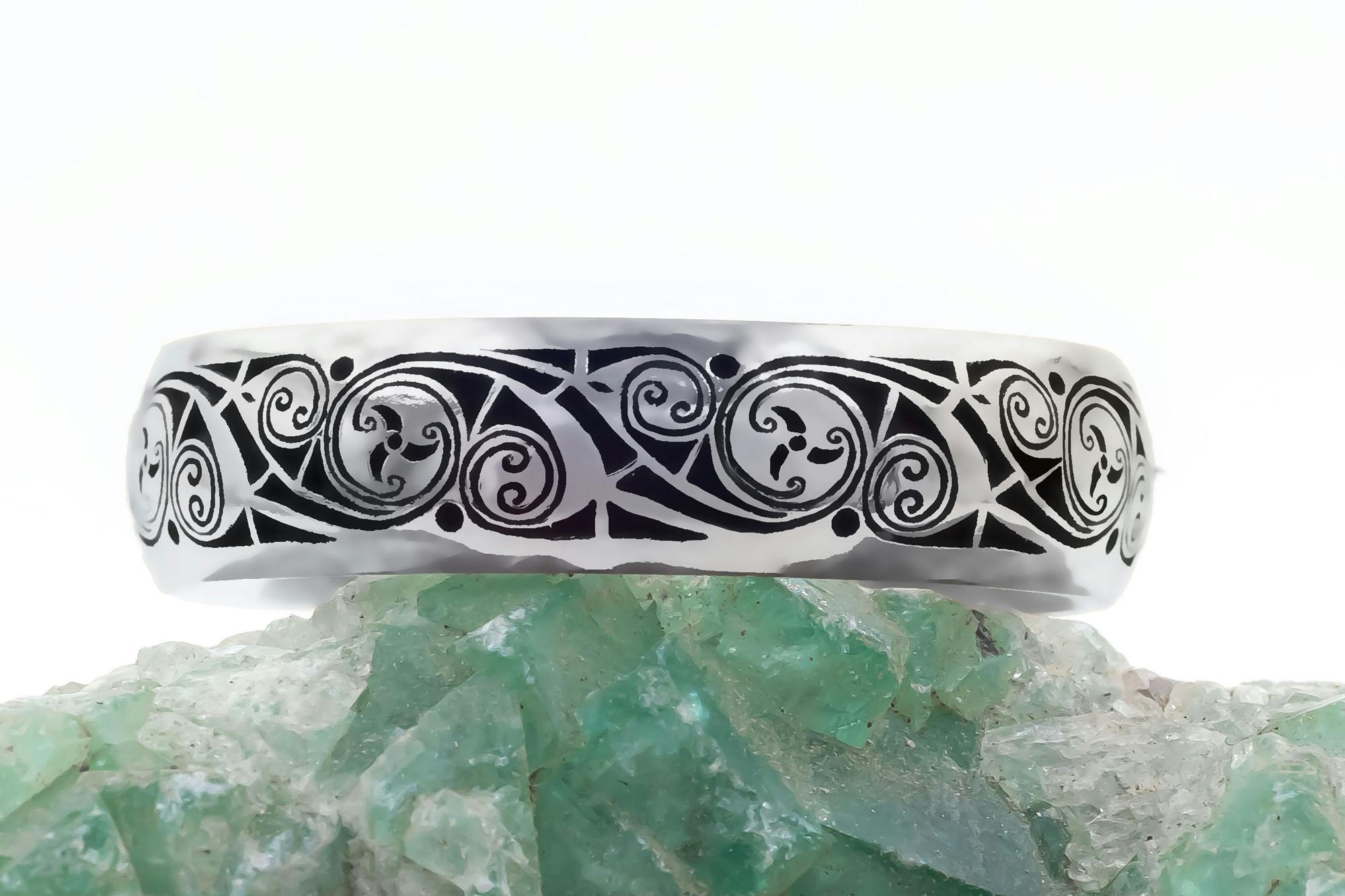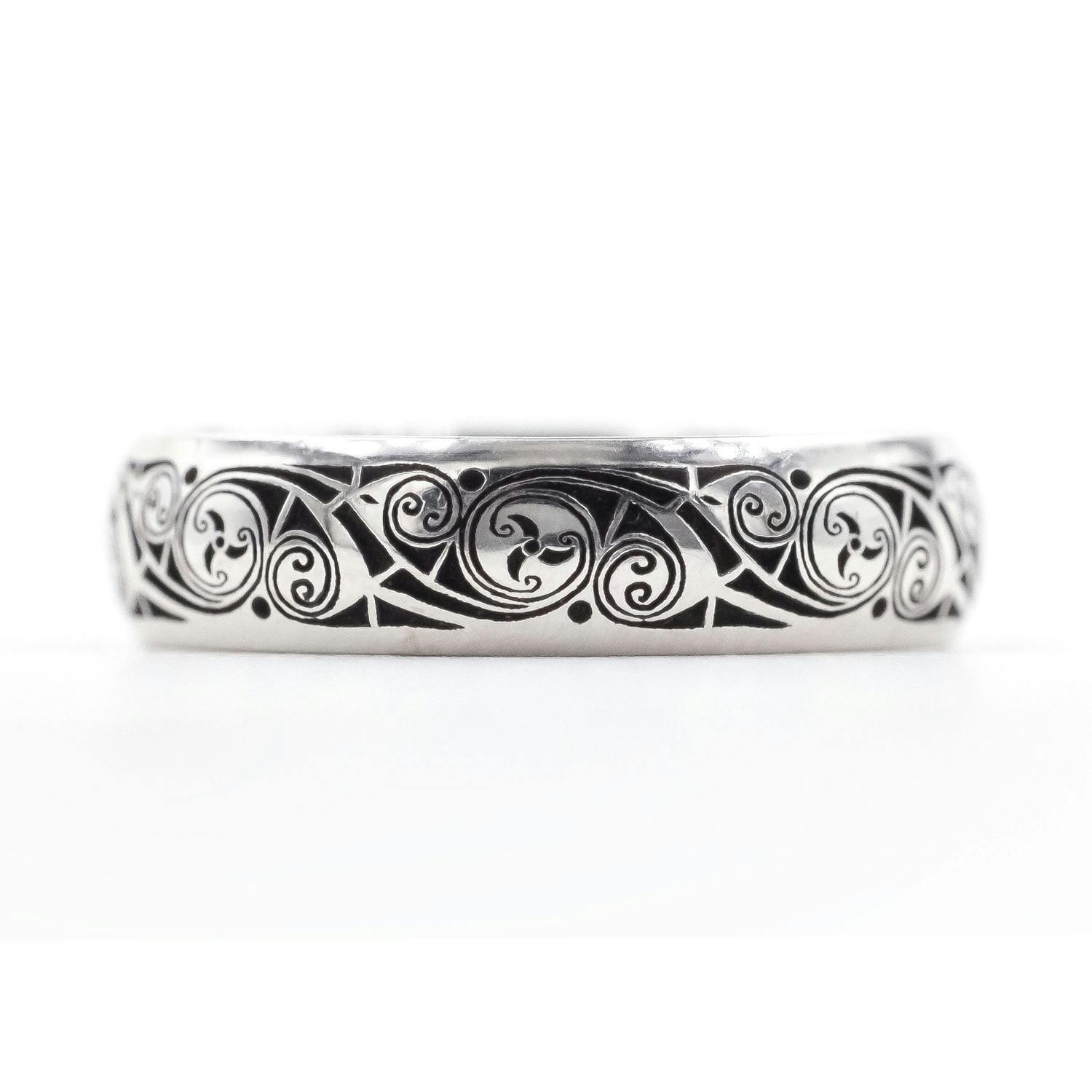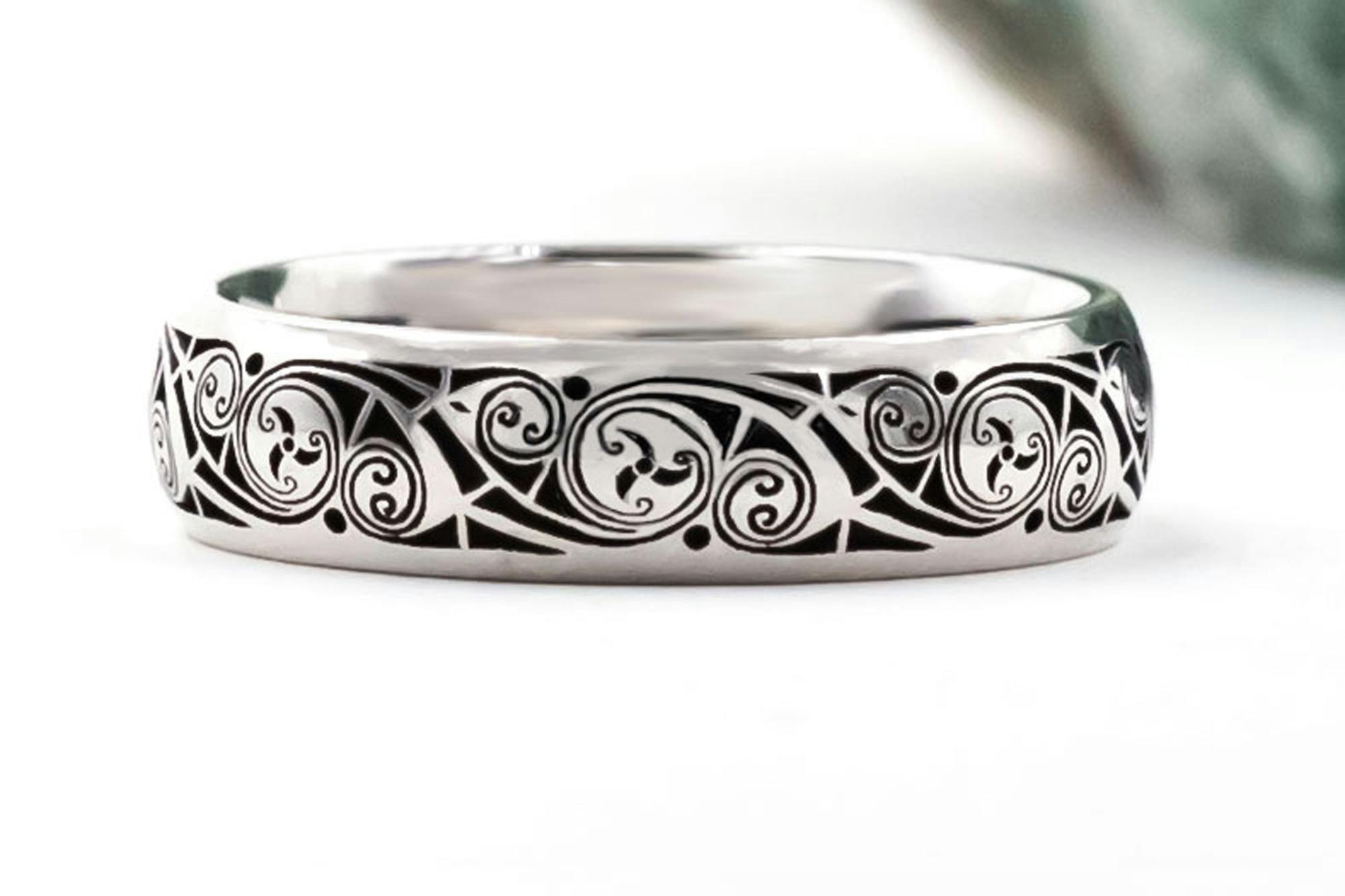 These premium quality rings are made to order in your choice of precious metal. The wider bands allow the exquisite detailing on these rings to shine. Celtic La Tené design flourishes flow around the entire band - picked out with a black cerin enamel finish.