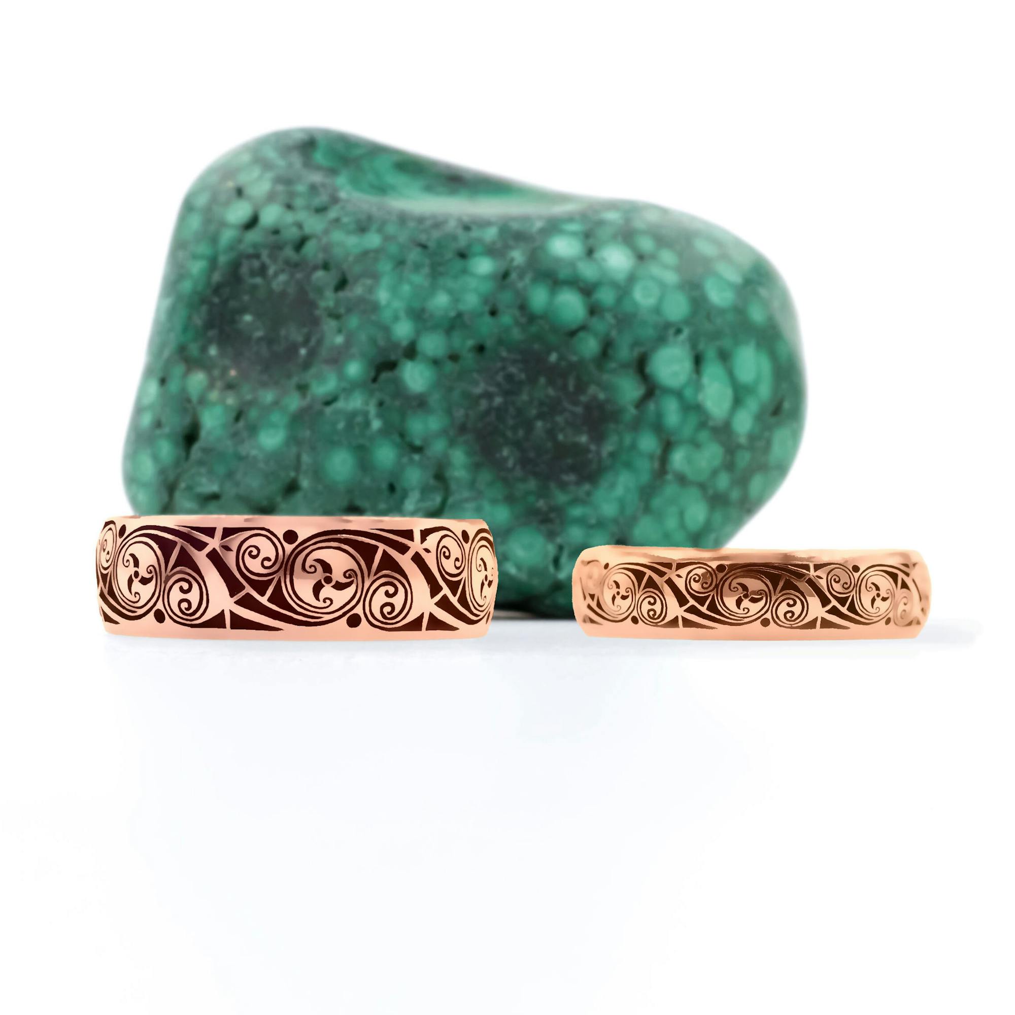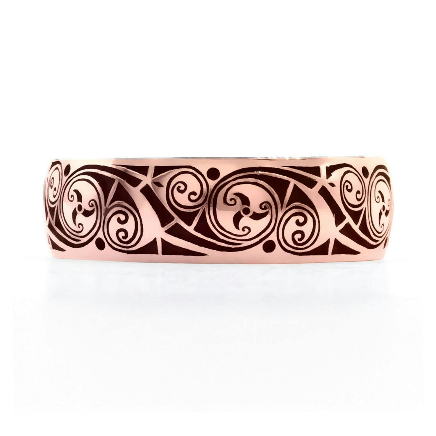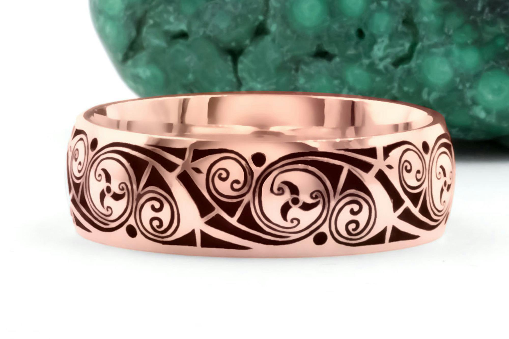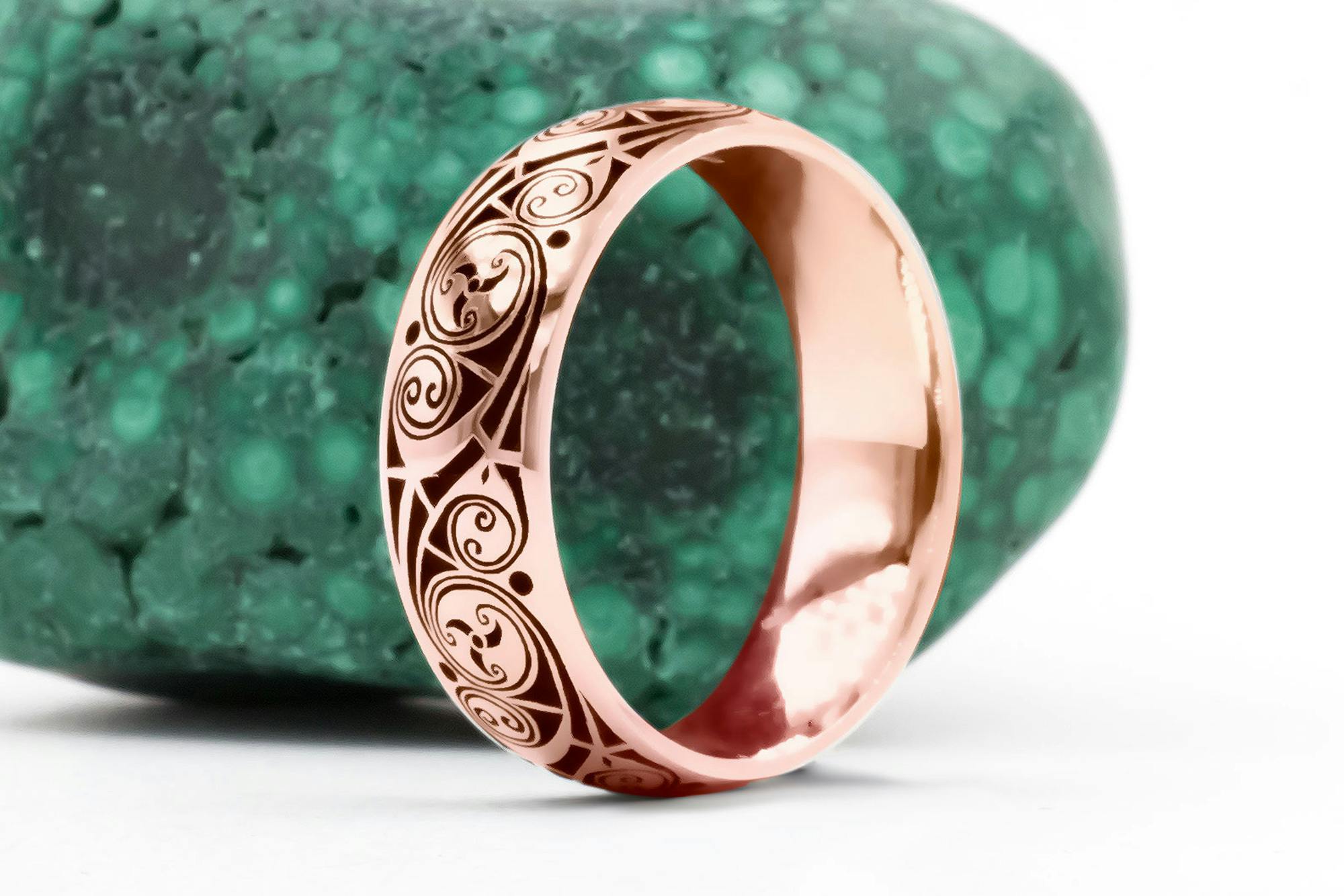 These premium quality rings are made to order in your choice of precious metal. The wider bands allow the exquisite detailing on these rings to shine. Celtic La Tené design flourishes flow around the entire band - picked out with a black cerin enamel finish.
