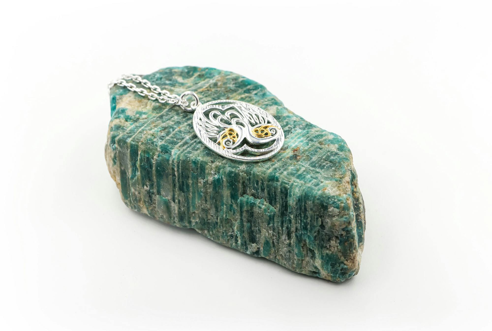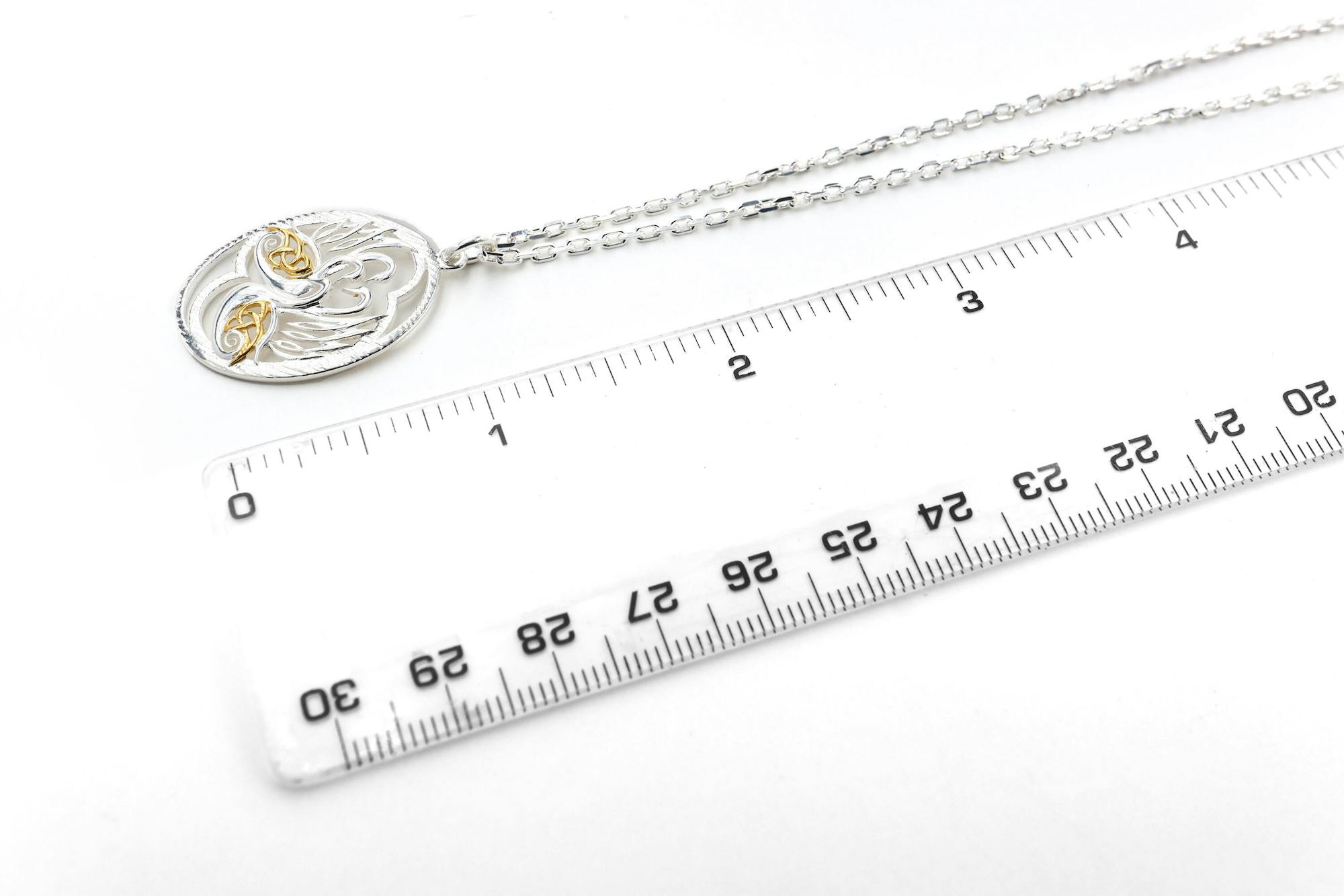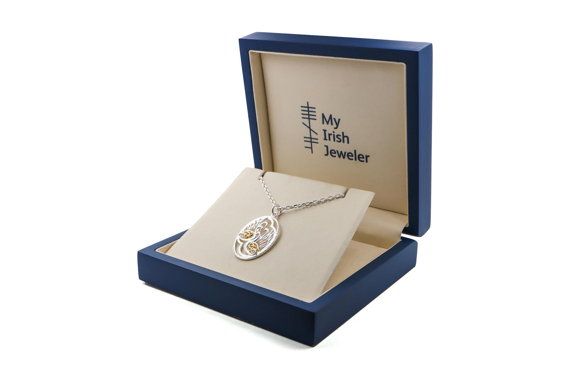 A beautiful sterling silver necklace, inspired by an old Irish story of enduring love, family, and fidelity. The four intricate and beautifully detailed swans are the focus of this design with gold-plated trinity knots capturing the warm and enduring love of family. Framed in polished sterling silver, this necklace captures the magic of this bittersweet tale that mixes Ireland's ancient Celtic pagan roots together with a Christian message of fidelity, love, and faith.